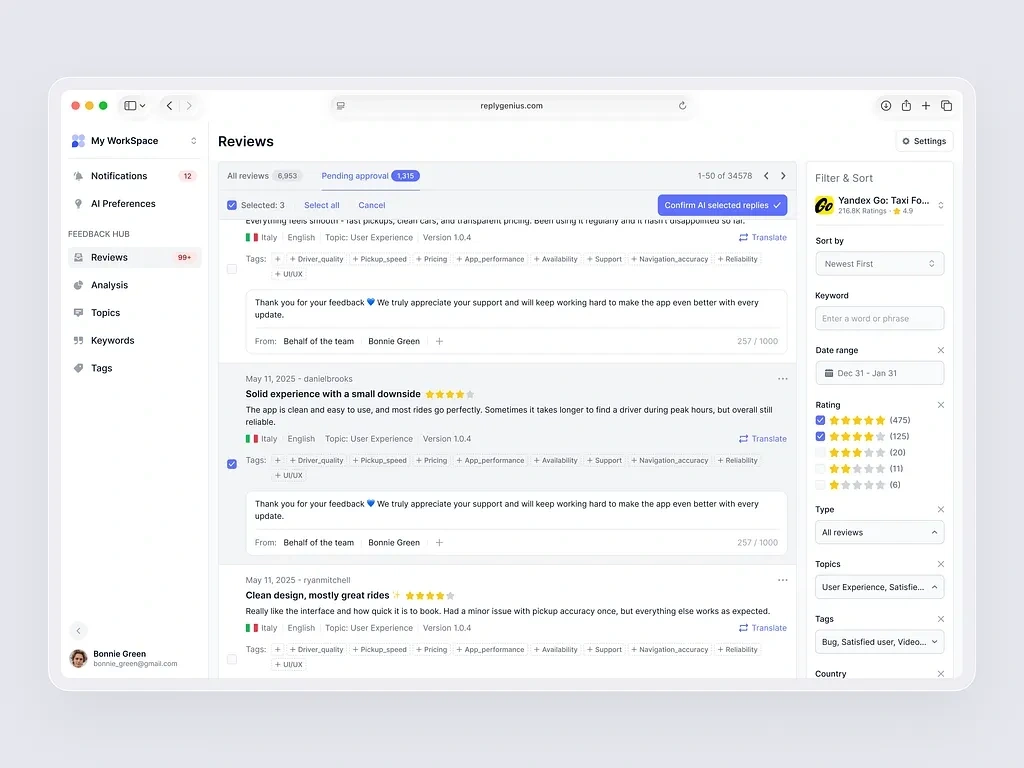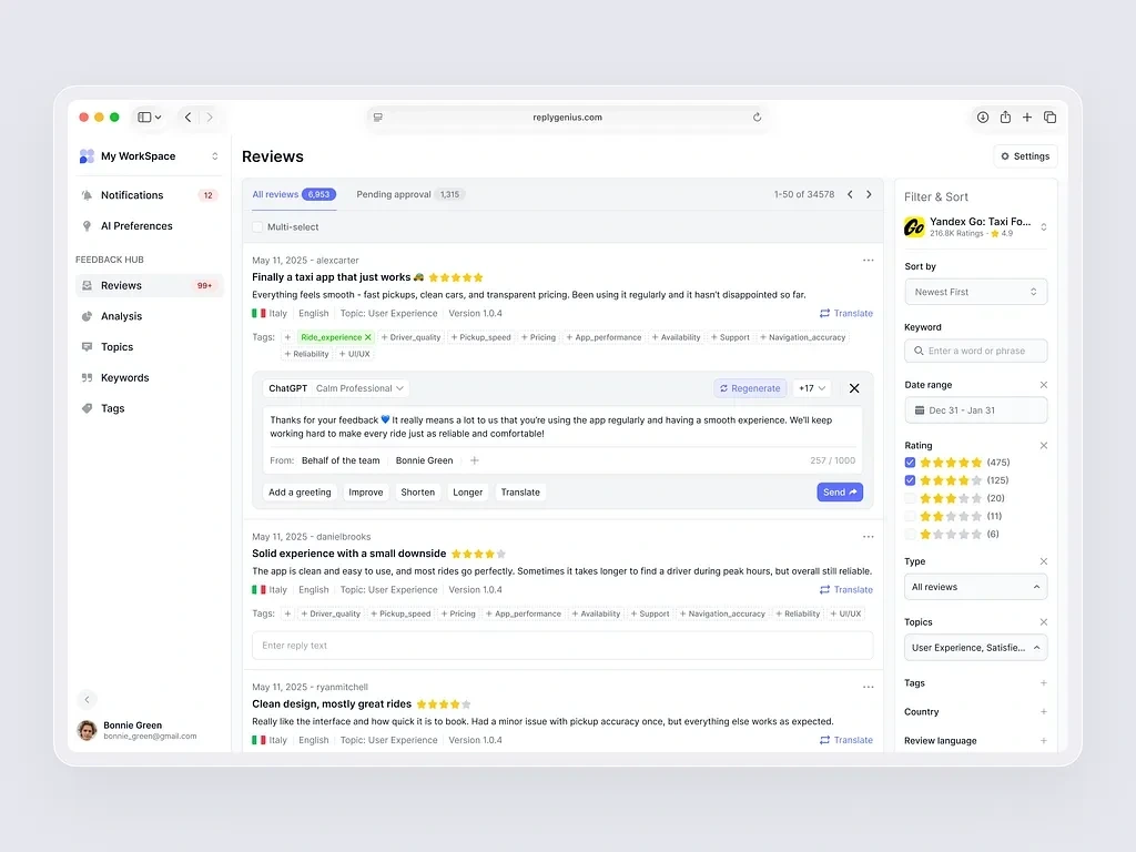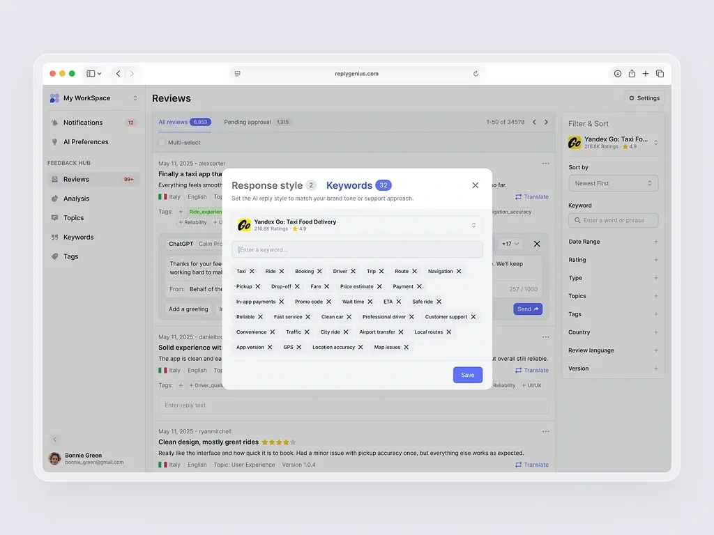 Each review includes context such as rating, translation, sentiment, and tags, enabling clear and informed replies. AI drafts responses in the selected tone and brand voice, with manual review or instant approval keeping communication efficient and fully controlled.