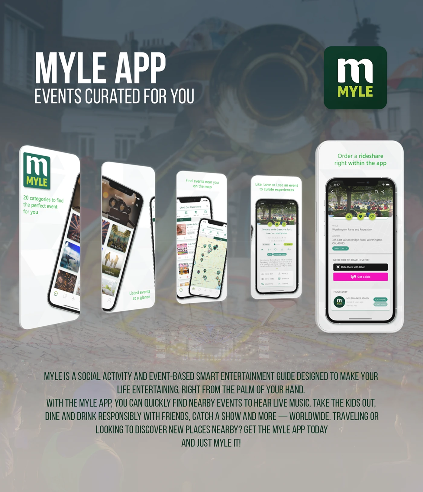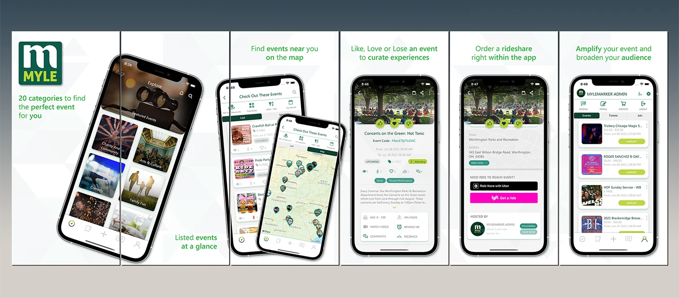 Crafted a visually compelling set of App Store screenshots for the MYLE mobile app (Make Your Life Entertaining), aimed at grabbing attention within seconds and driving installs. MYLE is an events and lifestyle discovery platform that helps users find local happenings tailored to their interests.