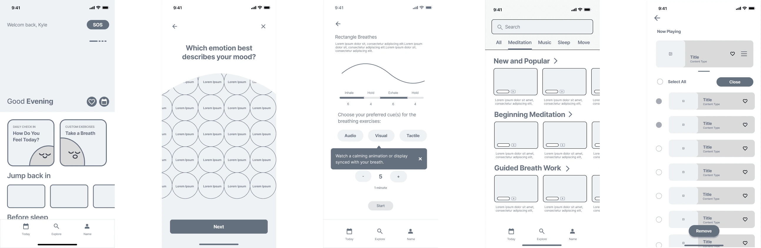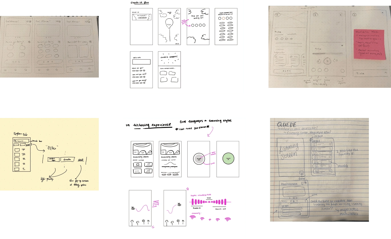 We started with sketches to generate ideas and brainstorm features of the app. We each completed sketches of our vision of the Today, Explore, and Description pages, as well as Check-in Flow, filtering, in-listening, and queueing. Here are a few of those sketches!