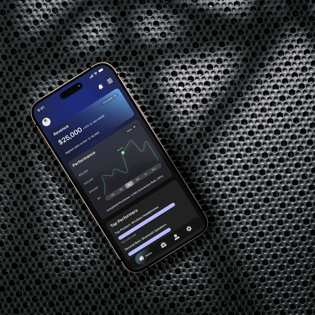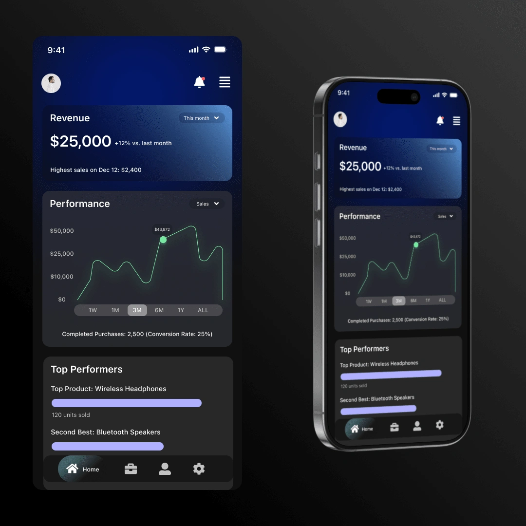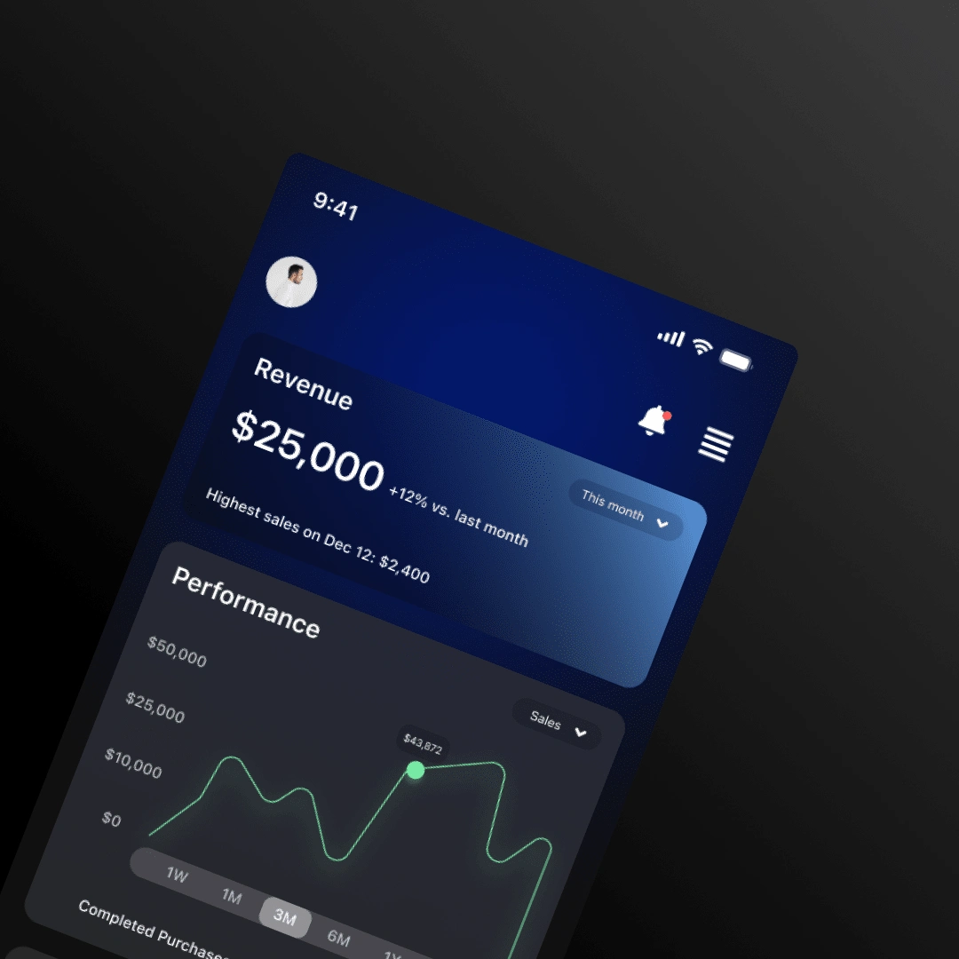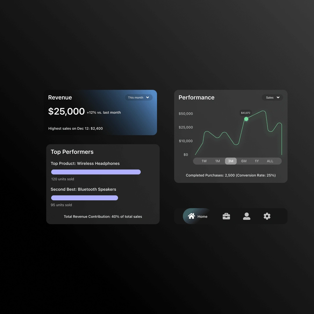 Finance dashboard UI with real-time revenue tracking, performance insights, and sales analysis. Dark theme, smooth gradients, and intuitive data visualization.
