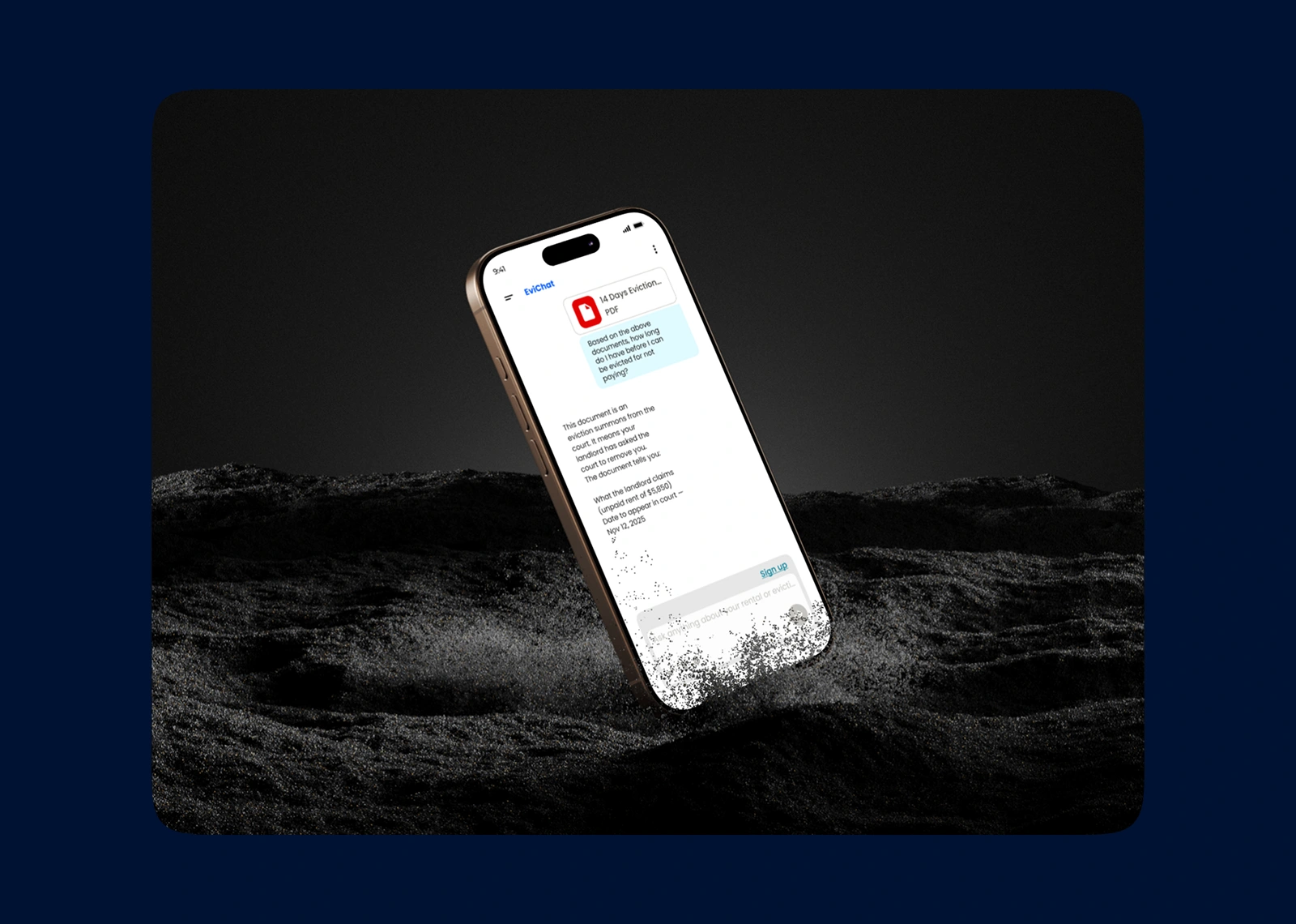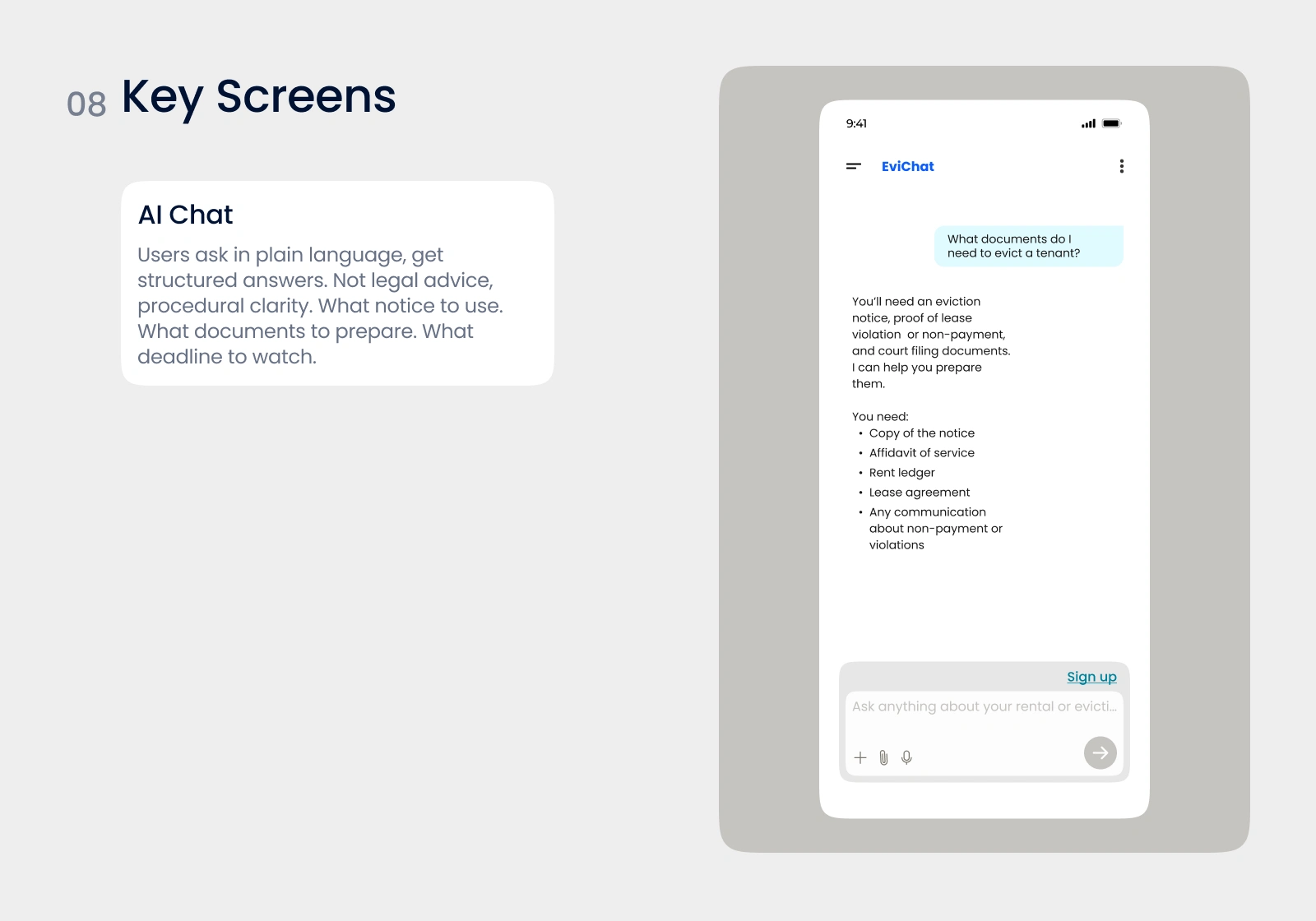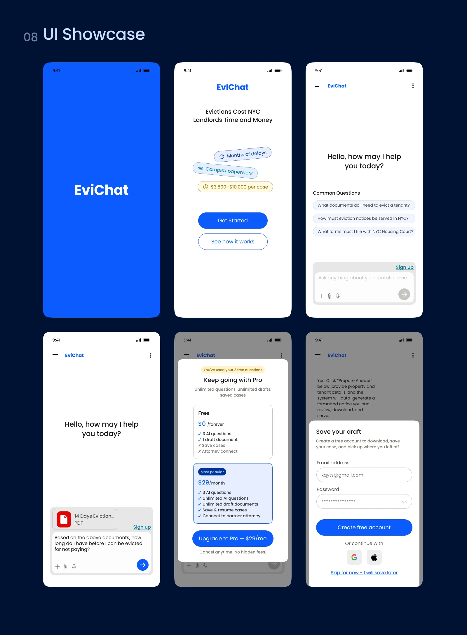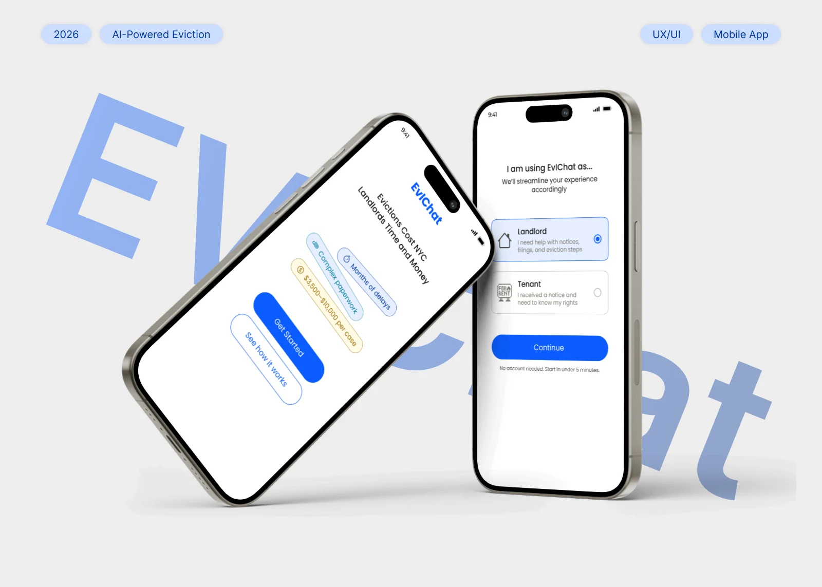 EviChat is a mobile AI assistant that helps NYC landlords and tenants navigate the eviction process without expensive attorneys. I led the end-to-end product design - from research and user flows to a full mobile UI - for an investor demo. The product uses conversational AI to guide users through legal procedures, generate draft documents, and understand their rights at a fraction of the cost of traditional legal help.