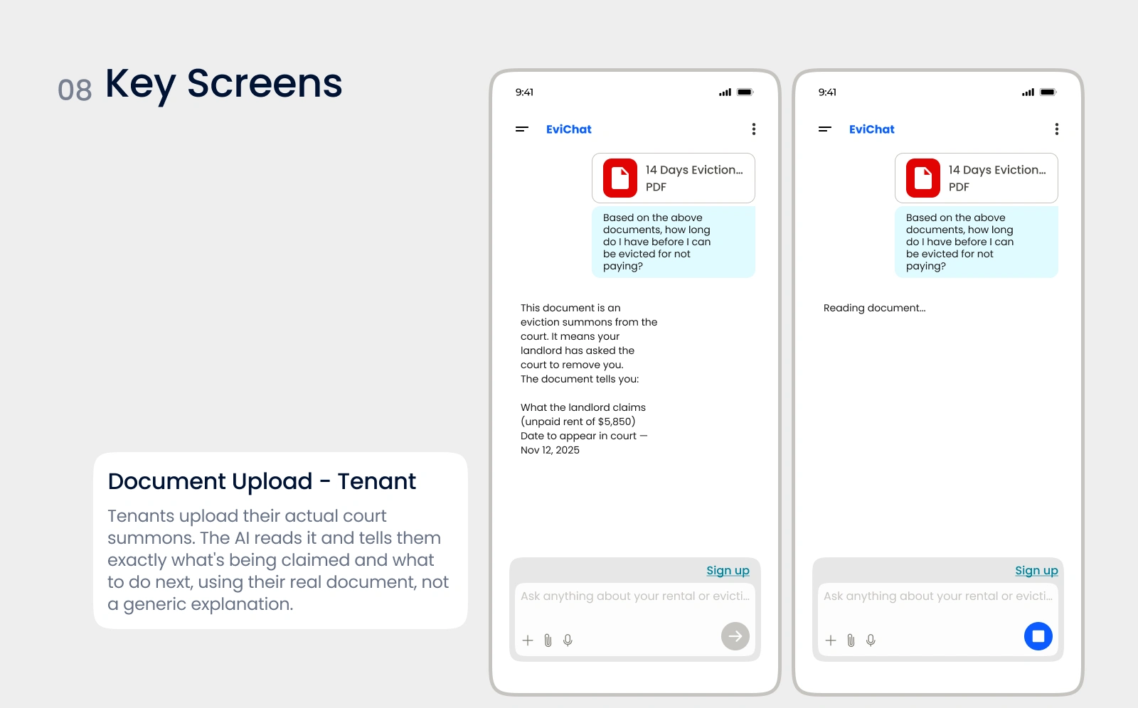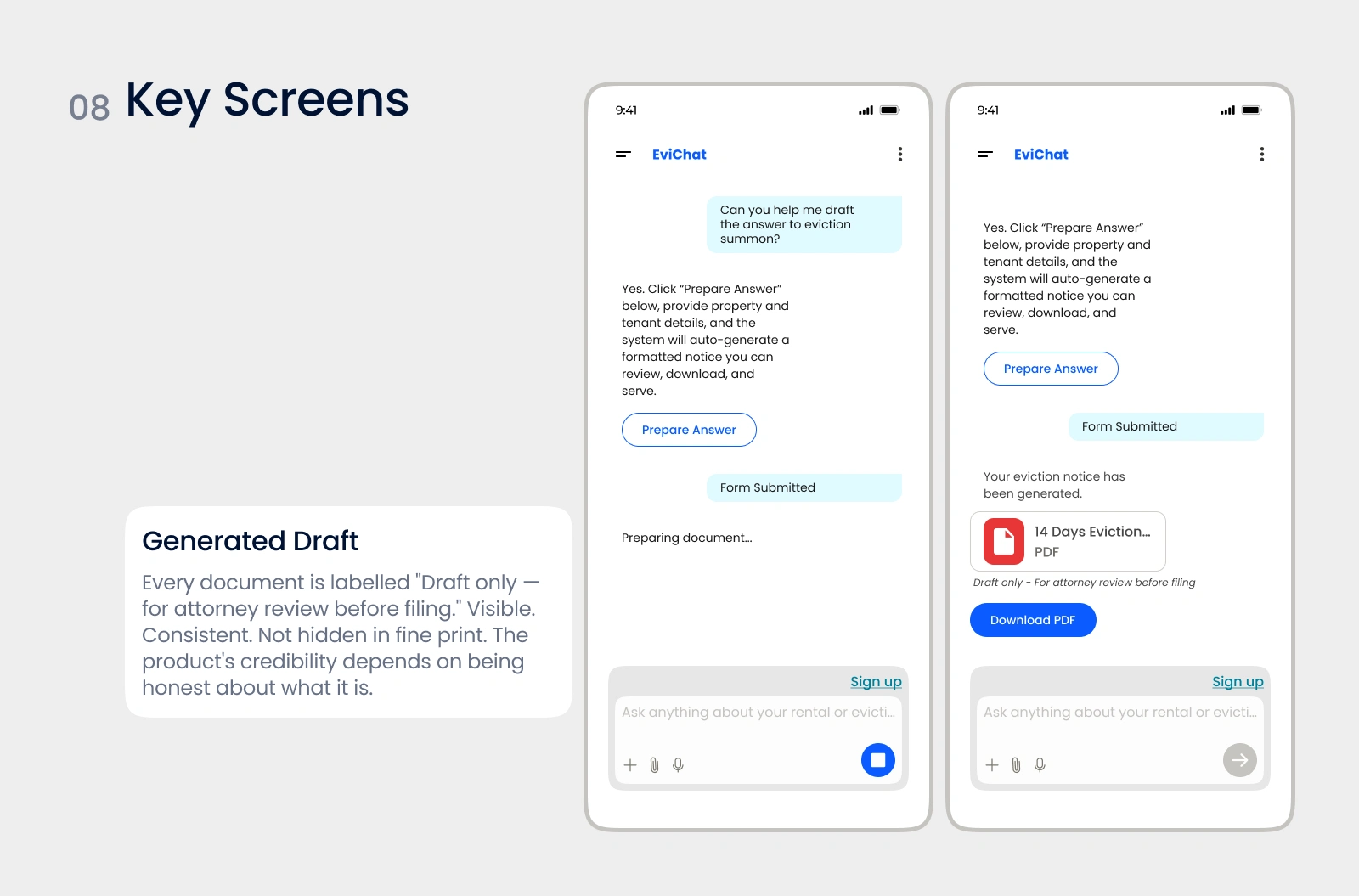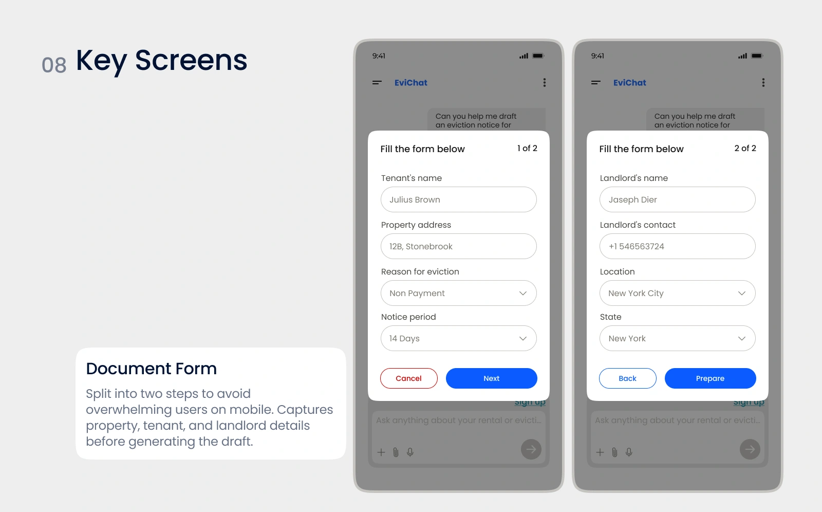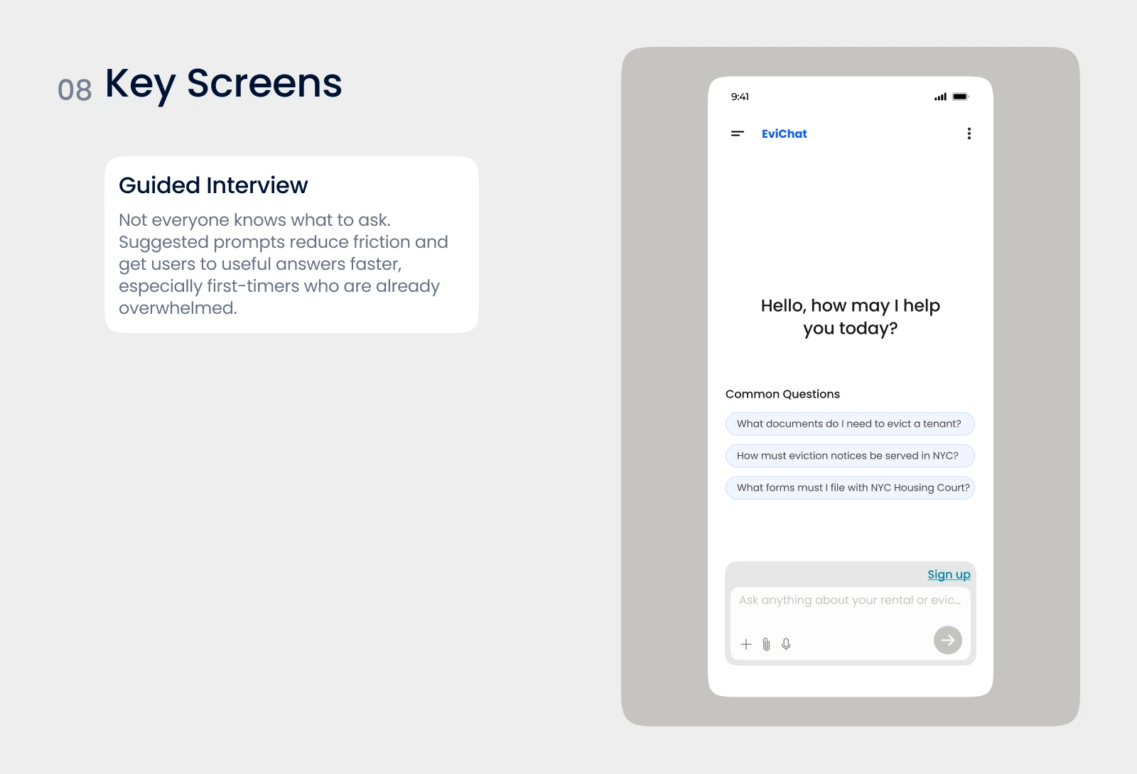 EviChat is a mobile AI assistant that helps NYC landlords and tenants navigate the eviction process without expensive attorneys. I led the end-to-end product design - from research and user flows to a full mobile UI - for an investor demo. The product uses conversational AI to guide users through legal procedures, generate draft documents, and understand their rights at a fraction of the cost of traditional legal help.