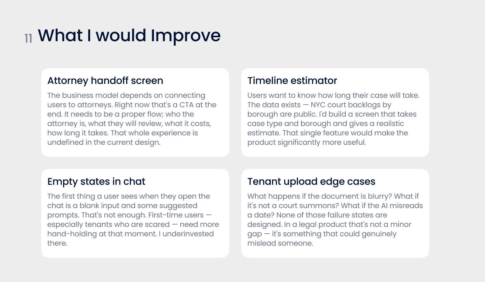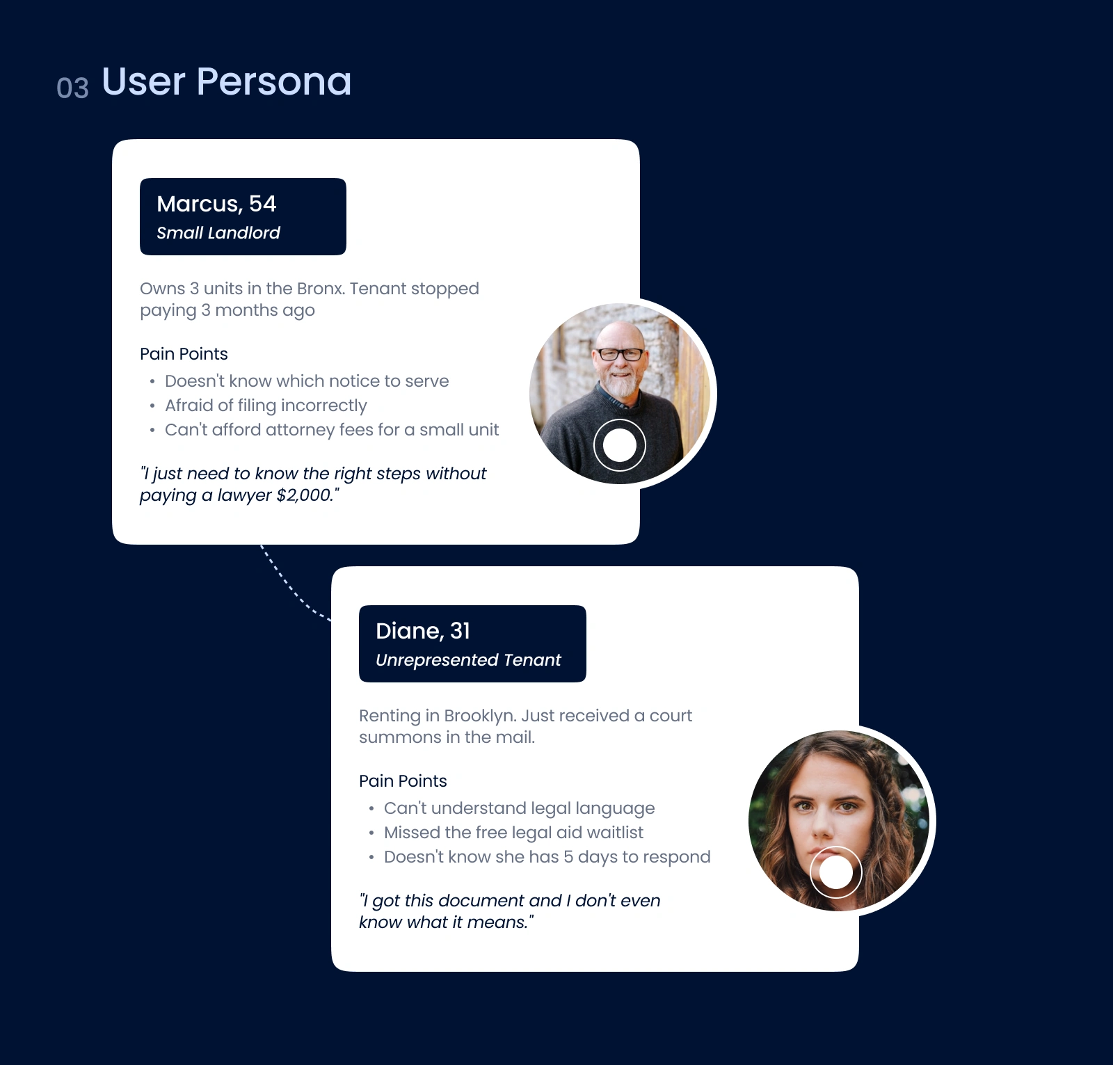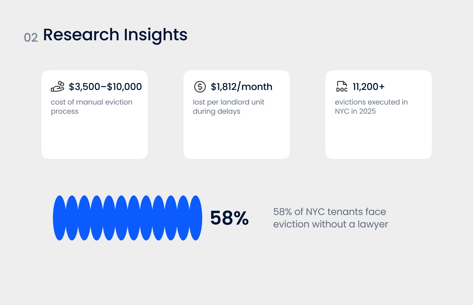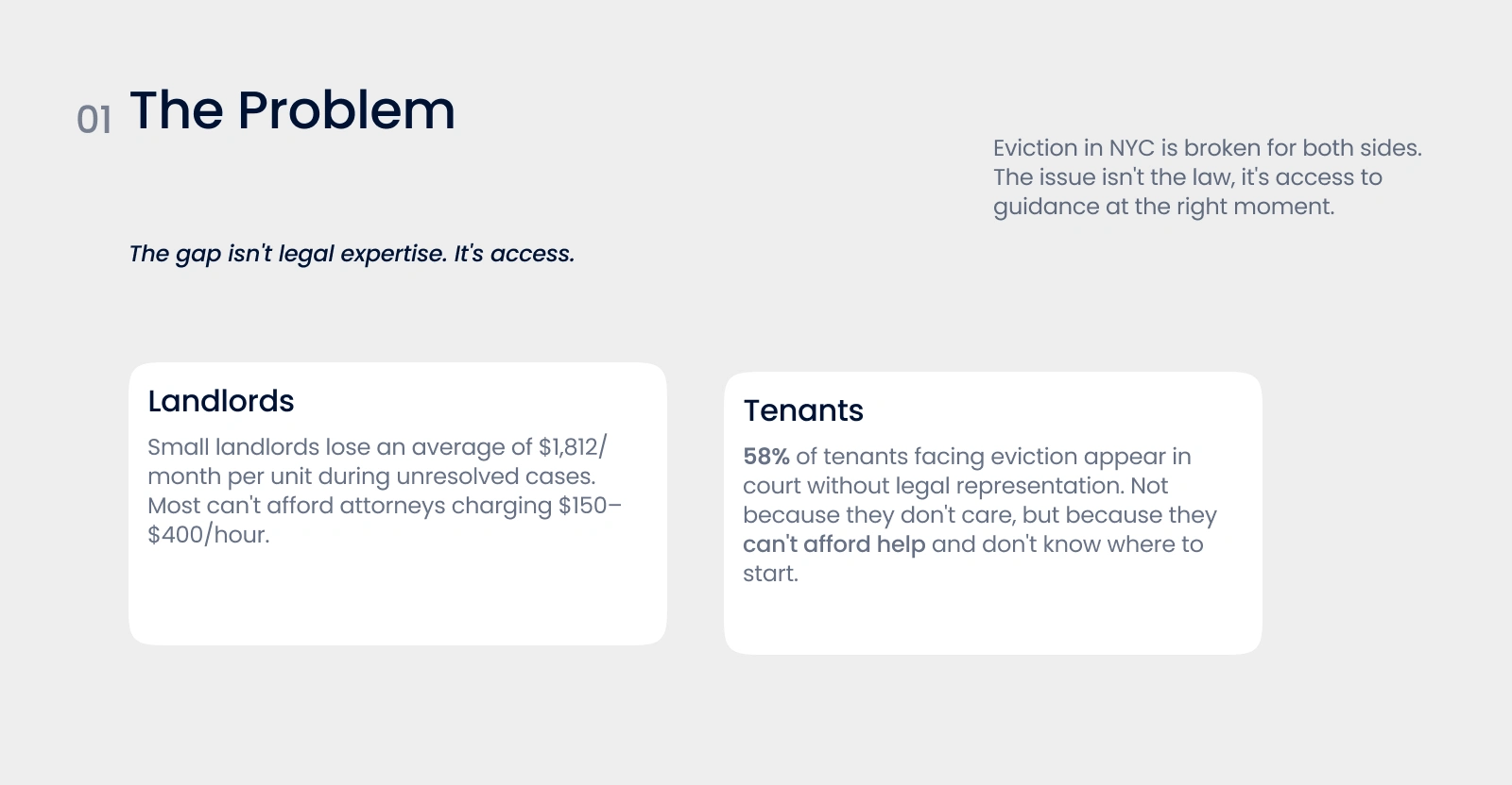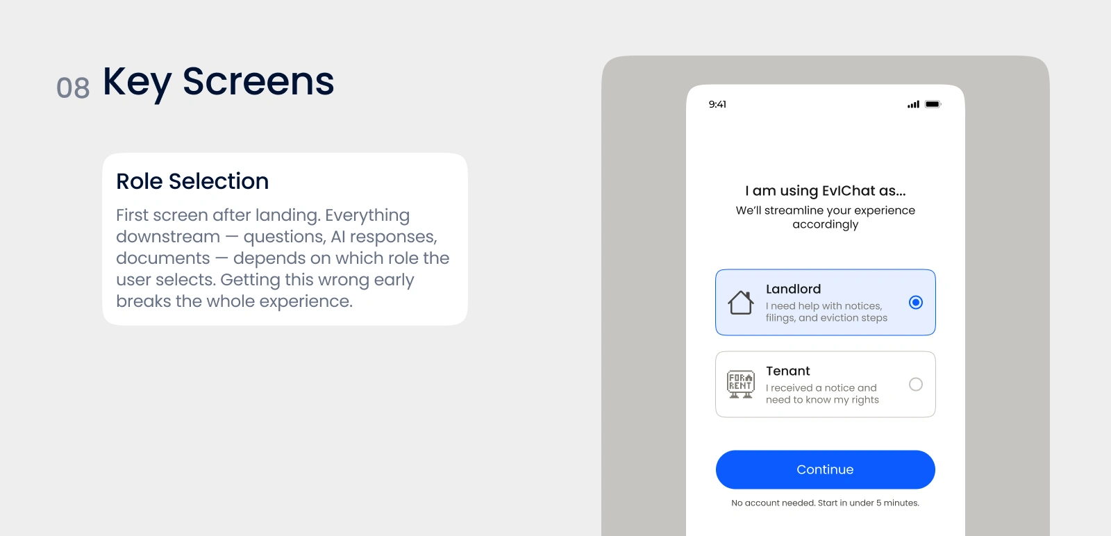 EviChat is a mobile AI assistant that helps NYC landlords and tenants navigate the eviction process without expensive attorneys. I led the end-to-end product design - from research and user flows to a full mobile UI - for an investor demo. The product uses conversational AI to guide users through legal procedures, generate draft documents, and understand their rights at a fraction of the cost of traditional legal help.