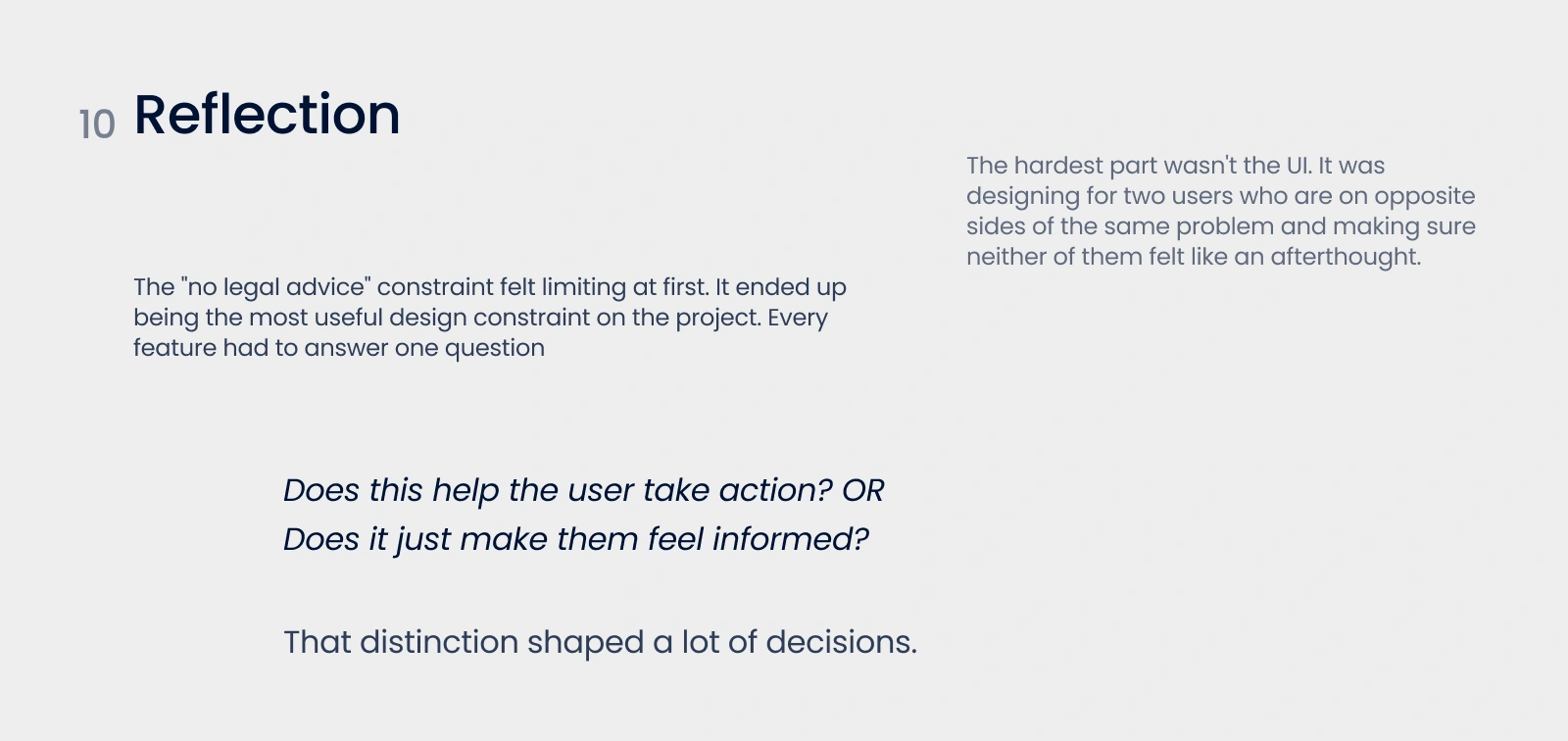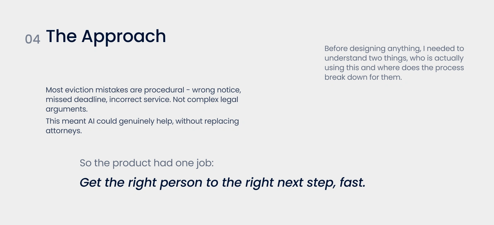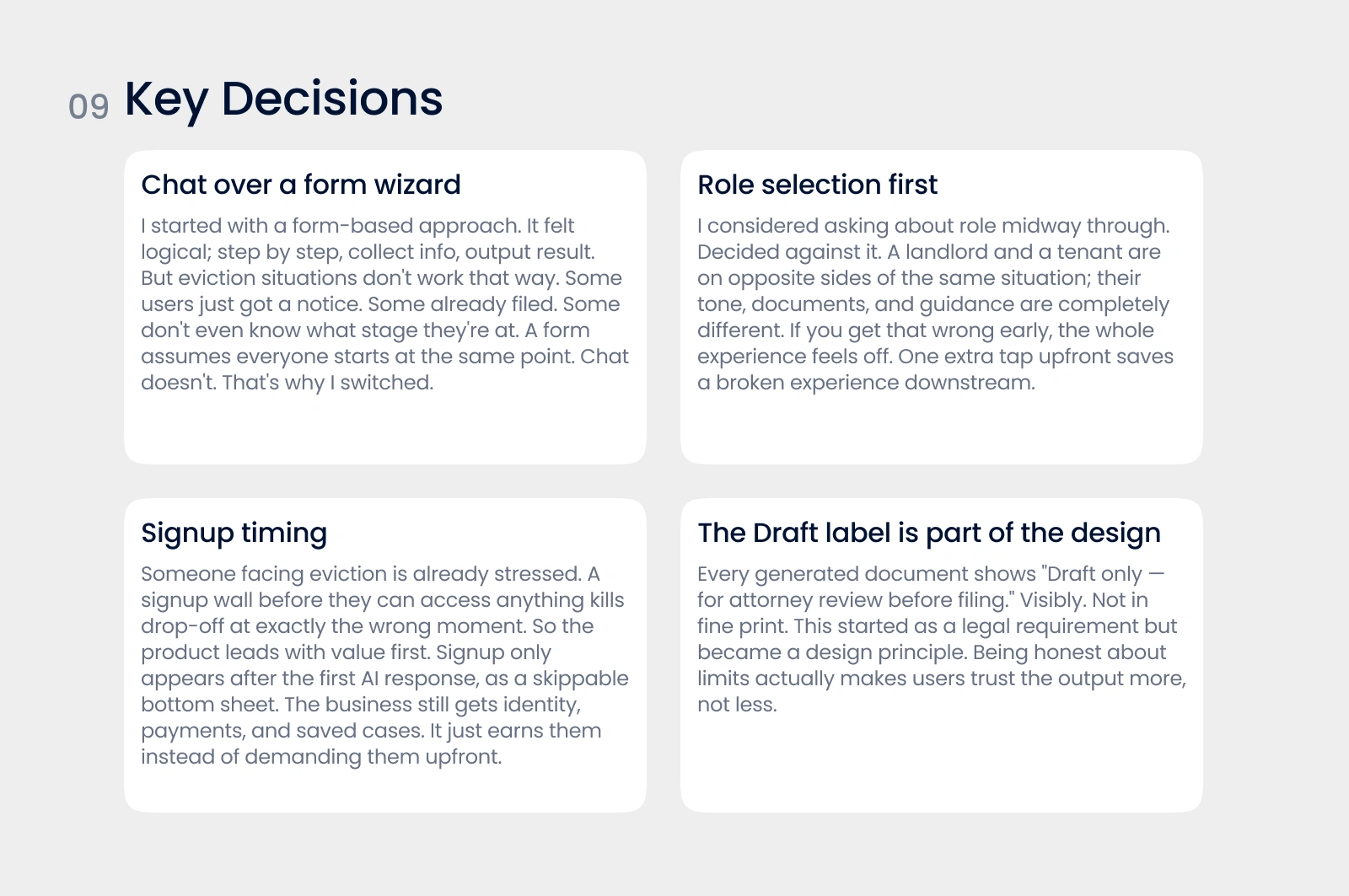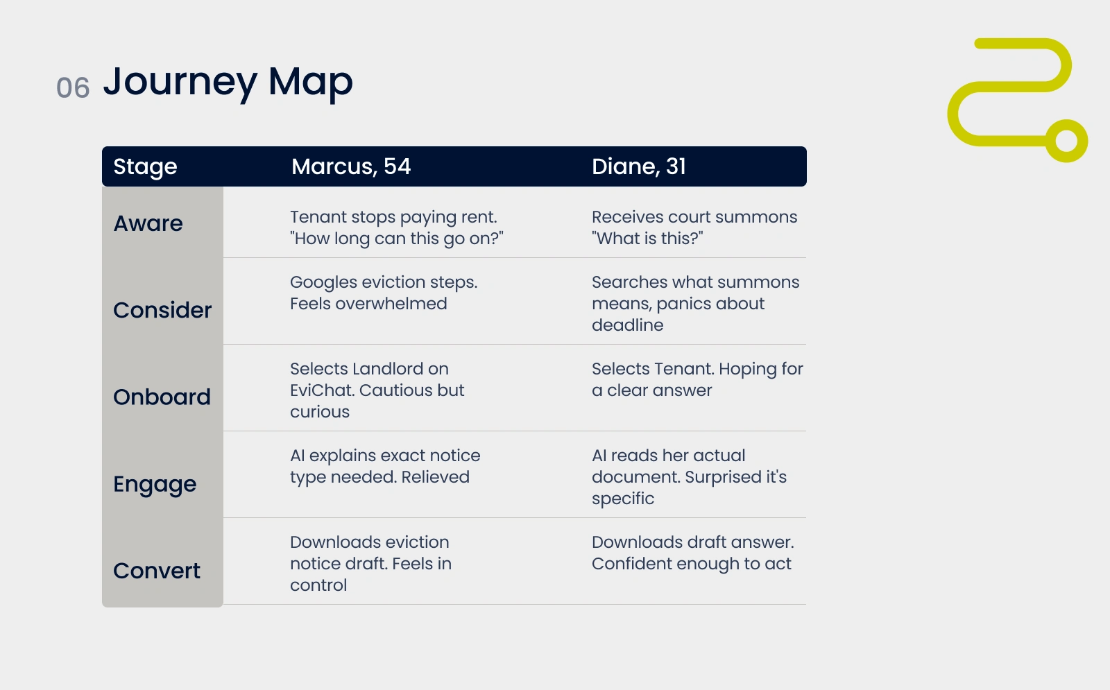 EviChat is a mobile AI assistant that helps NYC landlords and tenants navigate the eviction process without expensive attorneys. I led the end-to-end product design - from research and user flows to a full mobile UI - for an investor demo. The product uses conversational AI to guide users through legal procedures, generate draft documents, and understand their rights at a fraction of the cost of traditional legal help.