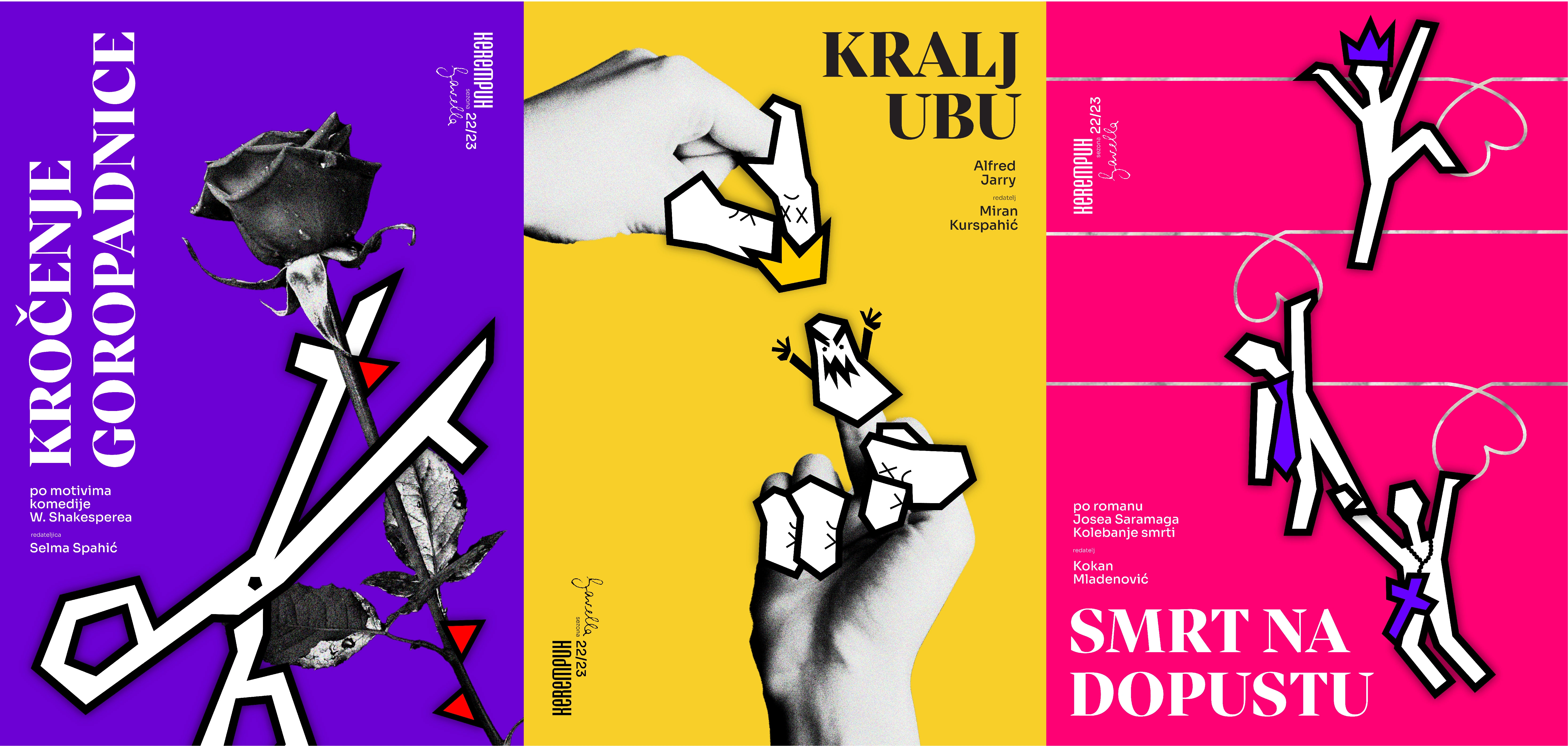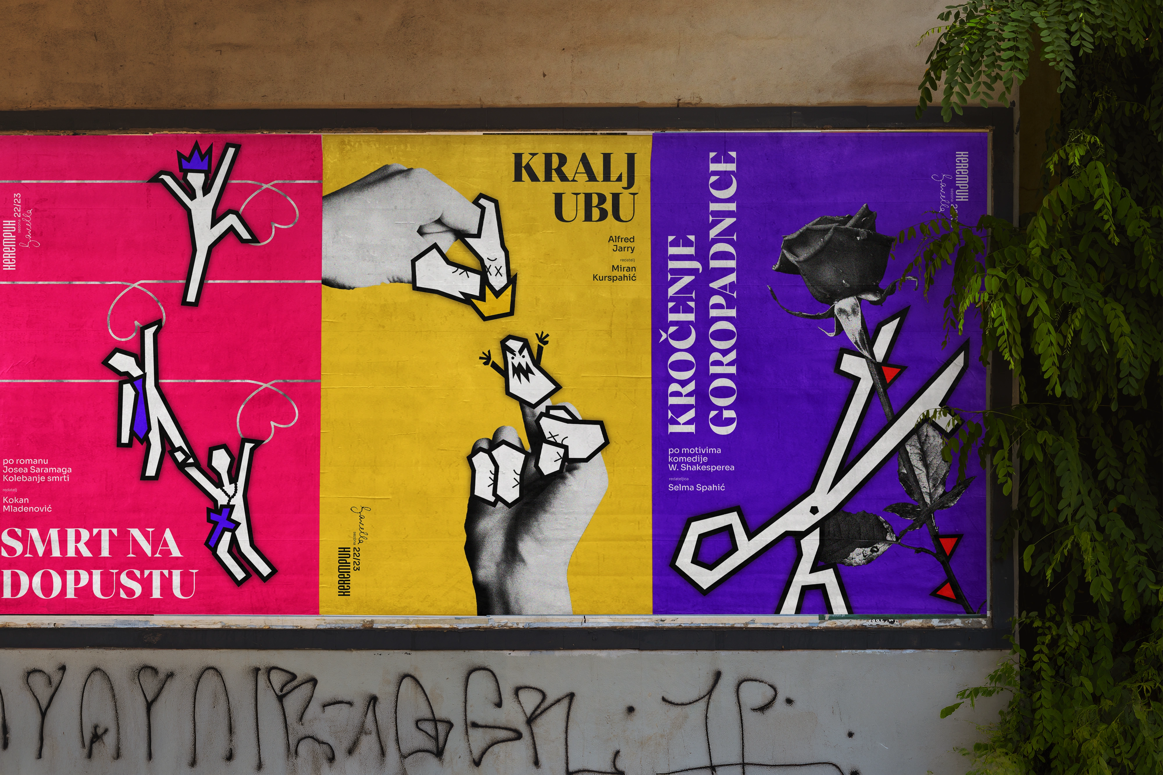 The typography and illustrations are both bold and expressive, capturing the sharp wit and playful tone of comedy. Their stylized, sometimes exaggerated forms serve as a visual counterpoint to the raw, realistic photography—creating a dynamic contrast that reflects the theatre’s blend of satire and social critique.