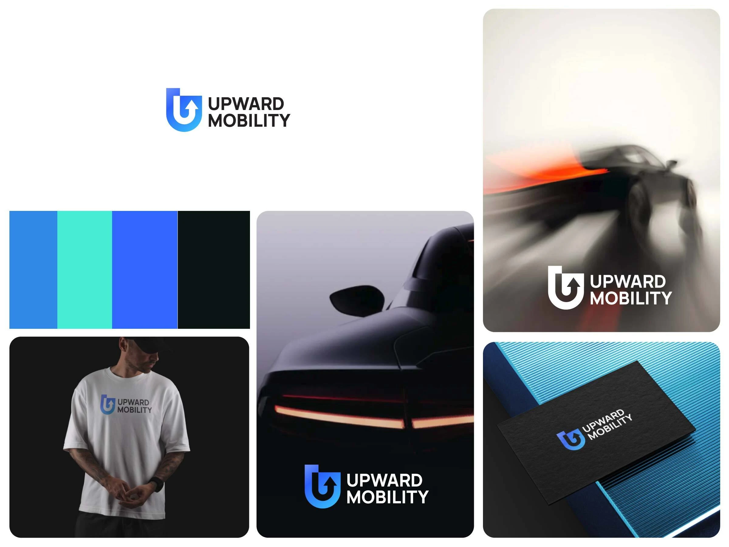 The logo design for Upward Mobility features a sleek, modern shield with an upward arrow, symbolizing progress and protection. The color palette includes vibrant cyan, deep blue, and black, reflecting innovation and reliability. The logo is versatile, showcased on a t-shirt, business card, and car branding, with a dynamic motion effect to emphasize mobility. This design captures the essence of a forward-thinking mobility brand, blending professionalism with a contemporary aesthetic for a strong visual identity.
