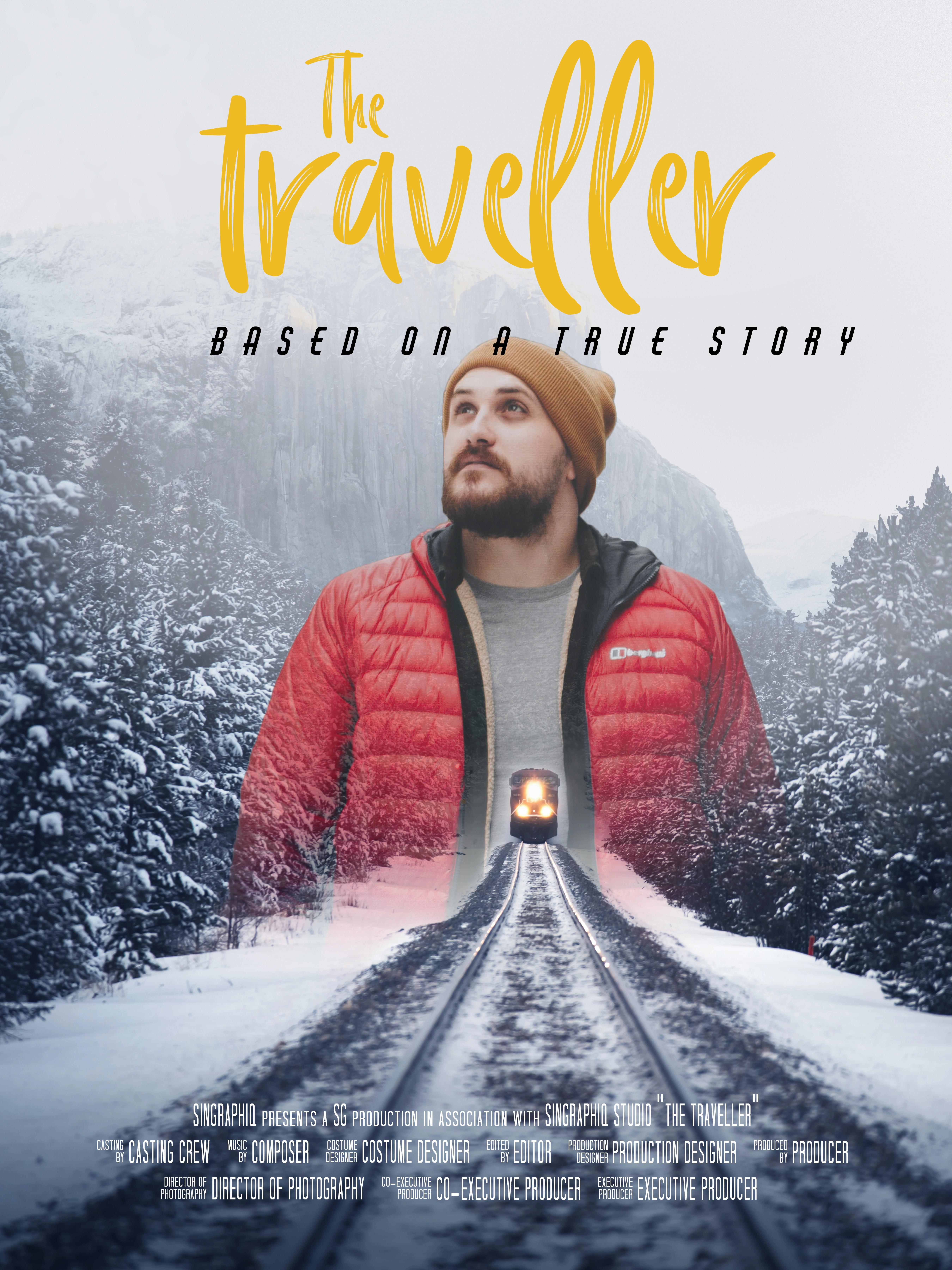 The "The Traveller" movie poster highlights a rugged protagonist and diverse landscapes, capturing the essence of adventure and self-discovery.