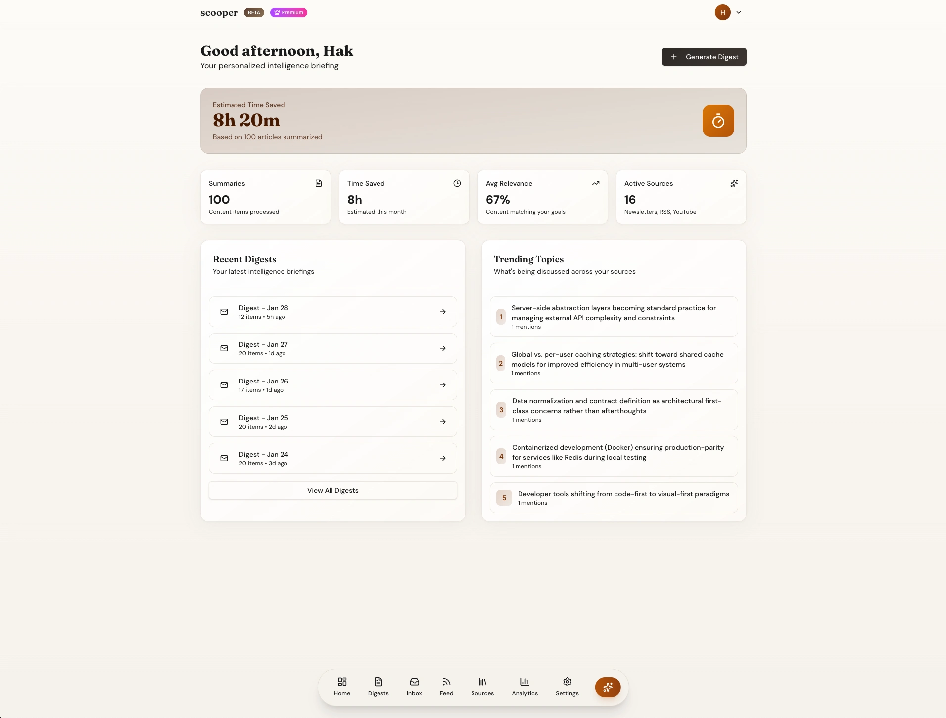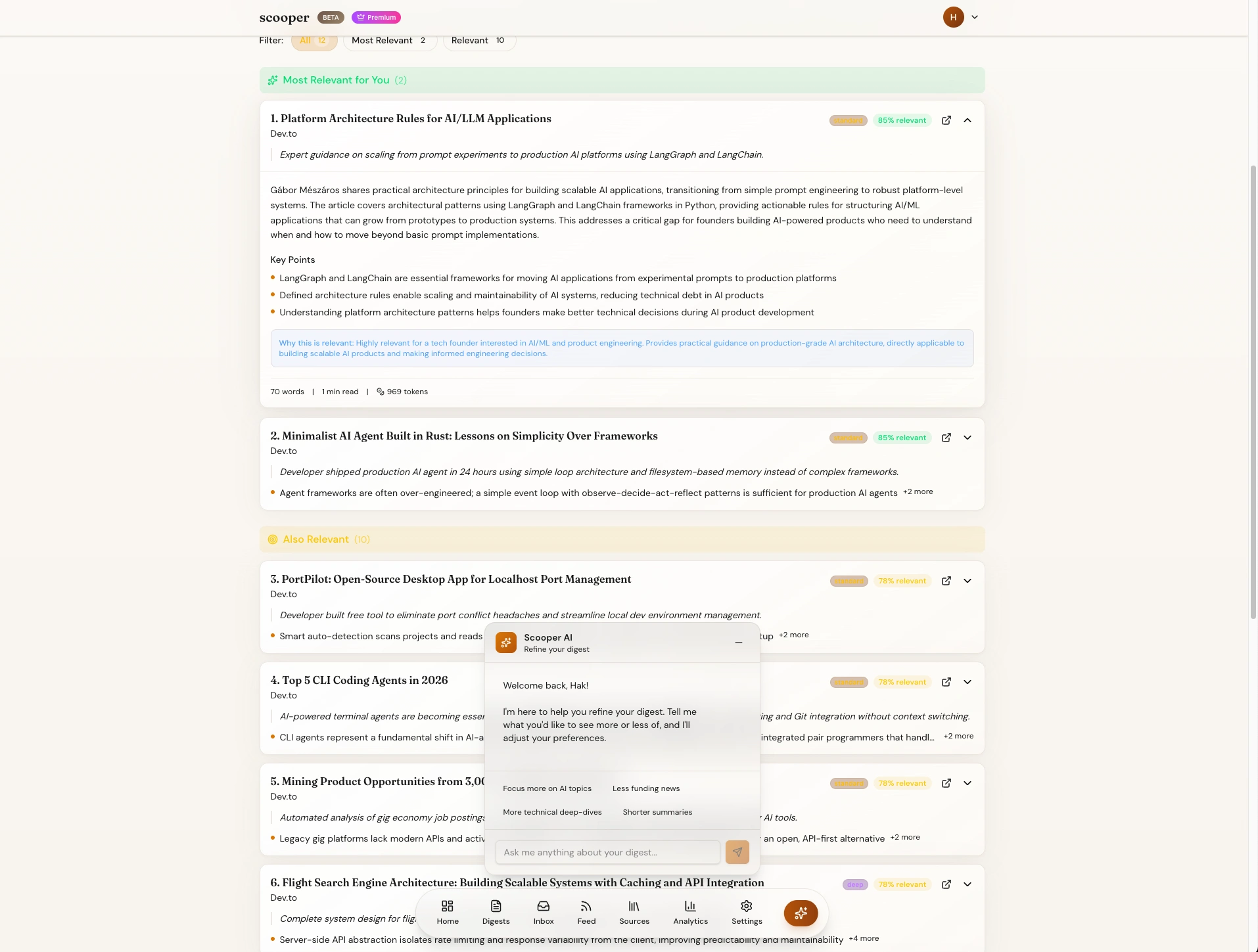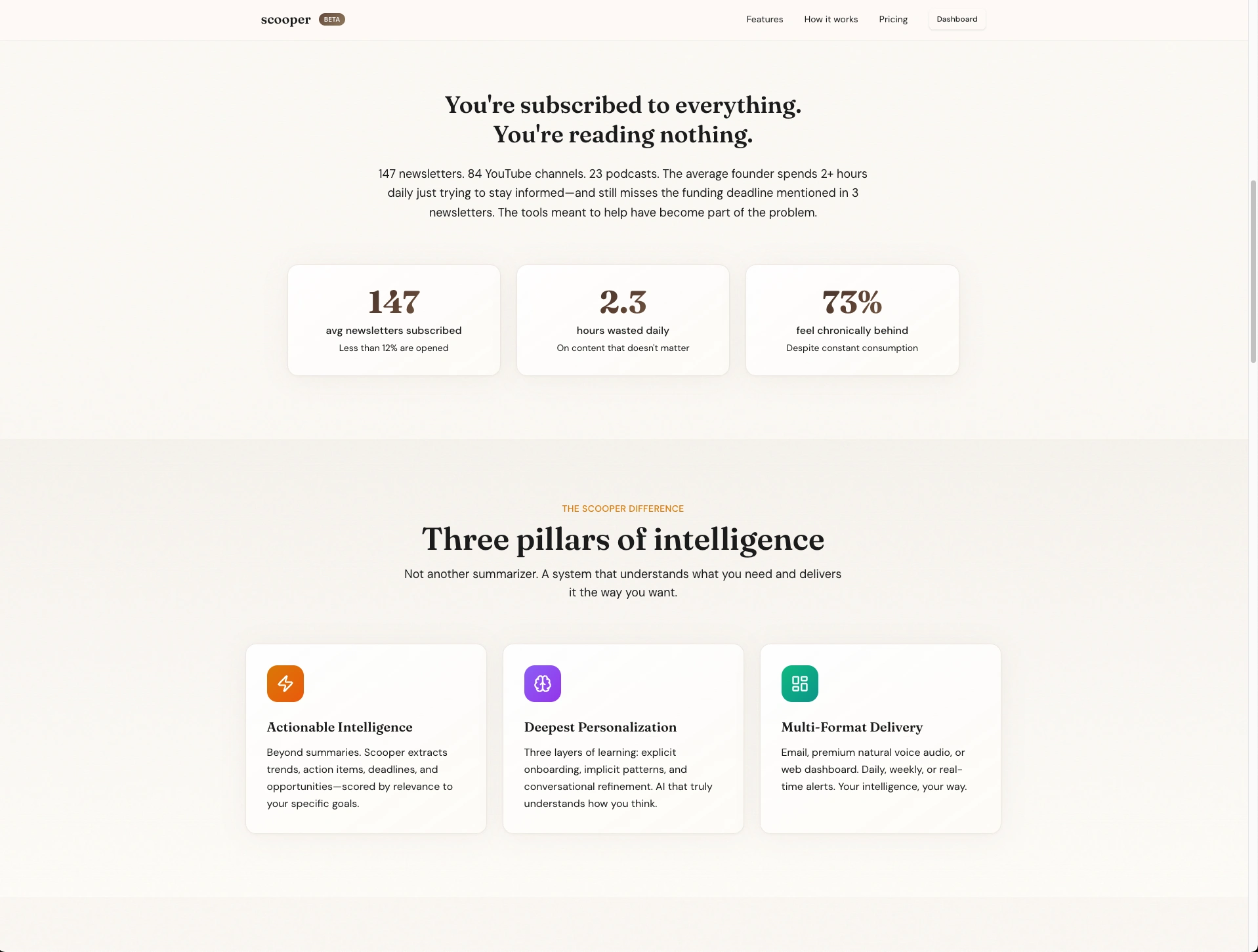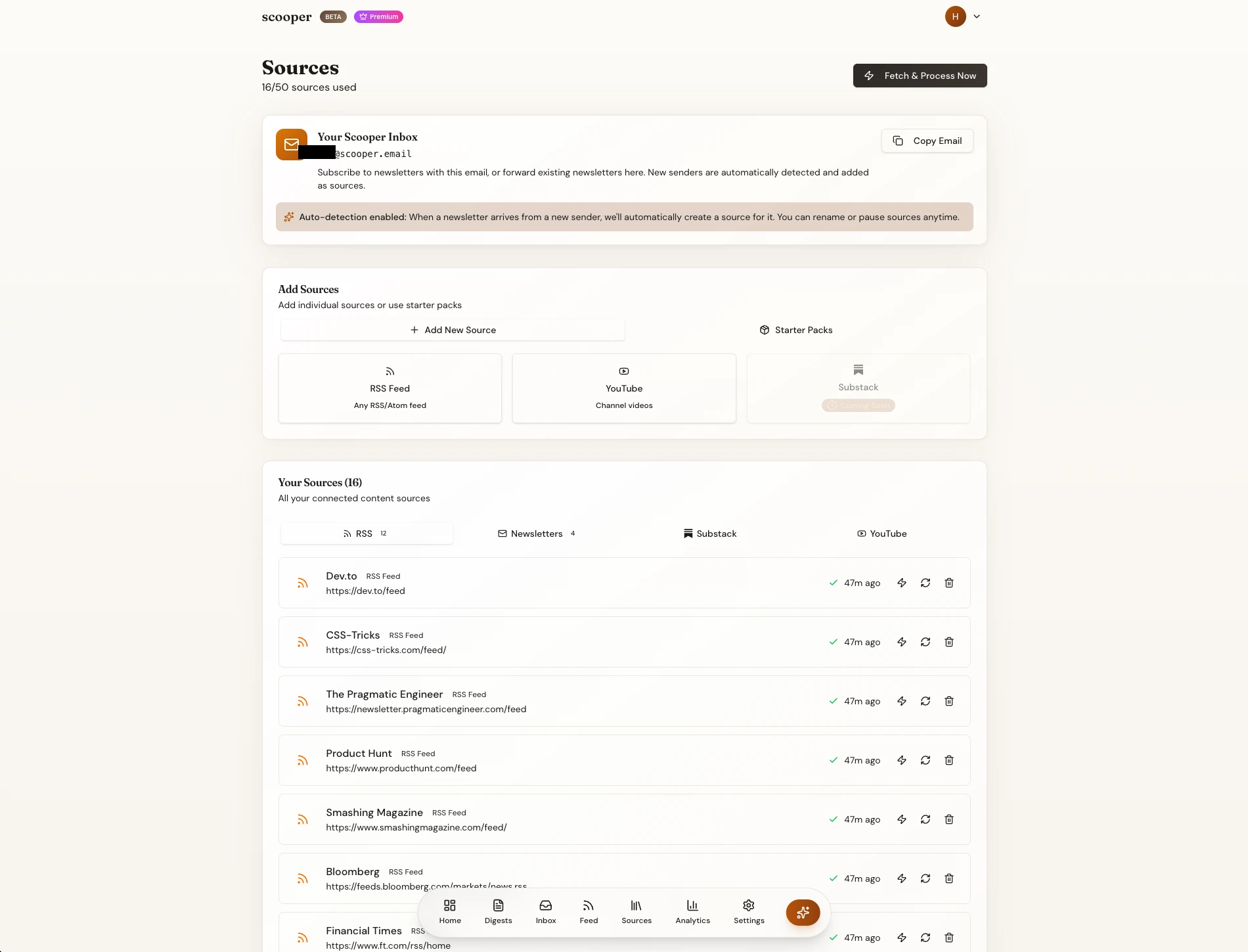 Scooper aggregates content from newsletters, RSS, and YouTube, then uses AI to extract what matters to YOU specifically.