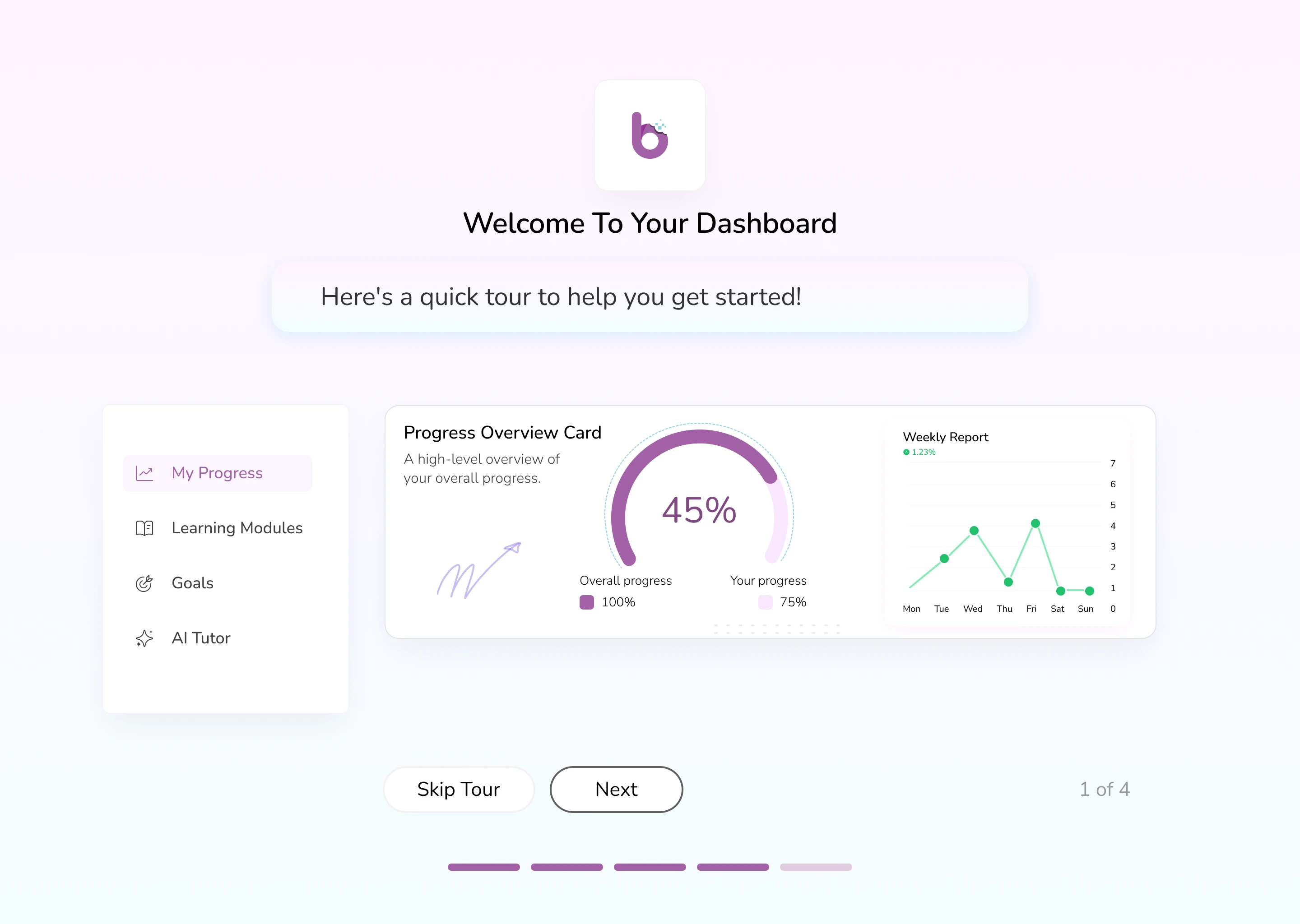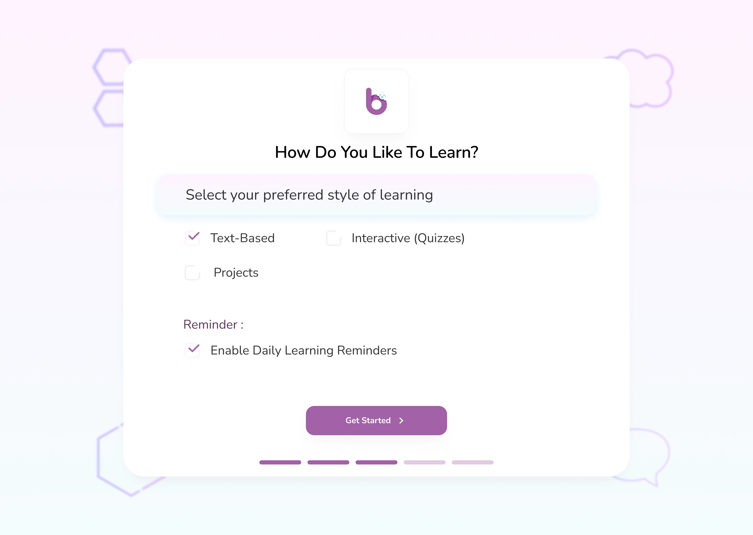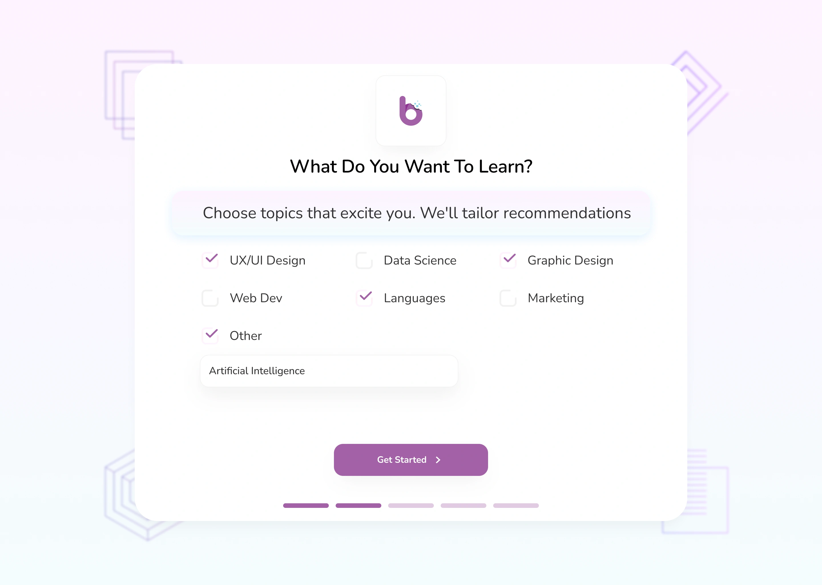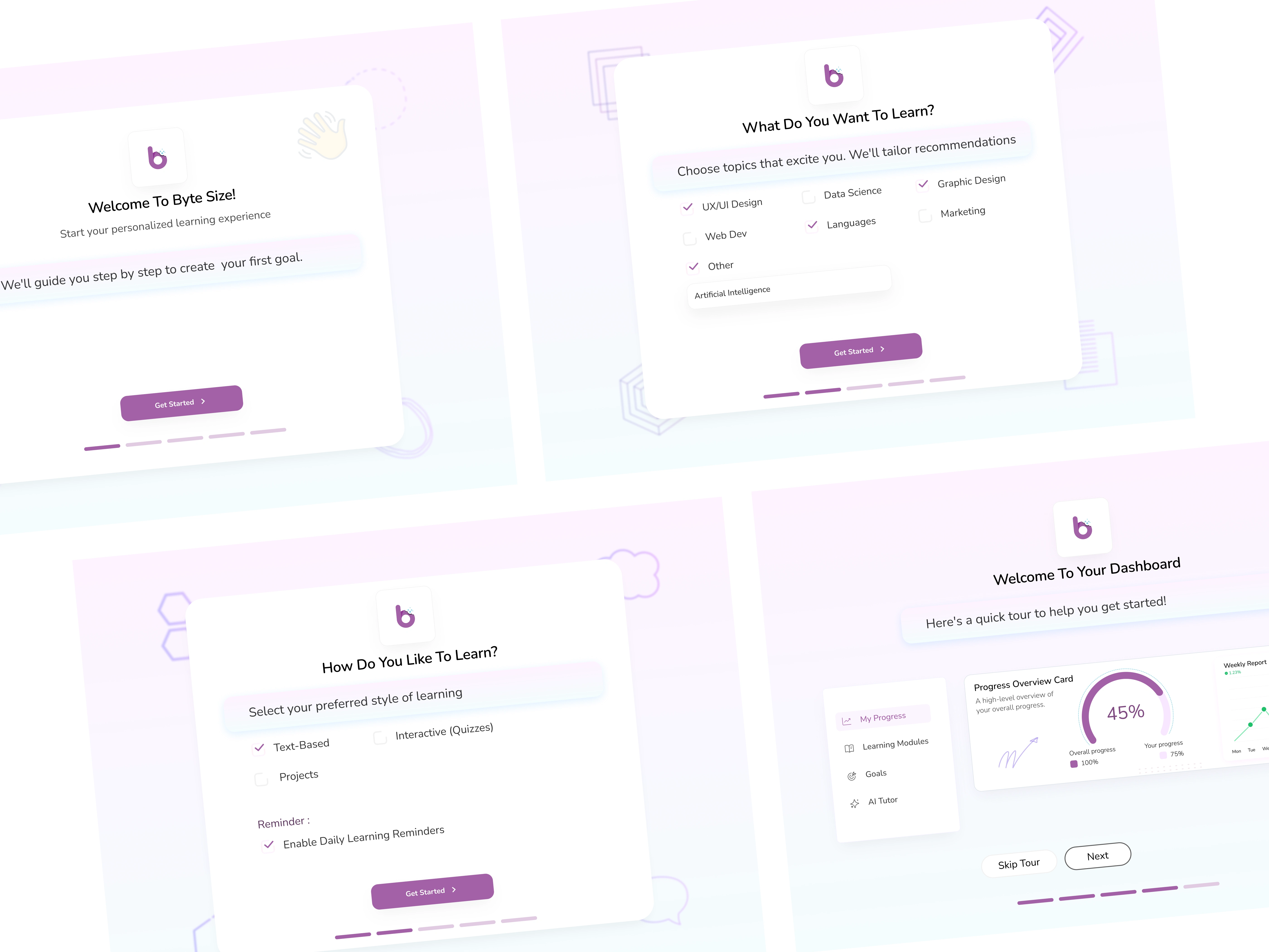 Personalized onboarding screens designed to improve user clarity and course recommendations. Clean visuals. Smooth UX. Perfect for EdTech SaaS.