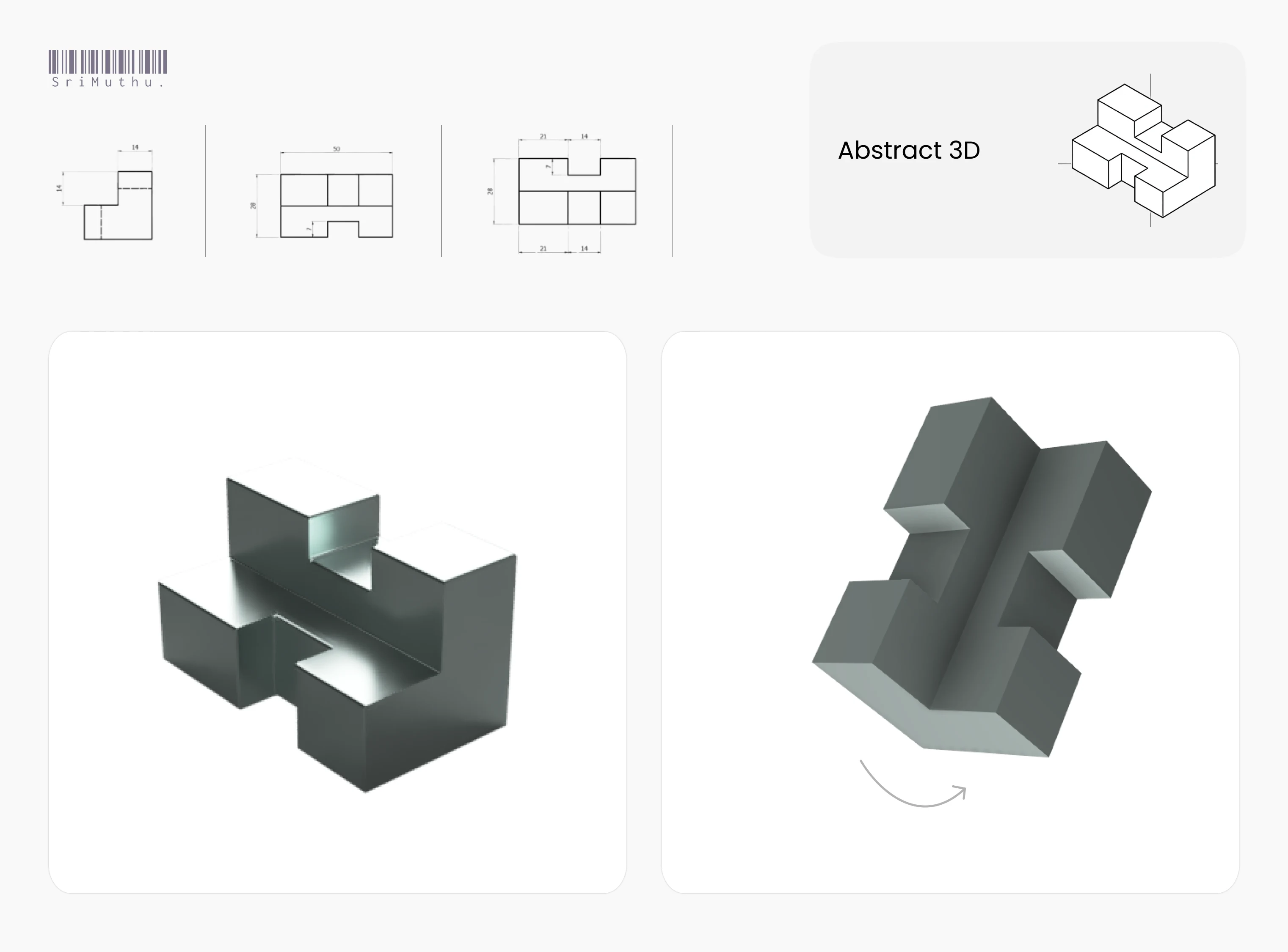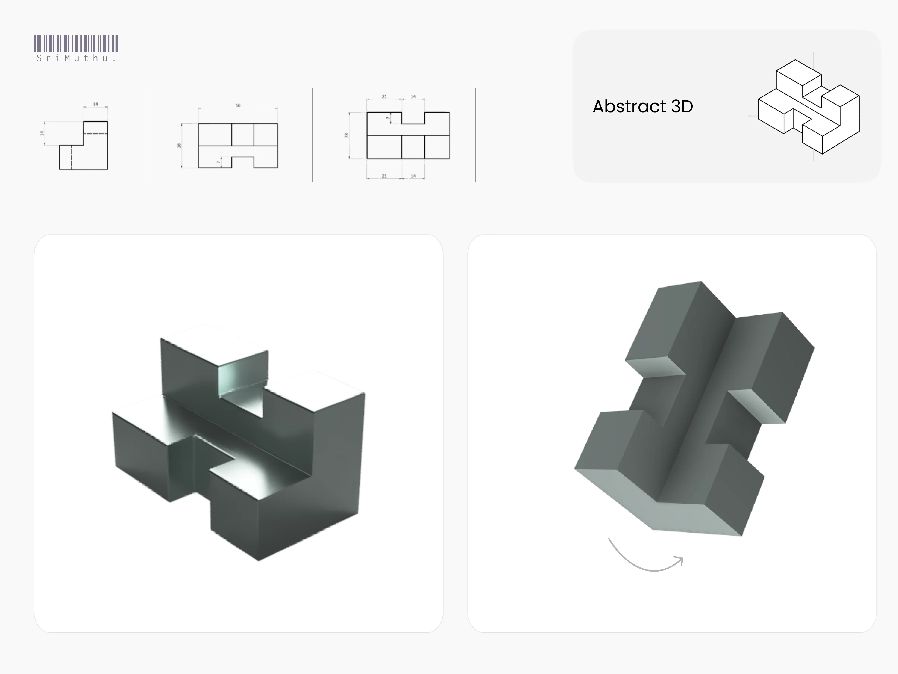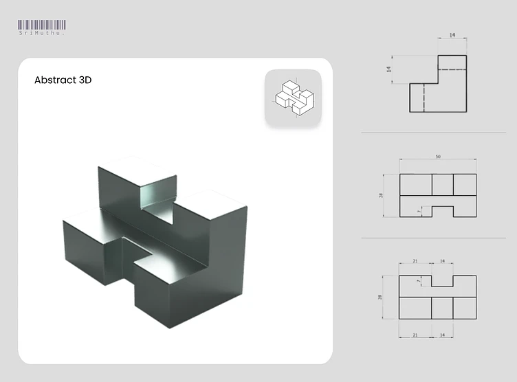 Abstract 3D model with technical drawings, precise, clean, and concept-driven. Ideal for showcasing modeling skills, form study, or mechanical creativity.