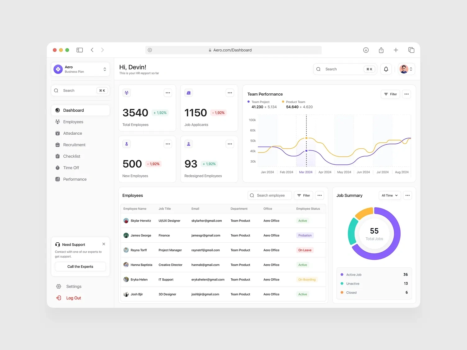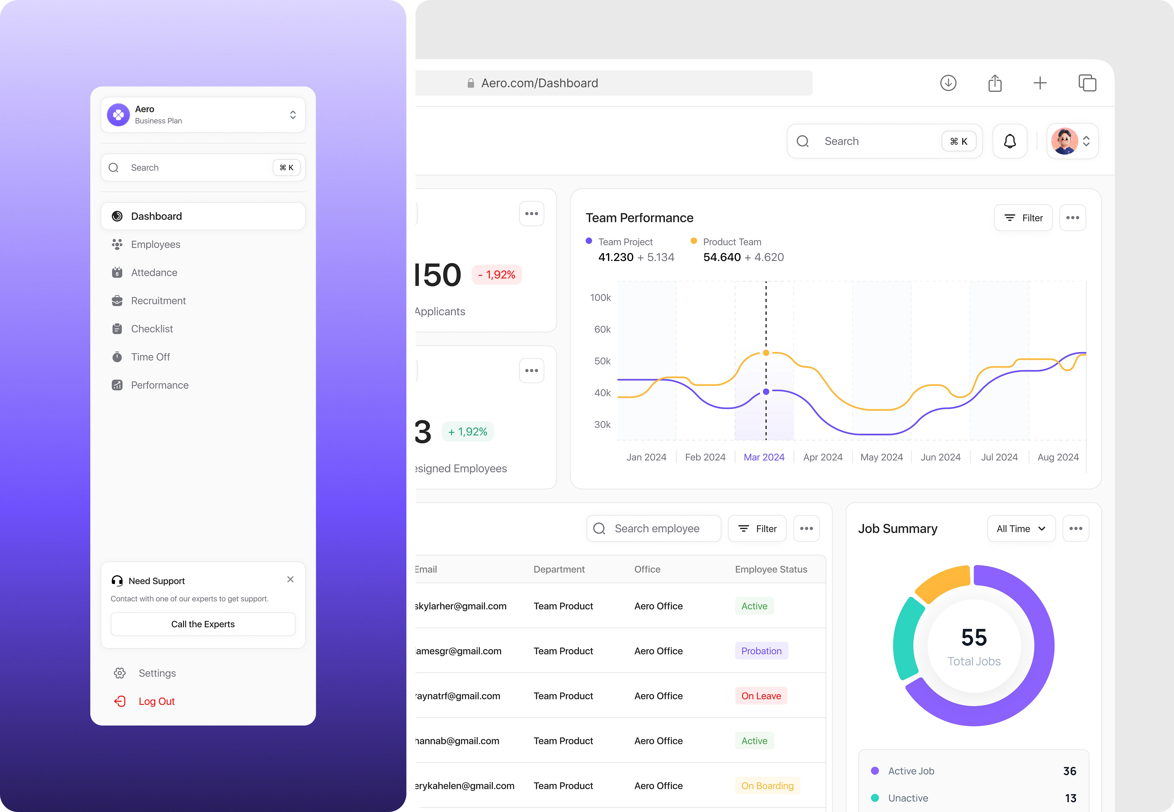 Aero is a modern HR dashboard designed to simplify workforce management and enhance the employee experience. For tracking attendance and monitoring performance.