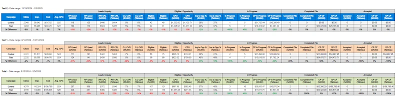 This test confirmed that the SEO landing page is more effective than the PPC landing page at driving high-quality, down-funnel conversions. While both pages experienced a decrease in RFI lead volume, the SEO page generated significantly more In Progress (+400%) and Completed Files, and improved cost-per-lead efficiency by 15% compared to the previous test.