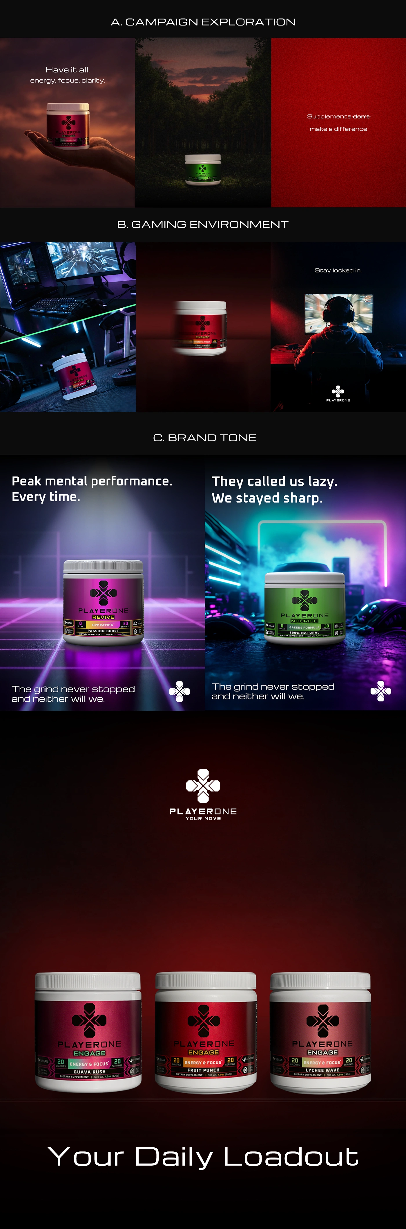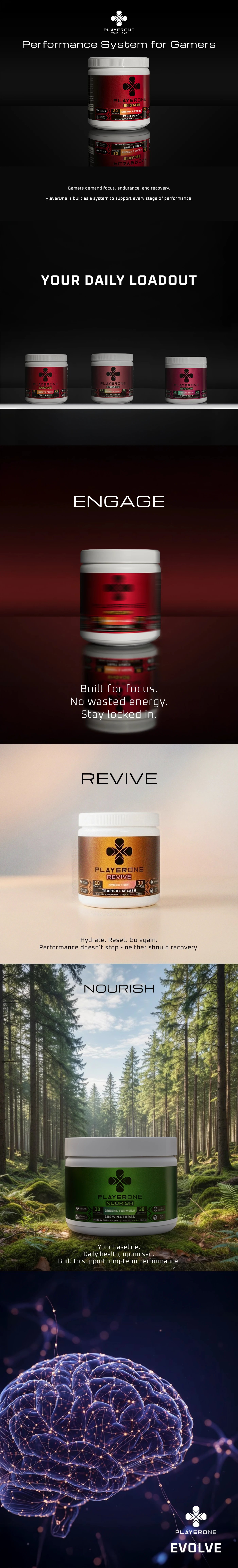 A performance-focused supplement brand designed for gamers - built as a complete system for energy, recovery, and cognitive enhancement through bold, immersive visual storytelling.