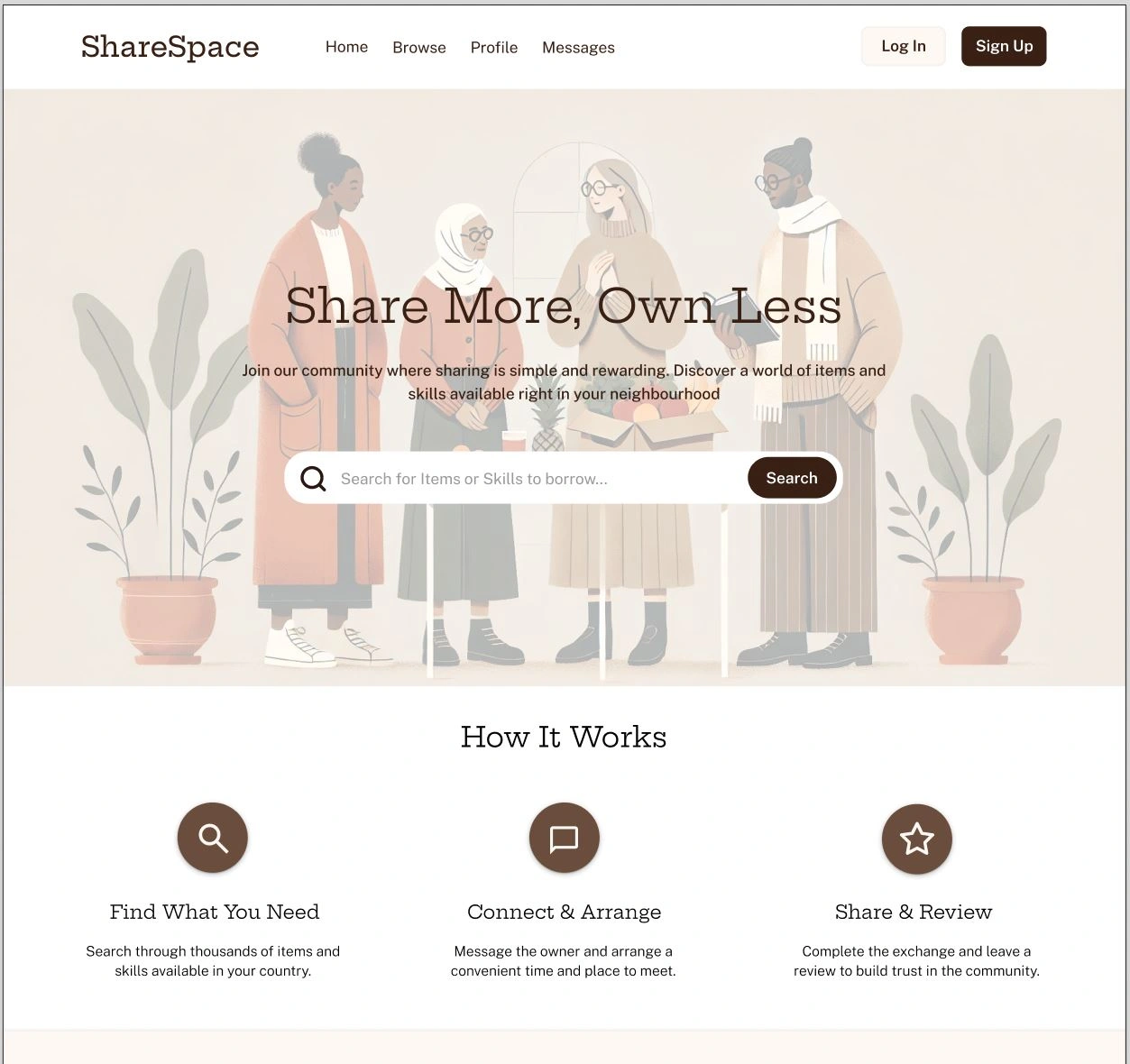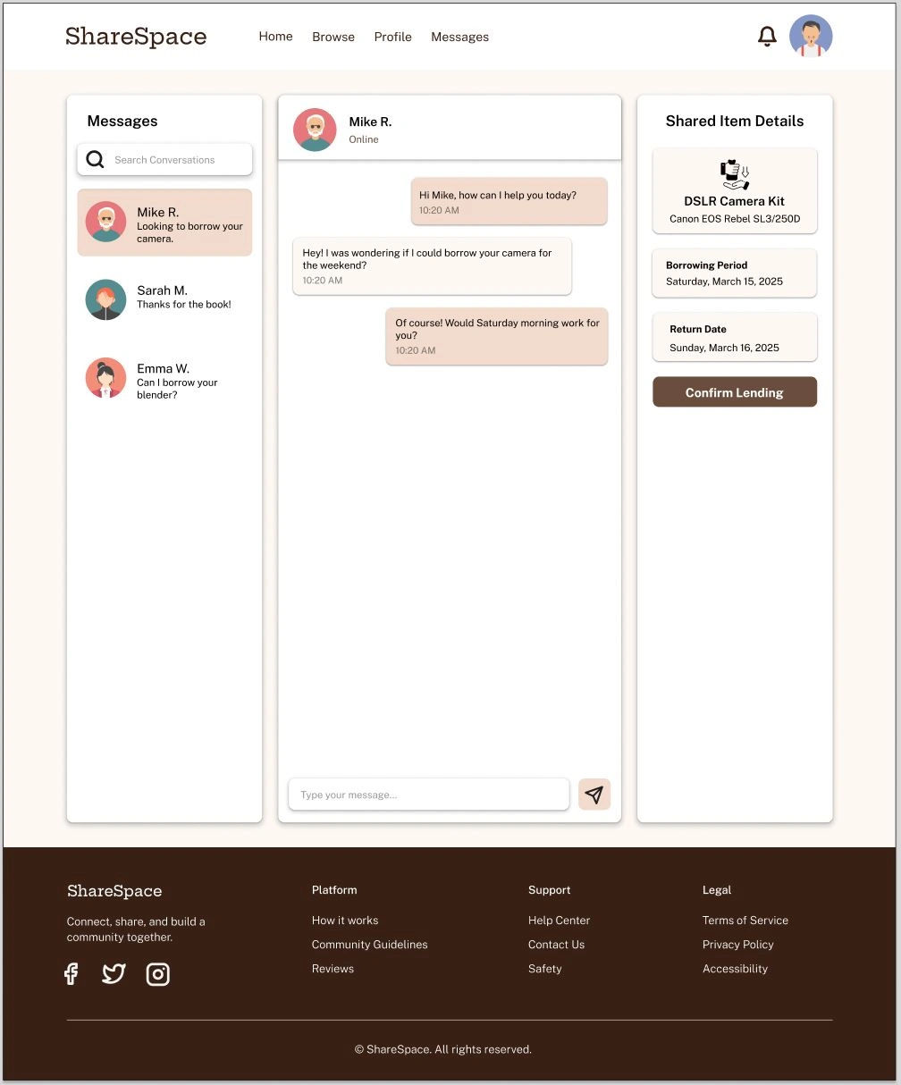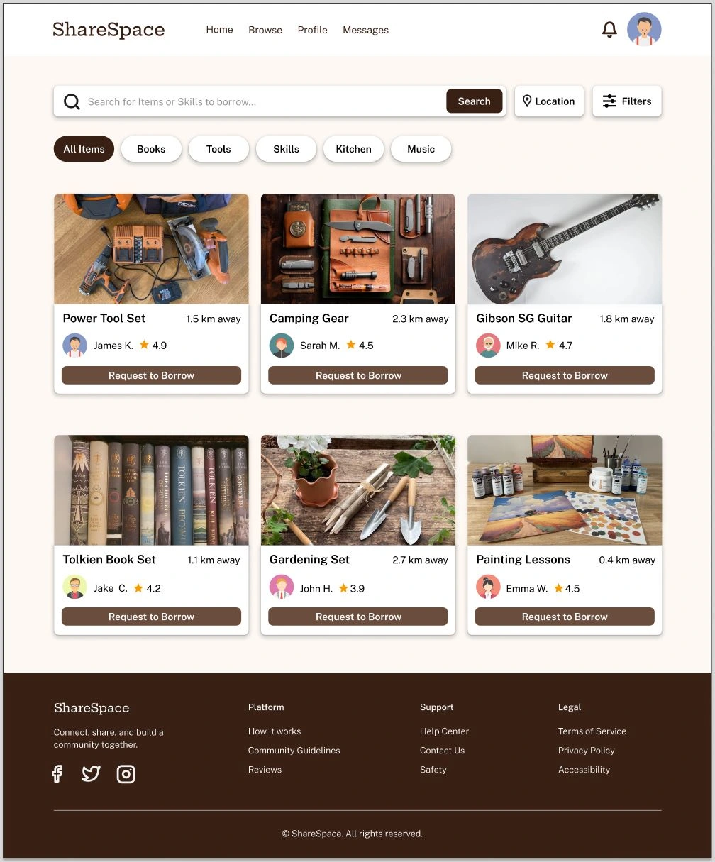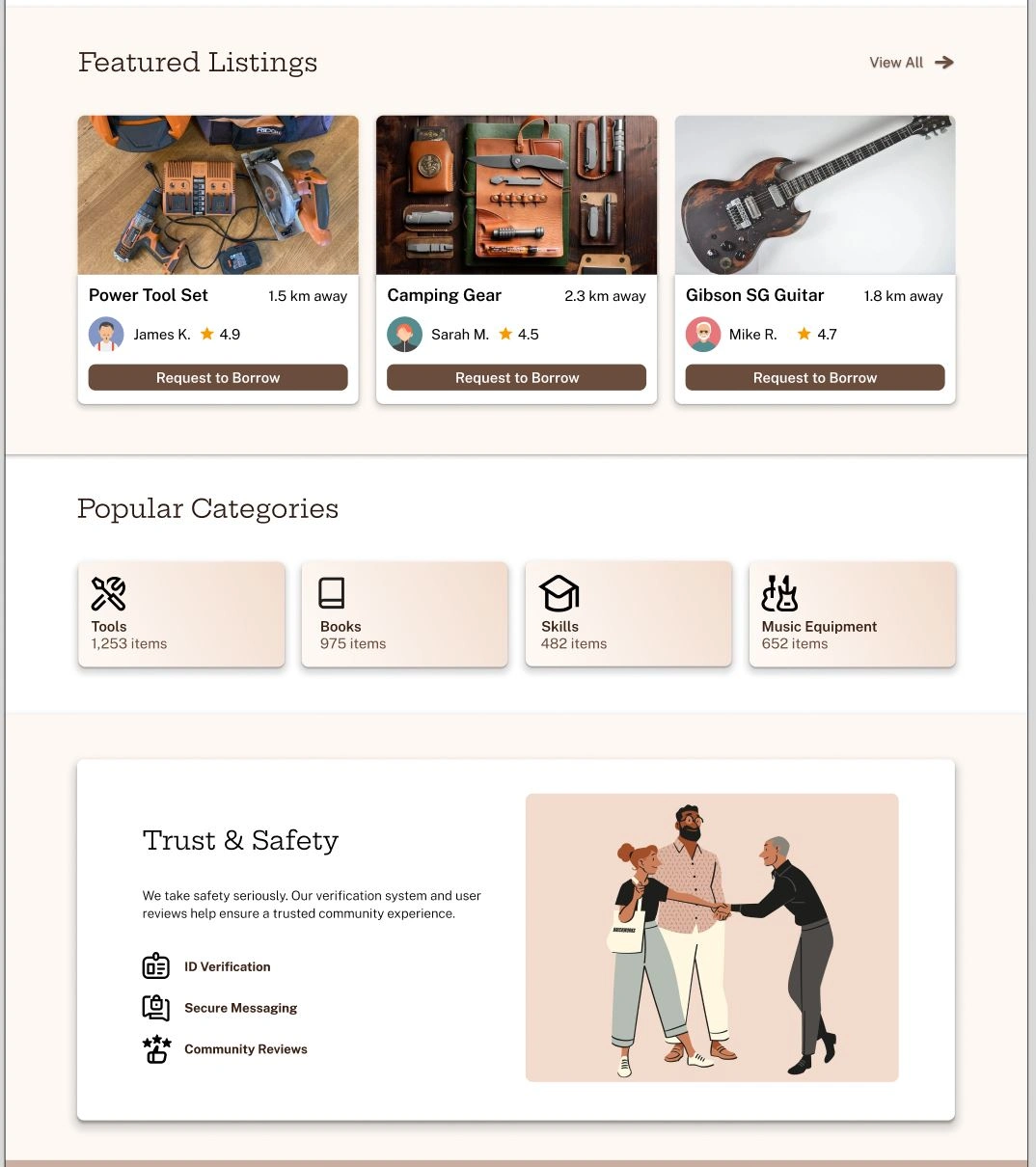 Minimalist, trust-based platform with ID checks, filters, messaging, and ratings to make borrowing and sharing safe, reliable, and easy.