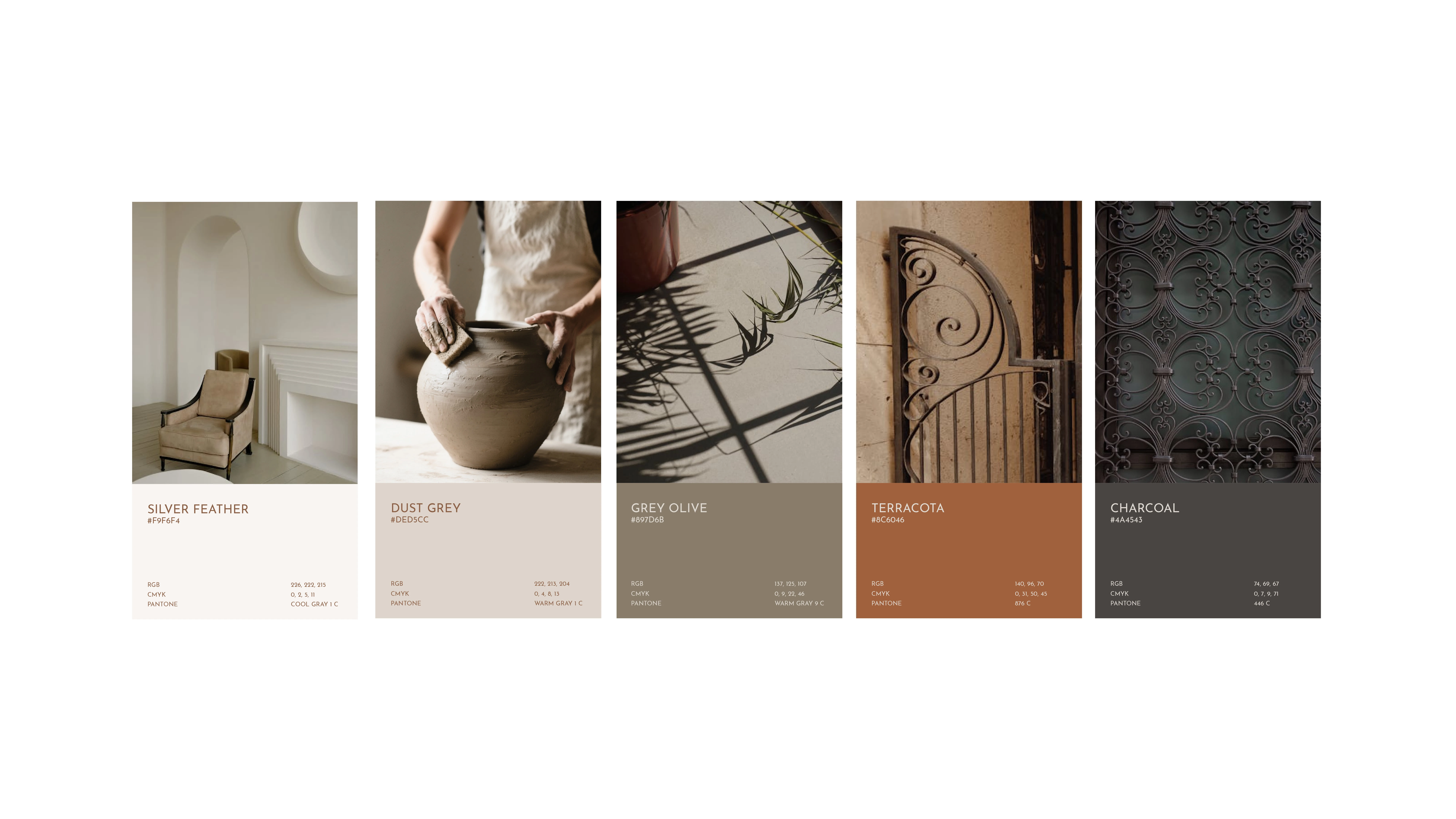 The palette moves from soft neutrals to warm earthy tones, communicating softness, elegance, and a quiet sense of history. The two anchoring colours across all physical touchpoints are Terracotta and Charcoal.