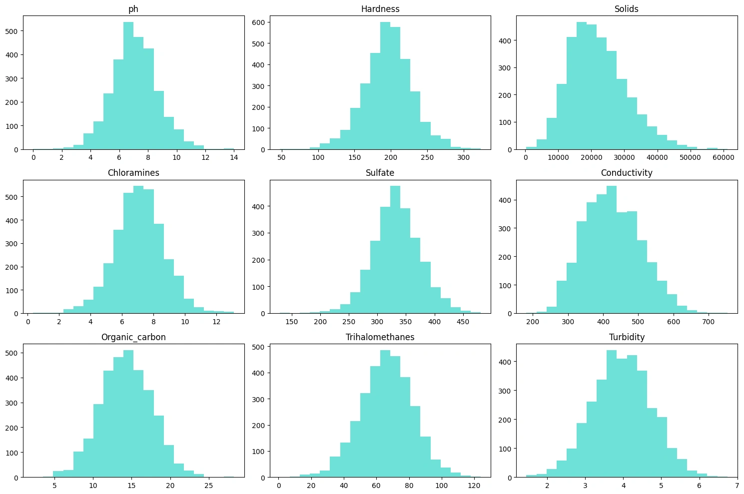 Gambar 1b, gambar ini menampilkan setiap kolom numerik yang ada pada dataset, seperti pH, Hardness, Solids, Chrolamines, Sulfate, Conductivity, Organic_carbon, Trihalomethanes, Turbidity. Dari semua kolom yang ditampilkan, hanya kolom Solids dan Conductivity yang memiliki skewness ke arah kiri. Berikut adalah informasi singkat yang didapatkan dari visualisasi diatas:pH: Tingkat pH berkisar antara 0 hingga 14, dengan sebagian besar sampel memiliki pH sekitar 7, yang merupakan netral.Hardness: Kesadahan air bervariasi, dengan sejumlah besar sampel menunjukkan tingkat kesadahan sekitar 200.Solids: Terdapat kisaran total padatan terlarut dalam sampel, dengan konsentrasi puncak mendekati 20.000.Chloramines: Kadar kloramin dalam sampel mencapai puncaknya mendekati 7 atau 8.Sulfate: Konsentrasi sulfat mencapai puncaknya sekitar 300.Conductivity: Konduktivitas sampel menunjukkan puncak pusat mendekati 400.Organic_carbon: Nilai paling umum untuk kandungan karbon organik adalah sekitar 14 hingga 15.Trihalomethanes: Frekuensi kadar trihalomethane paling tinggi sekitar 65 hingga 70.Turbidity: Tingkat kekeruhan mencapai puncaknya sekitar 3,5.