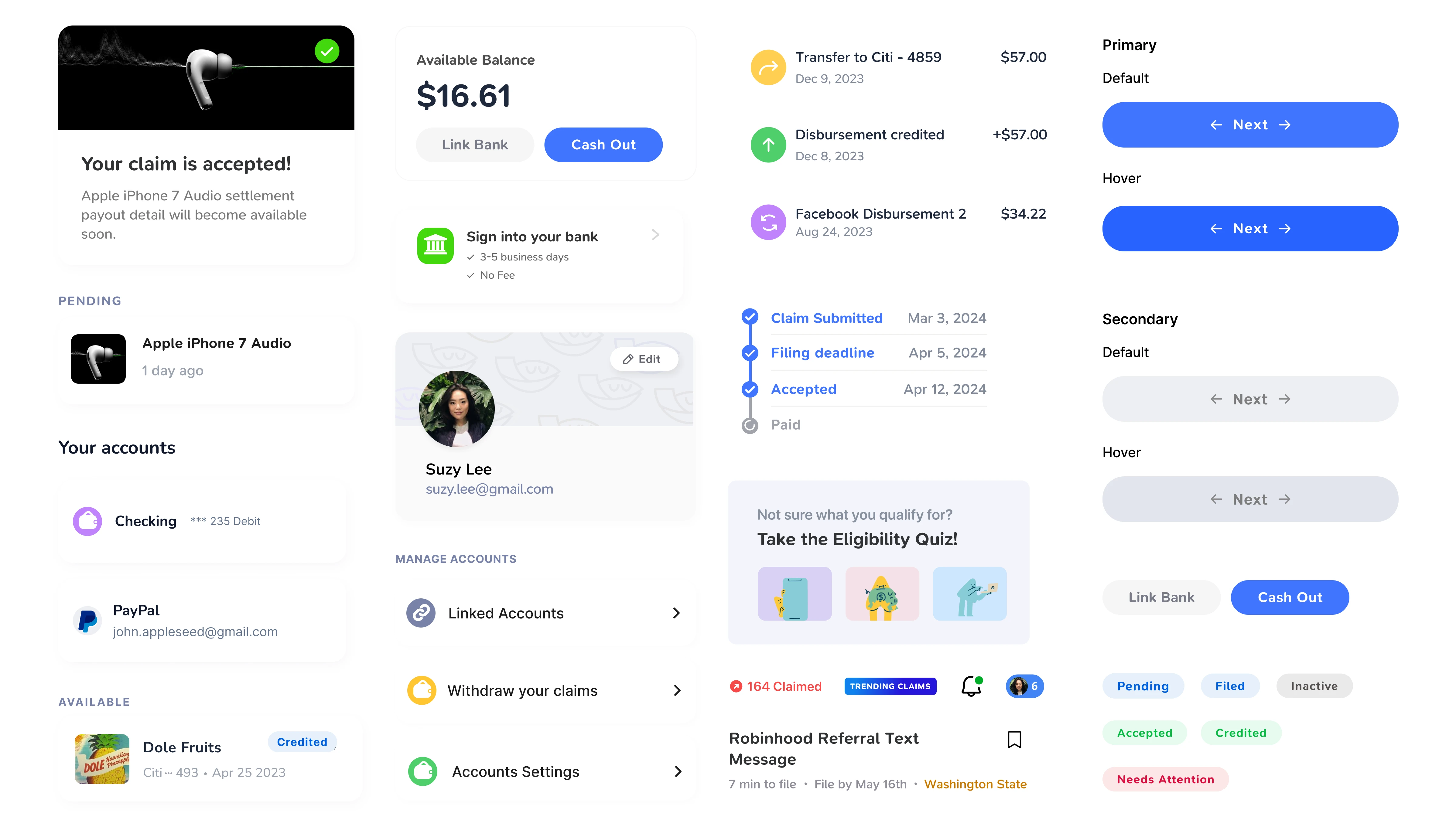 I was the only designer on the team working with 4 engineers and the founder/CEO to process massive claim payouts at that time. There was no branding work in place when I started, and the order in which design happened was also all over the place. From this position, I learned to work with uncertainties – and learned how to develop branding and personality driven by the app design itself. While the company pivoted/shifted its direction in 2024, it was an invaluable experience as a designer where I learned to be a multidisciplinarian with a strong product sense.