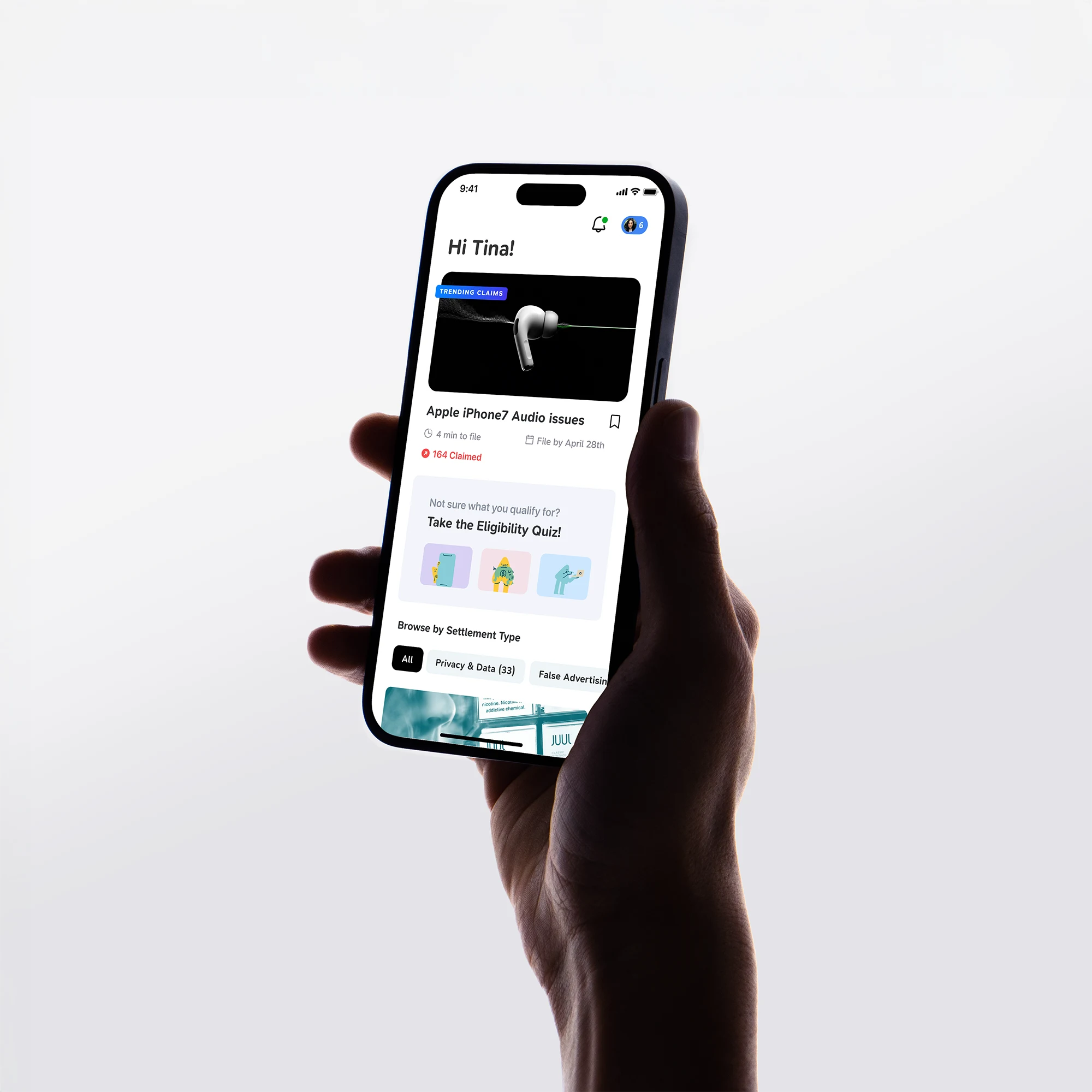 Discovery Screen. Legal tech can be dense and unfamiliar. I tried to restore the friendliness of the tech-company by embedding soft, pastel colors and illustrations, as well as making it easy for any user to know what clams they might be eligible for