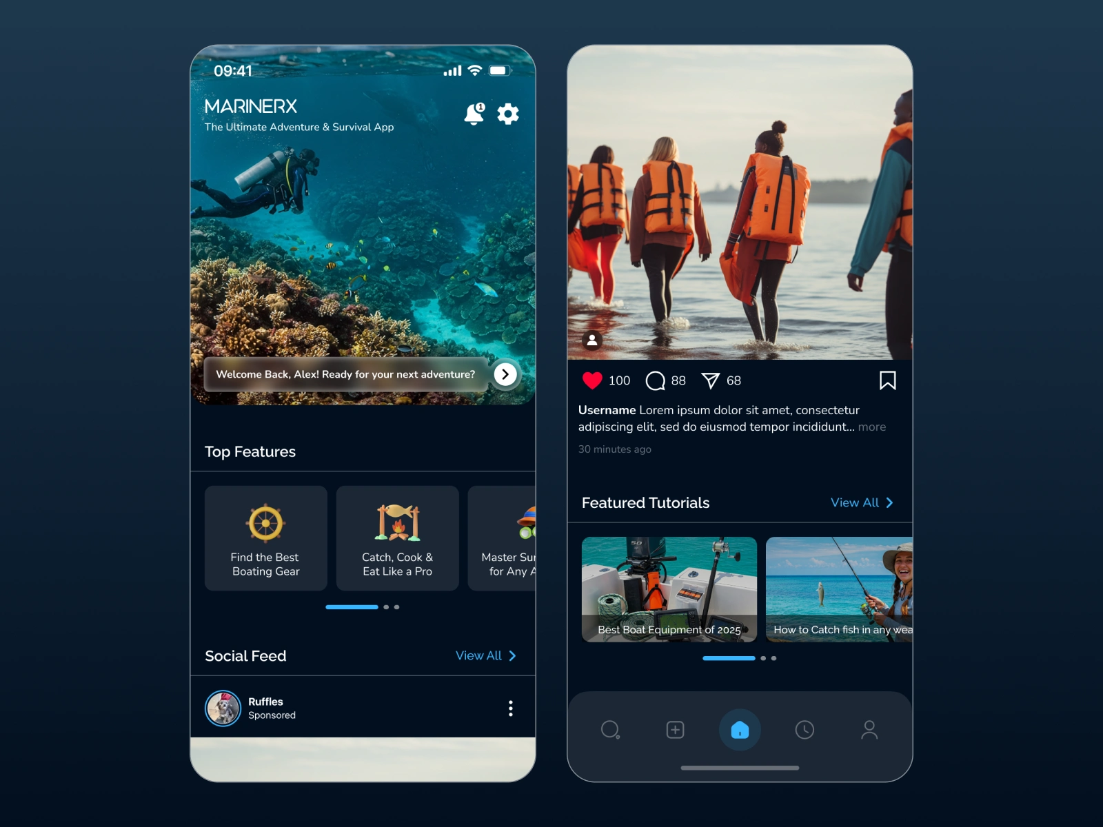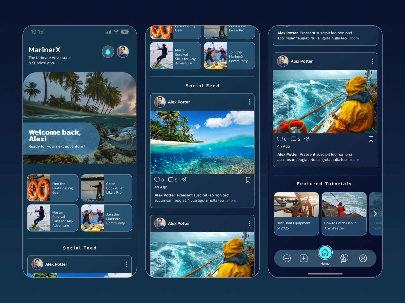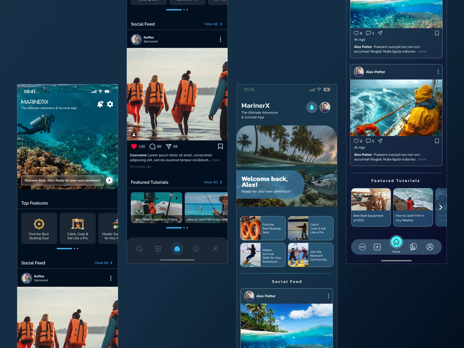 Designed the UI/UX for MarinerX, a mobile app for sailors and survivalists featuring boating guides, fishing tips, and an immersive off-grid experience.