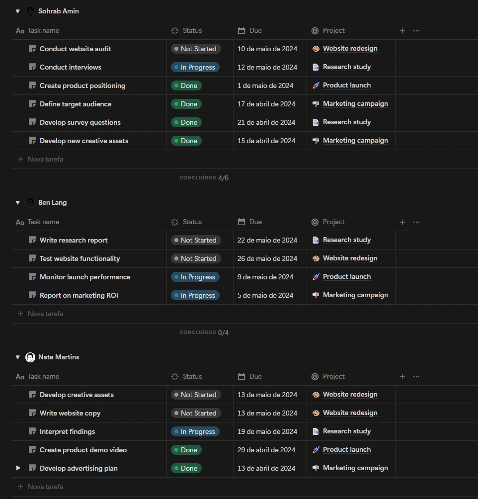 I built a task dashboard grouped by team member, where each collaborator is assigned responsibilities with clear deadlines, project tags, and progress status.