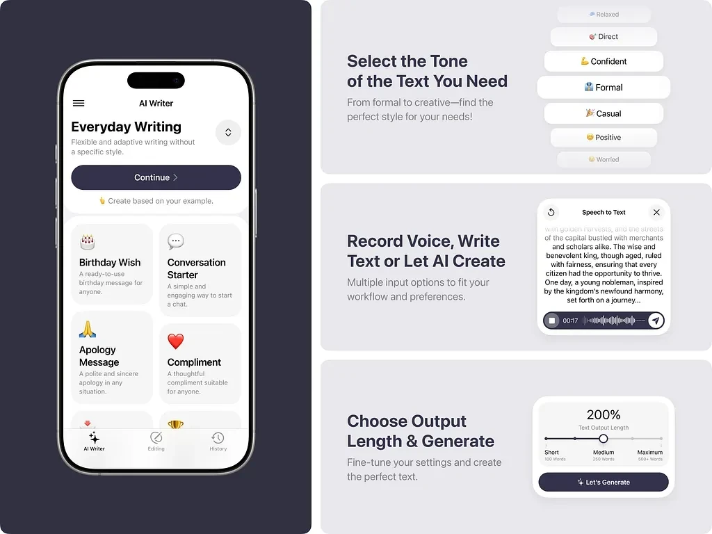 The conversion-centered approach shows in our prominent "Let's Generate" CTAs, intuitive slider controls for output length, and streamlined onboarding flow. Our goal was to make AI writing feel accessible rather than intimidating, and this supportive design naturally encourages experimentation with different tones and input methods for diverse content needs.