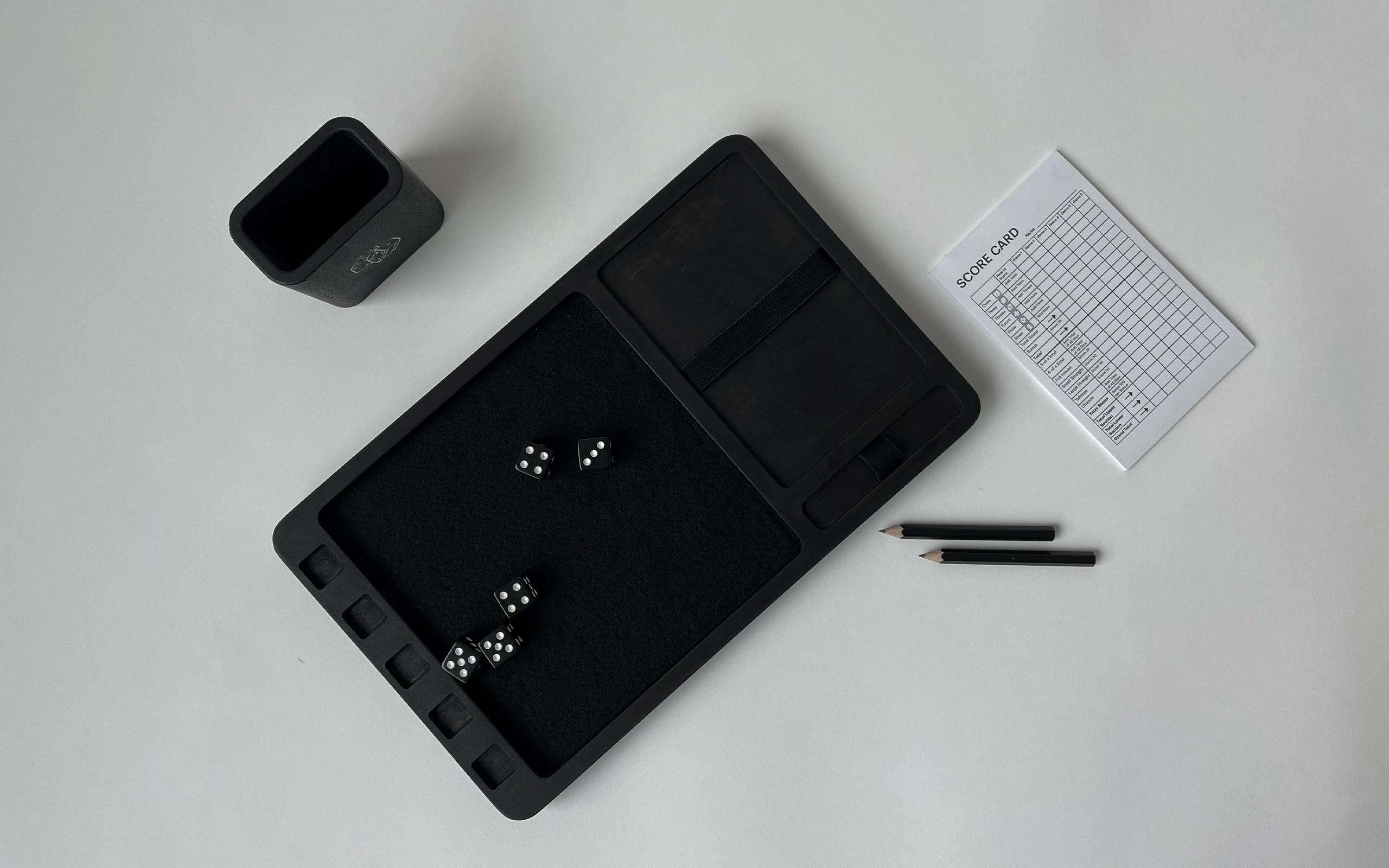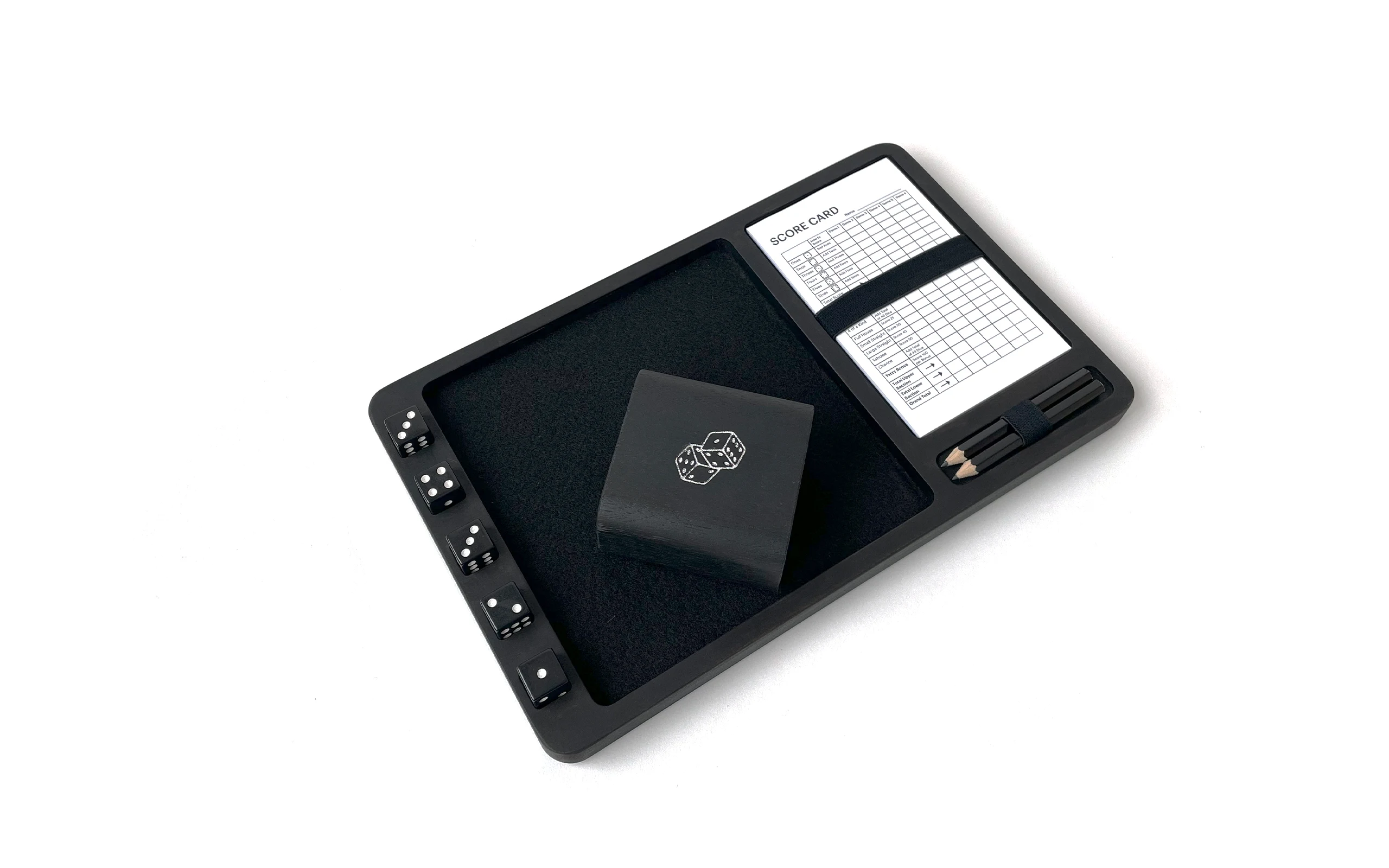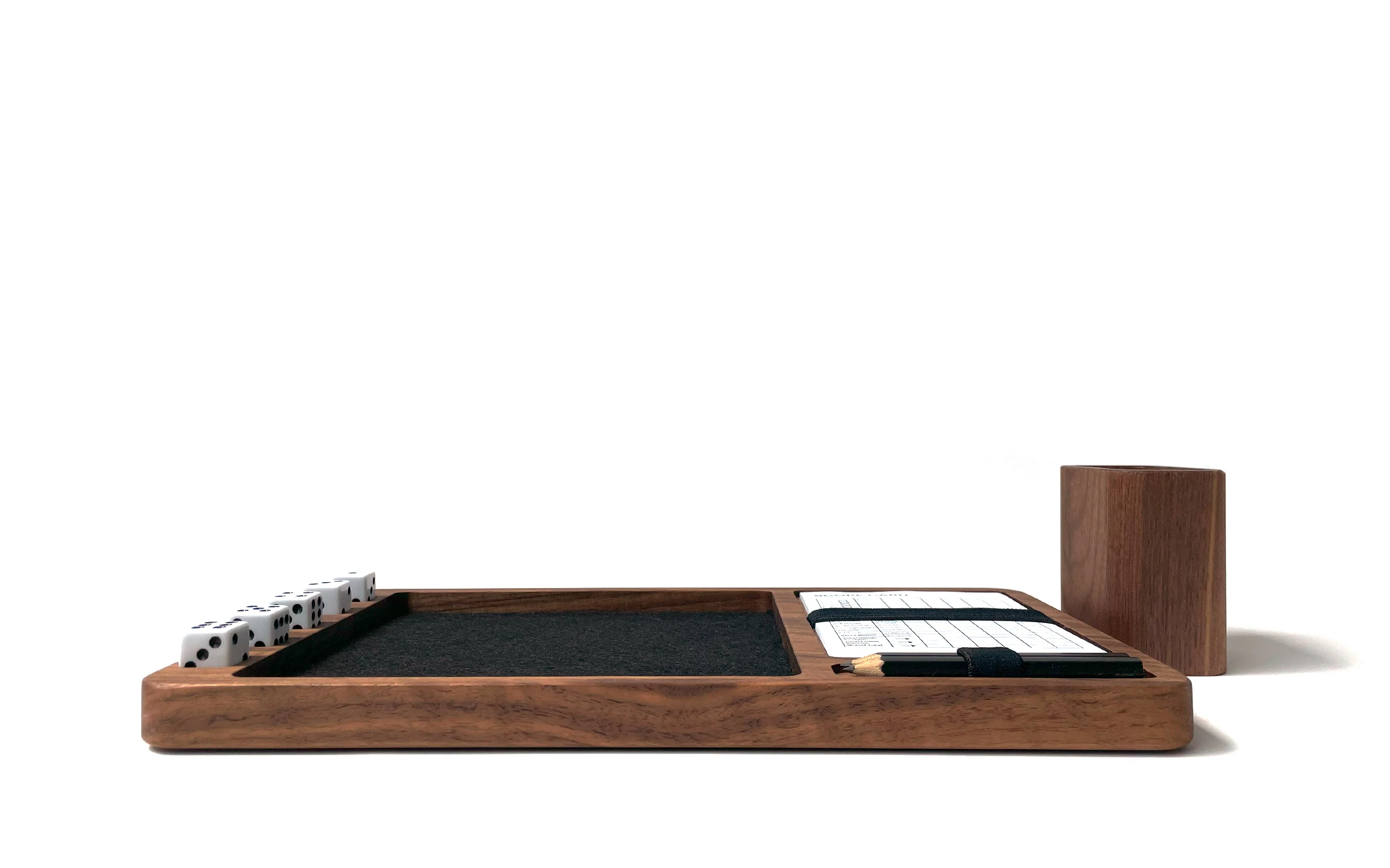Game night meets modern design with this luxury dice tray, crafted from beautiful walnut or stained black maple and lined with a recycled felt bottom that softens the sound of every roll. The set includes five 16mm dice, a custom score pad, and game pencils—everything you need to play Yahtzee and other classic dice games in elevated style. With clean lines and heirloom-quality materials, it’s a game set made for design lovers and makes a thoughtful, one-of-a-kind gift. Pair it with the optional matching walnut dice cup for the full experience. Made in the USA.