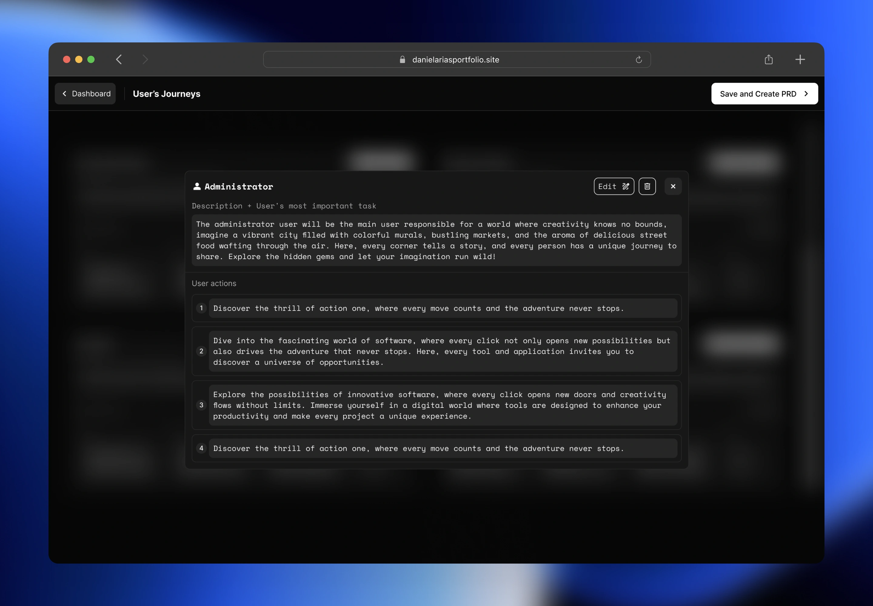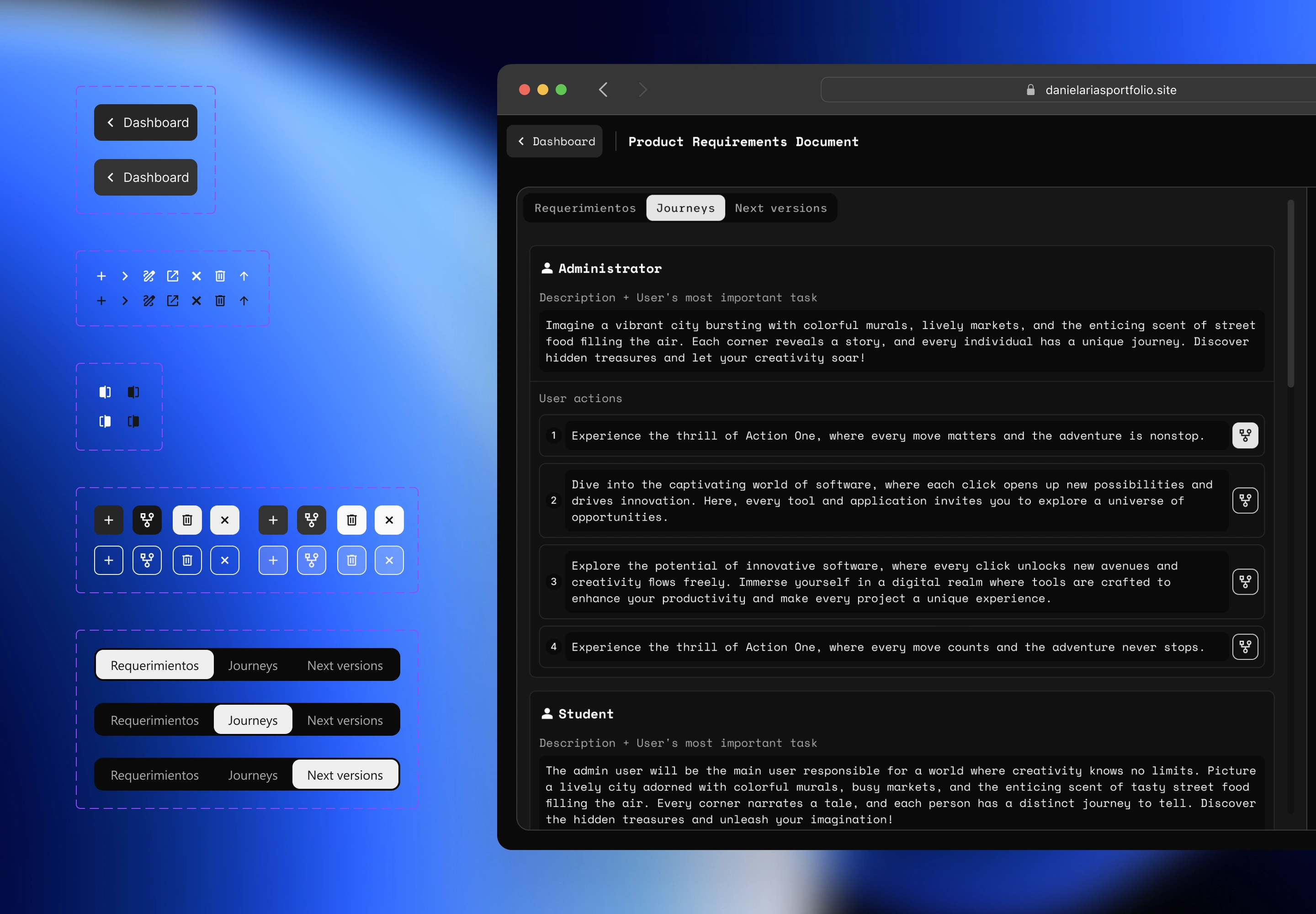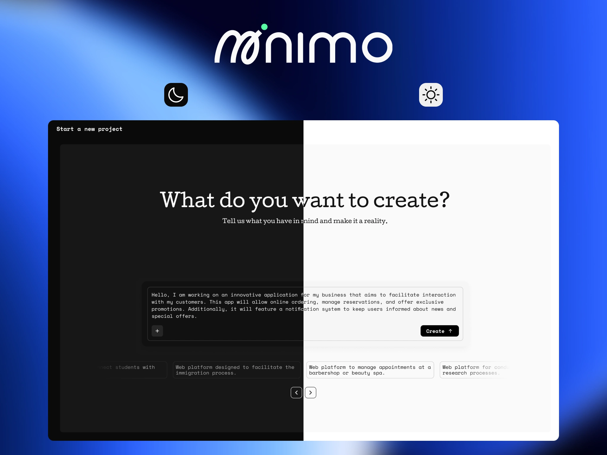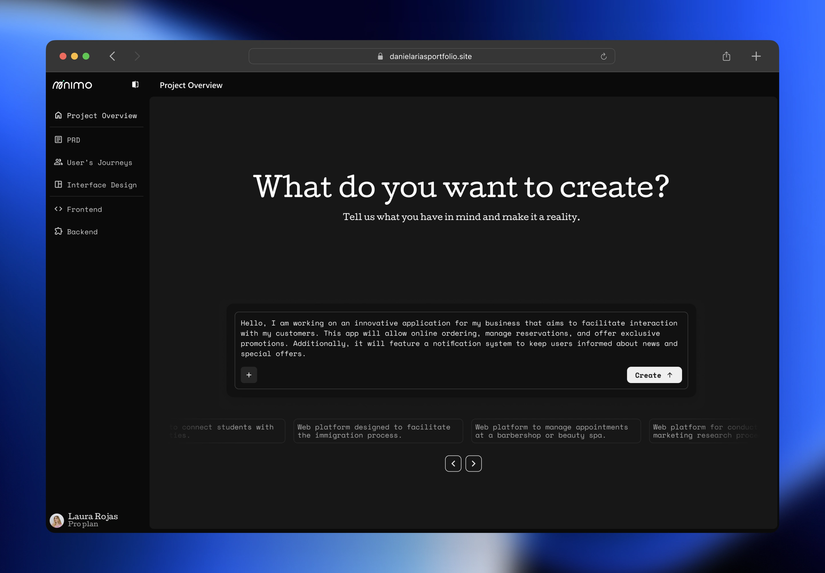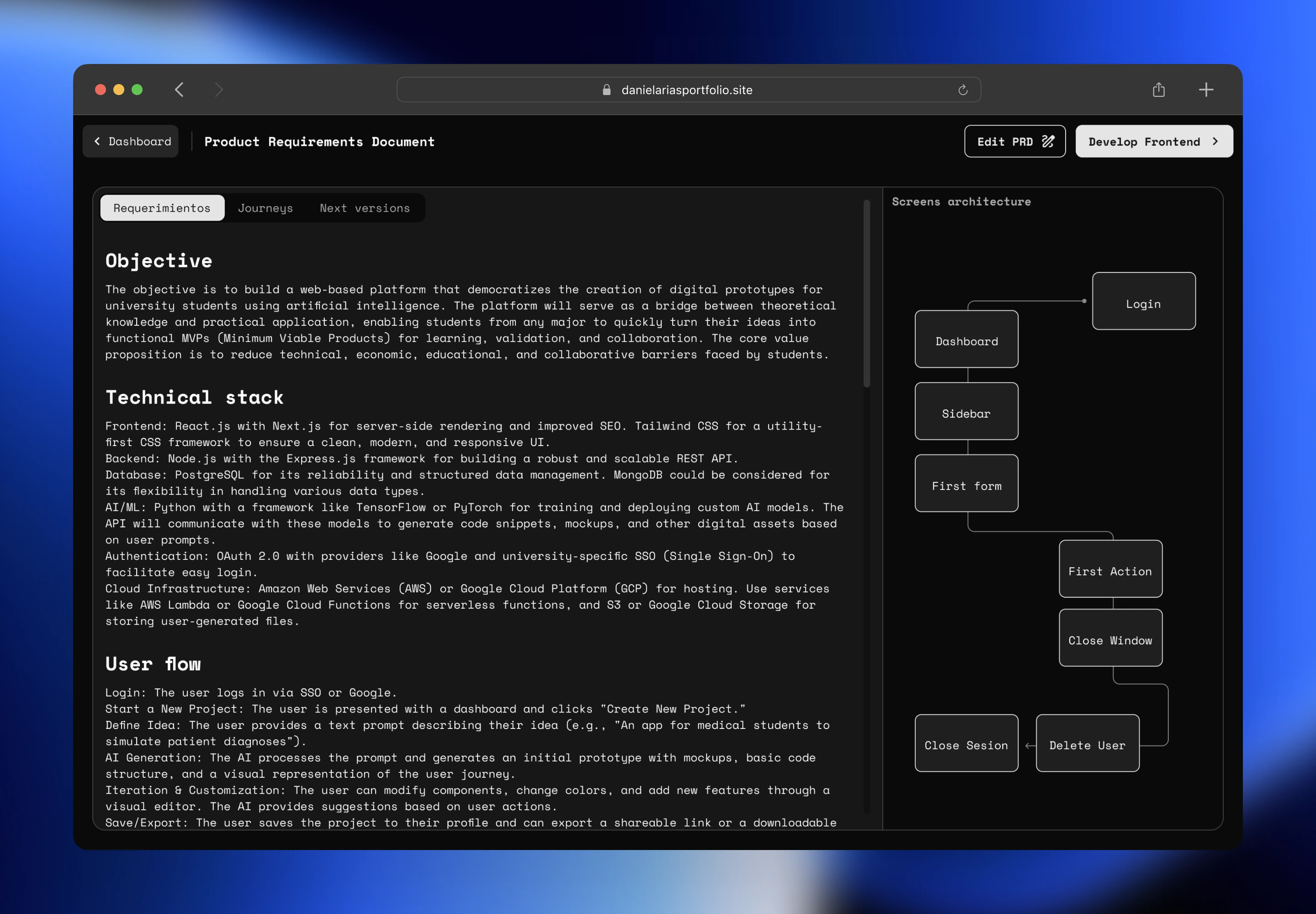 In terms of interface, I chose a dark visual system, monospace typography for technical blocks, and a persistent left navigation that organizes the project into clear sections: Project Overview, PRD, User's Journeys, Interface Design, Frontend, and Backend. The visual structure mirrors the mental structure of the product: every idea has an architecture, and minimo makes it visible.