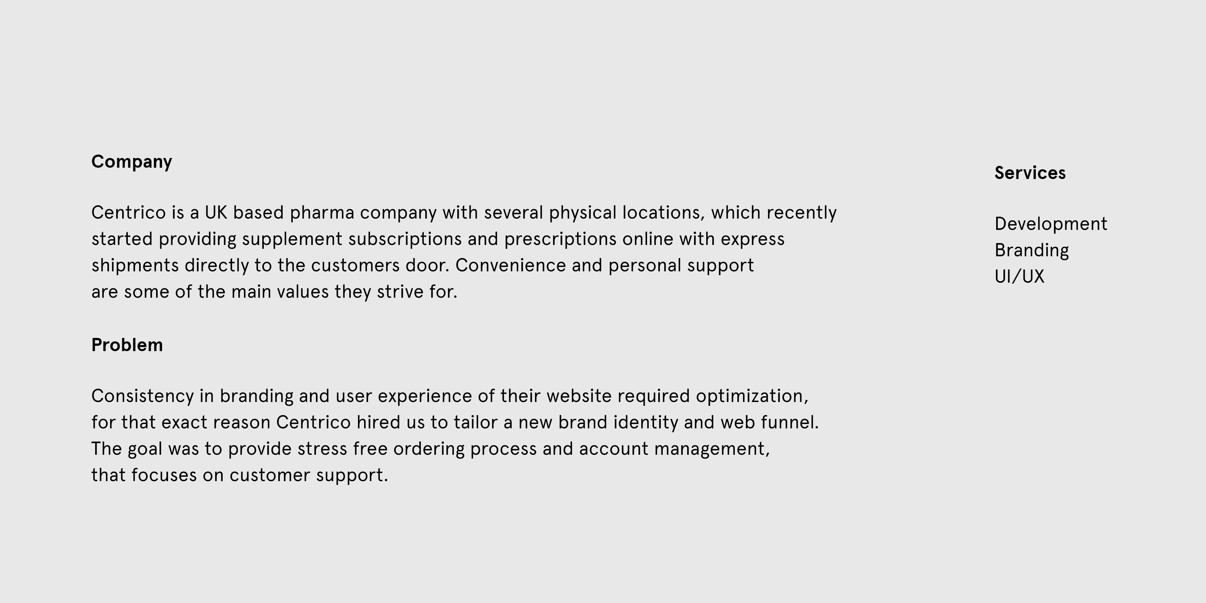 Consistency in branding and user experience of their website required optimization, for that exact reason Centrico hired us to tailor a new brand identity and web funnel. The goal was to provide stress free ordering process and account management, that focuses on customer support.