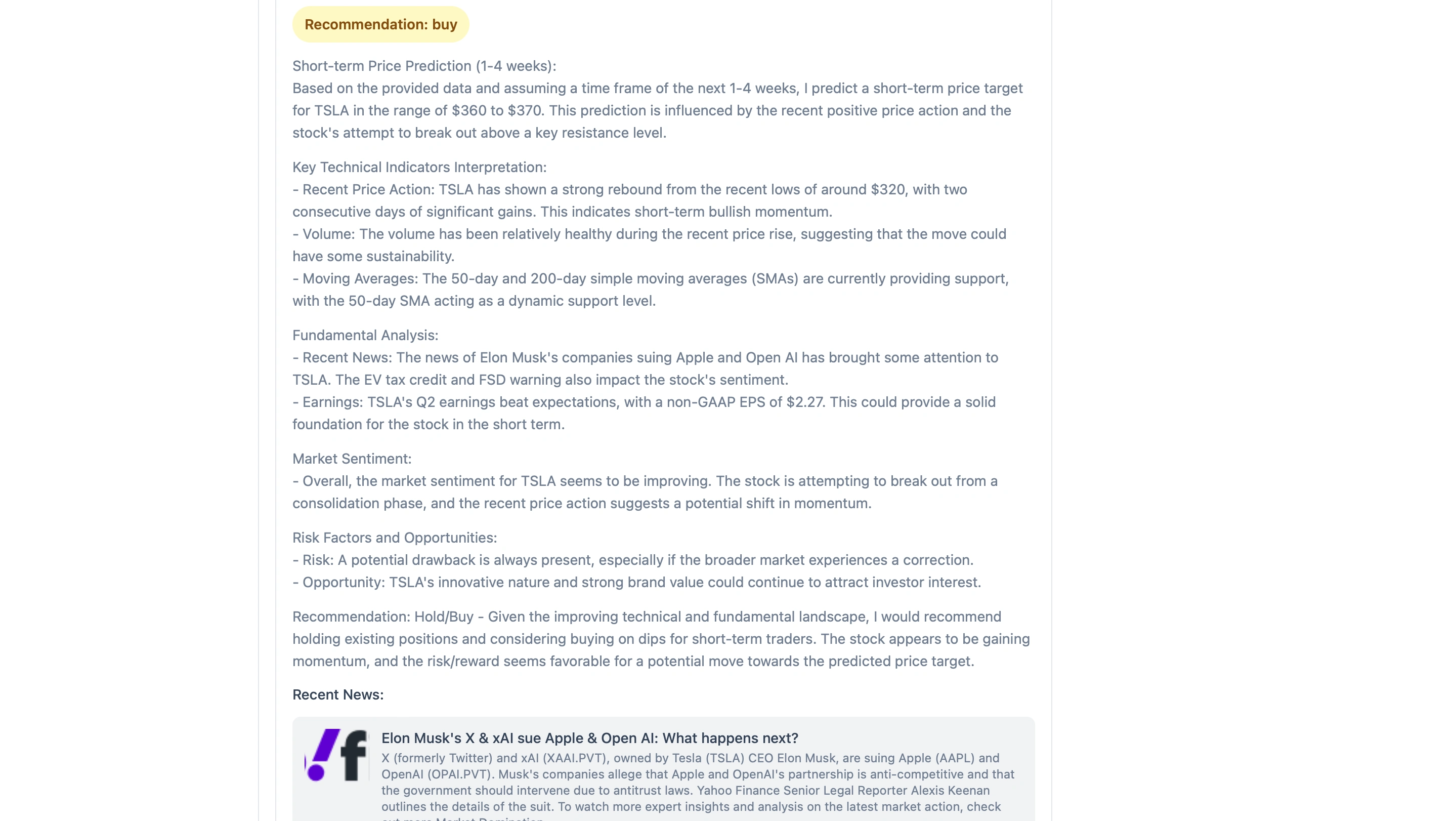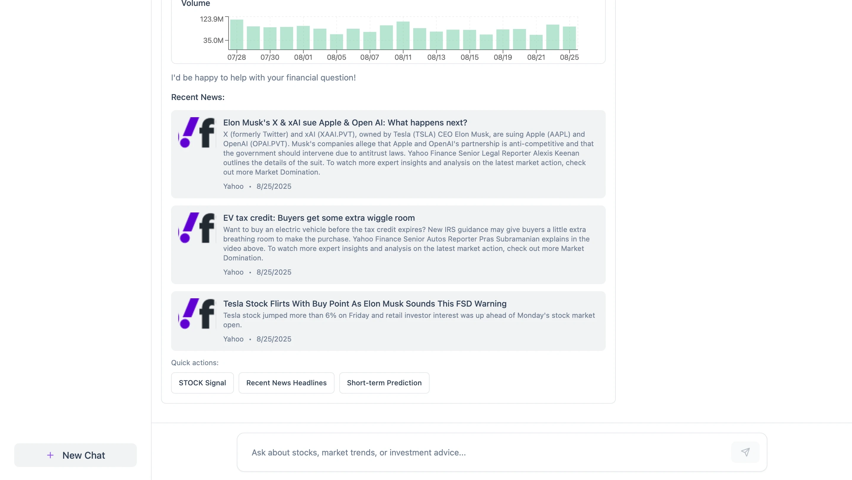 Accessible & Conversational: Simplifies market complexity through chat-based interaction—just ask questions like “Should I sell XYZ today?” and receive a structured response.