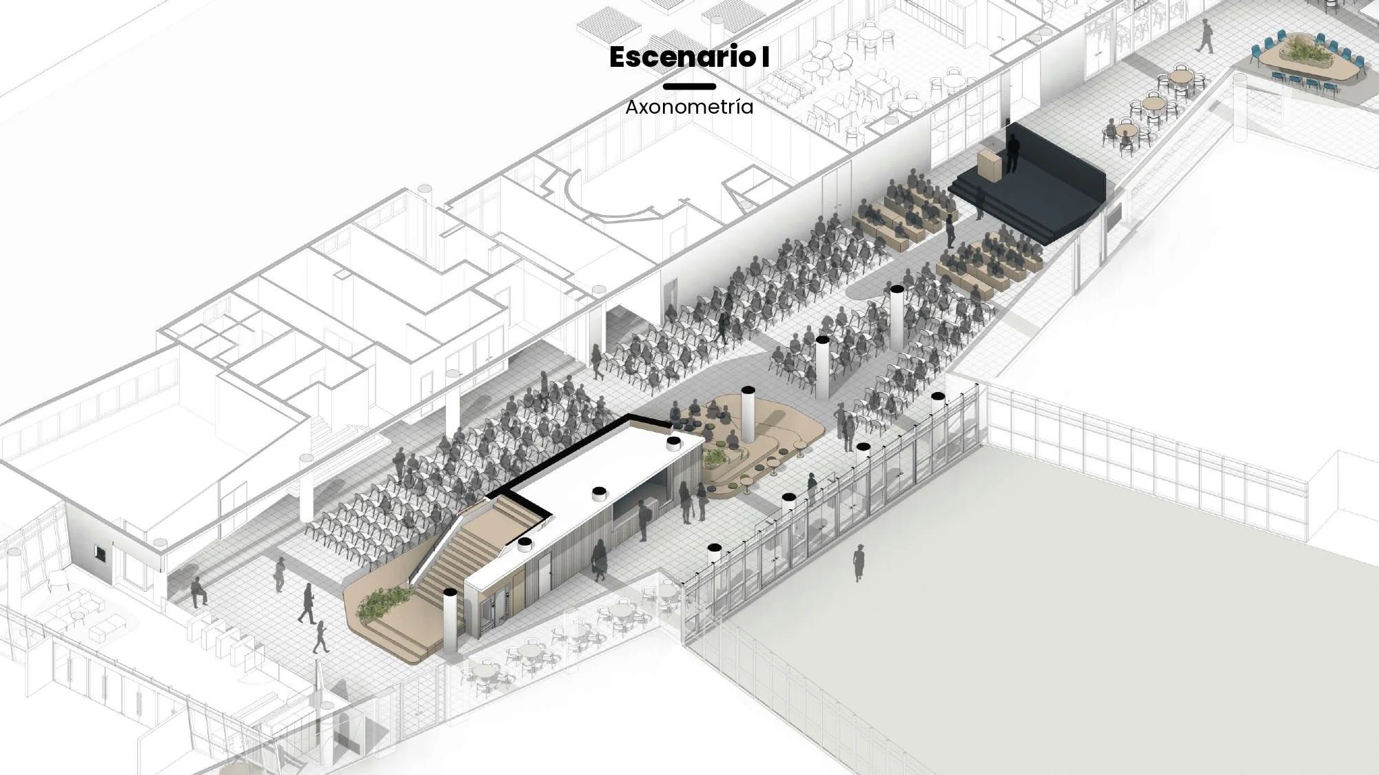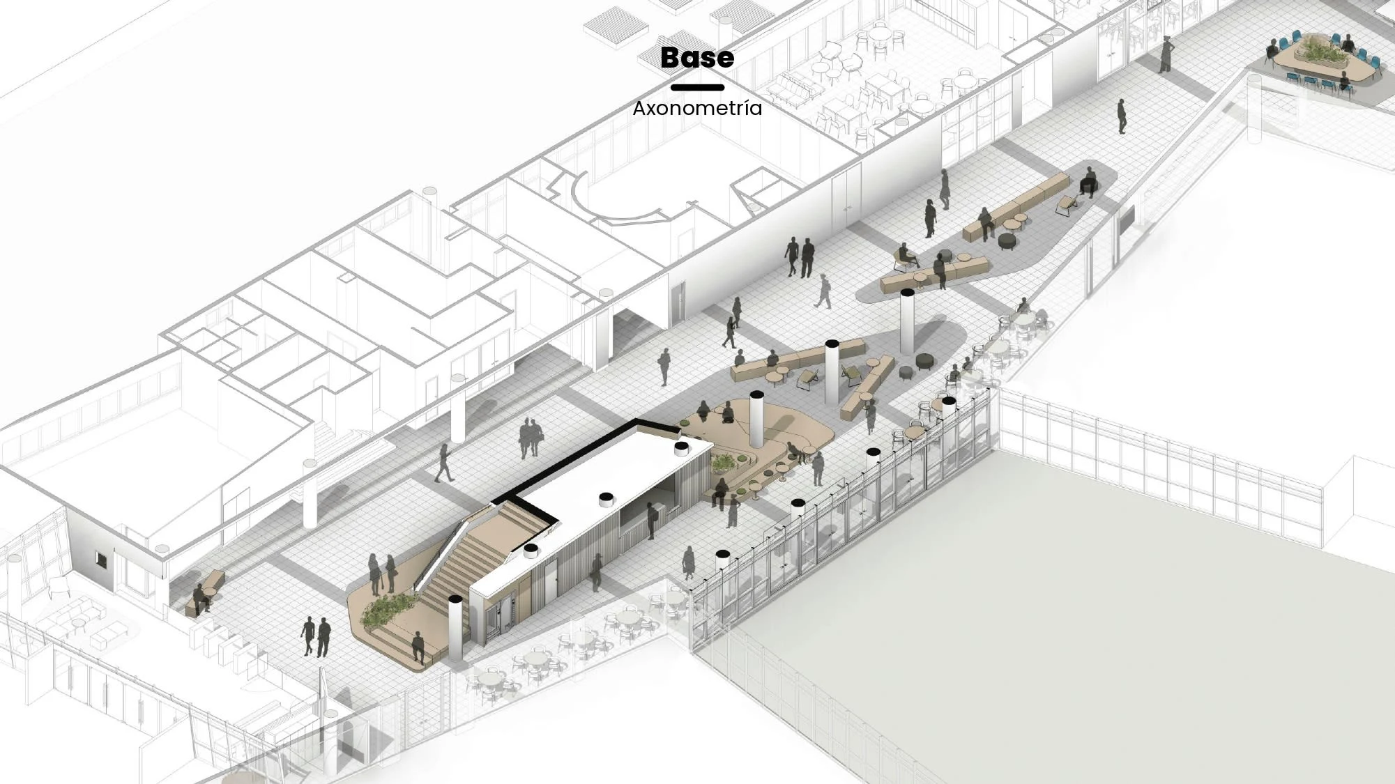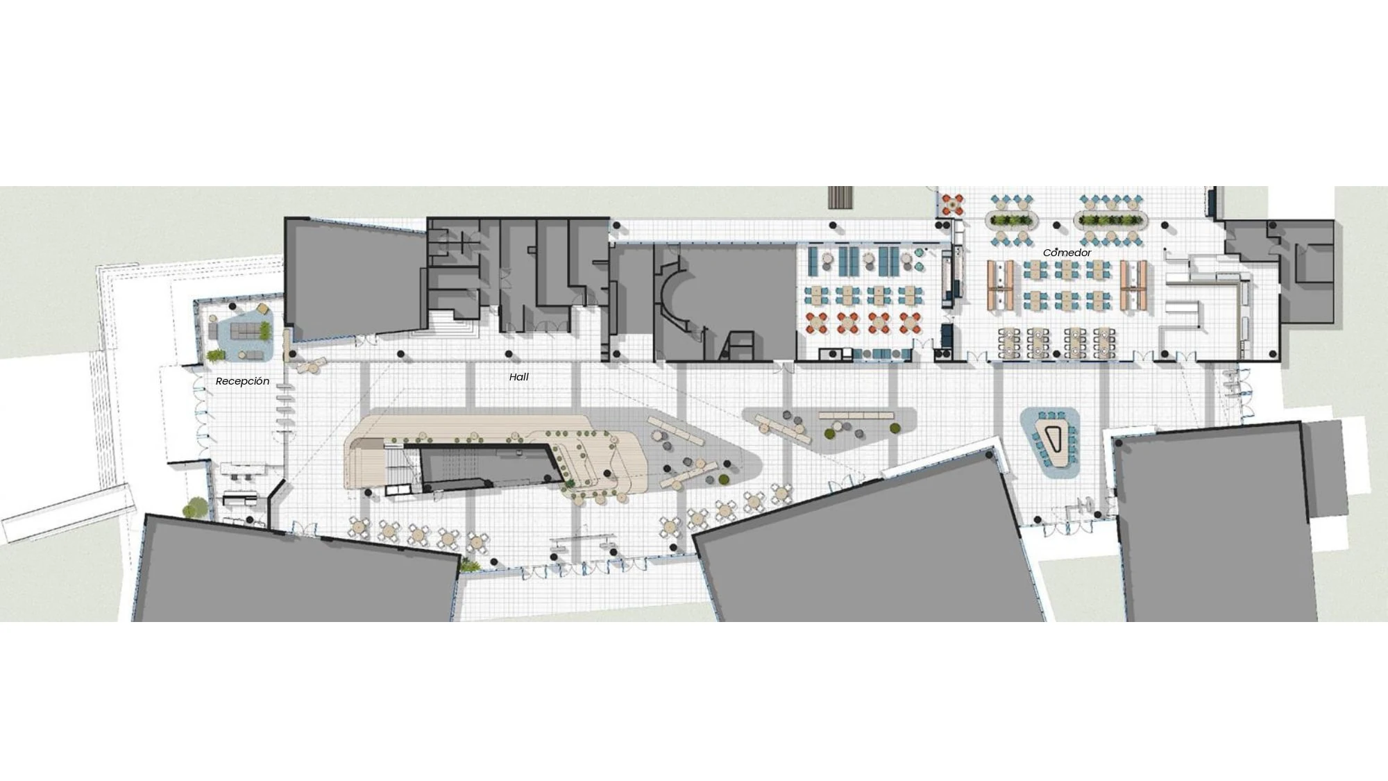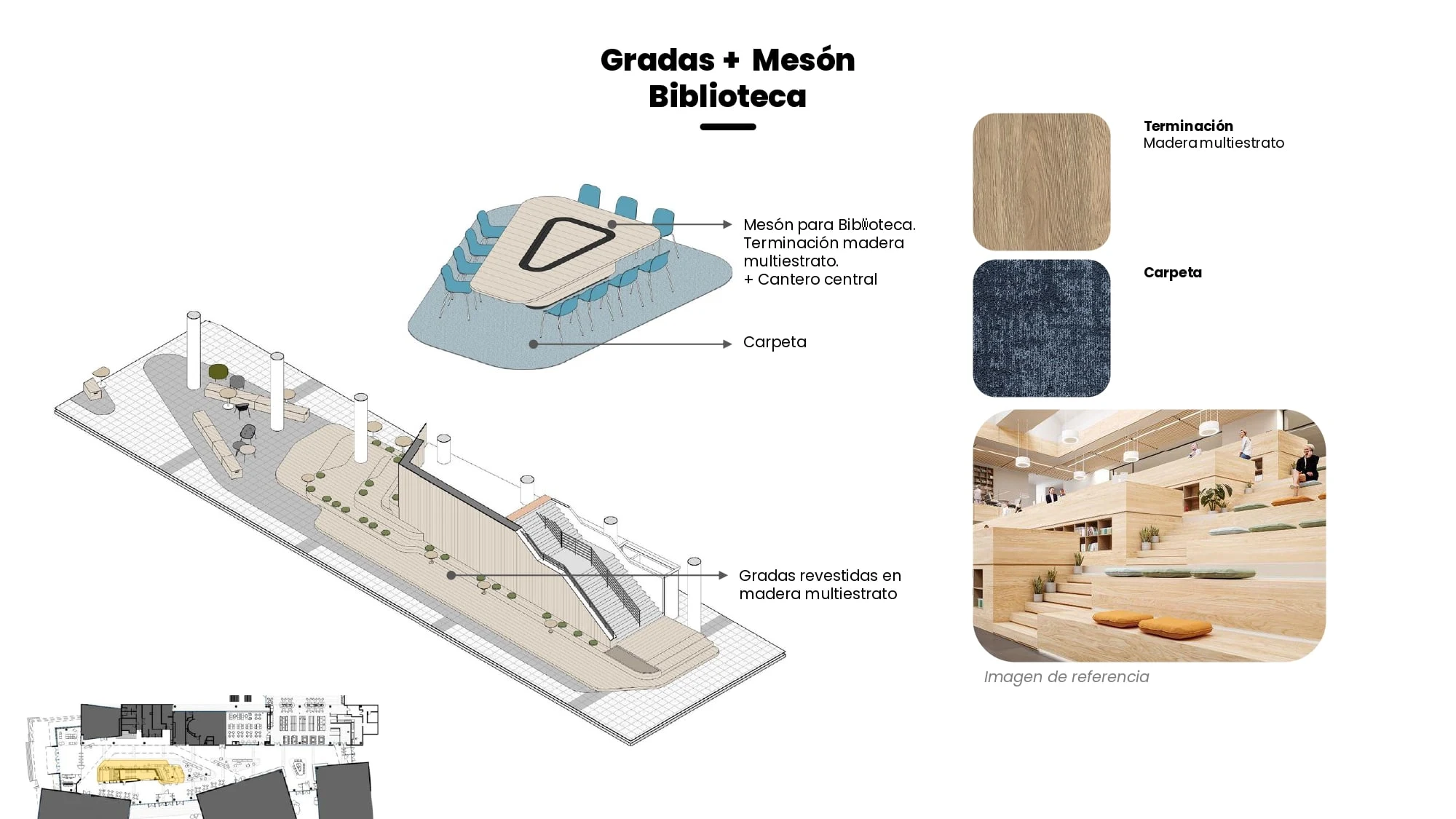 The project aims to revitalize the entrance hall of a university on the outskirts of Buenos Aires. Around the central staircase, a stepped seating structure redefines the space, turning it into a place for gathering and pause.