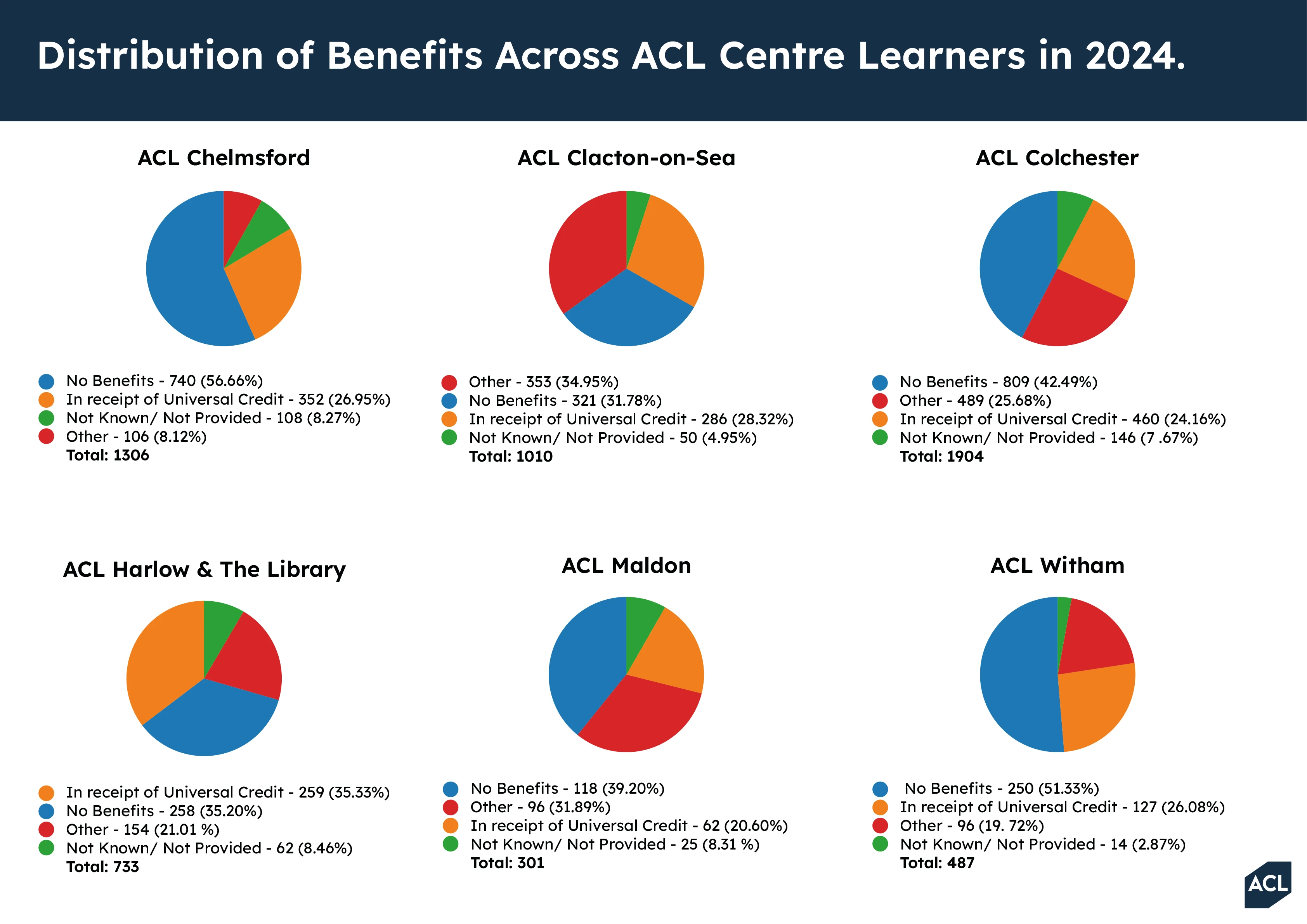 https://conceptualstudio.co.uk/acl-essex-infographics I was commissioned to design a series of infographics for ACL Essex, aimed at presenting key learner data across multiple delivery centres in a clear and accessible format. The work involved visualising complex internal data sets relating to benefit status, employment status, ethnicity, and geographic distribution of learners during 2024.