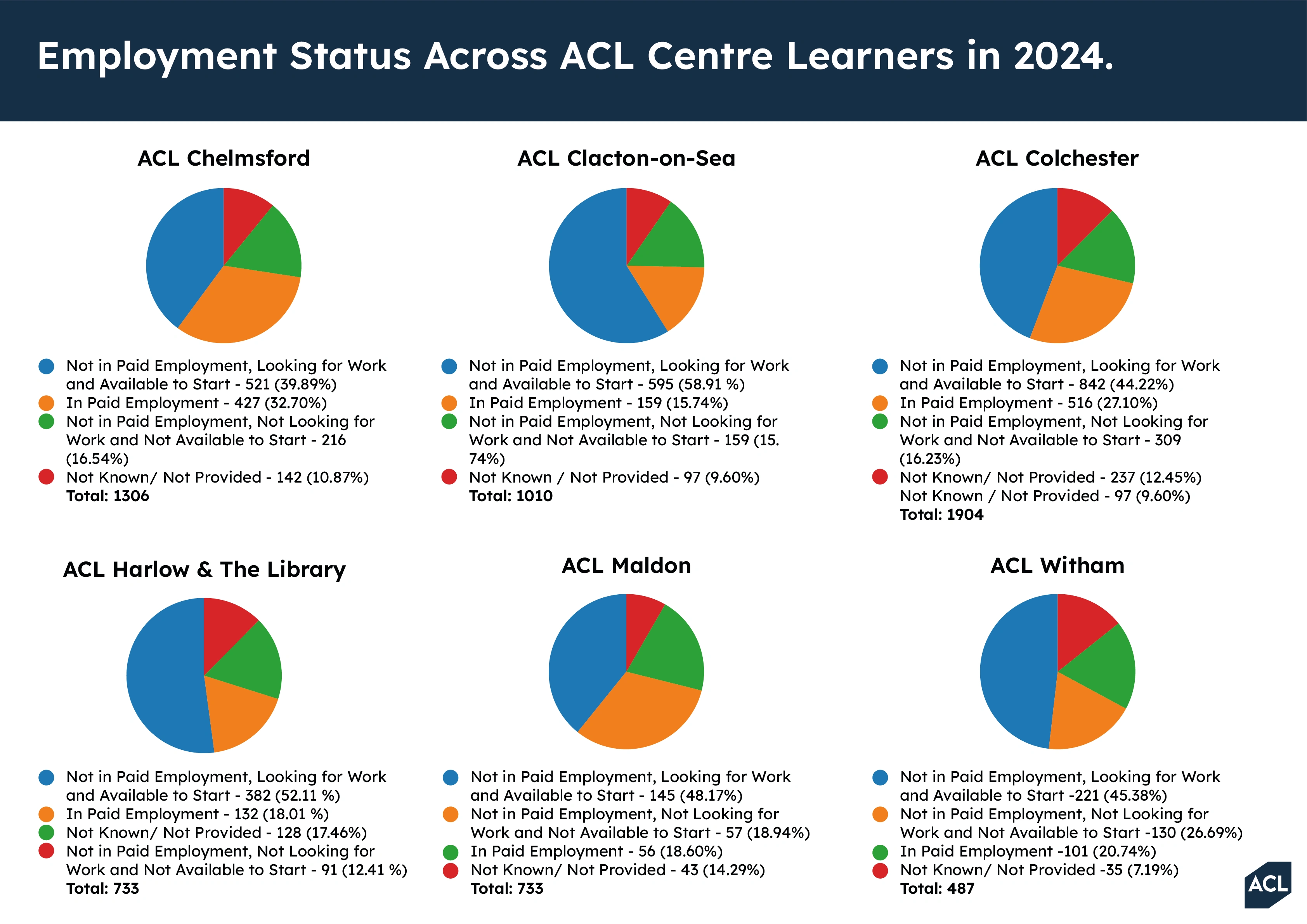Various Pie Charts Showing Distribution of Employment Status Across ACL Centres in 2024. Data & Copy Provided by ACL.