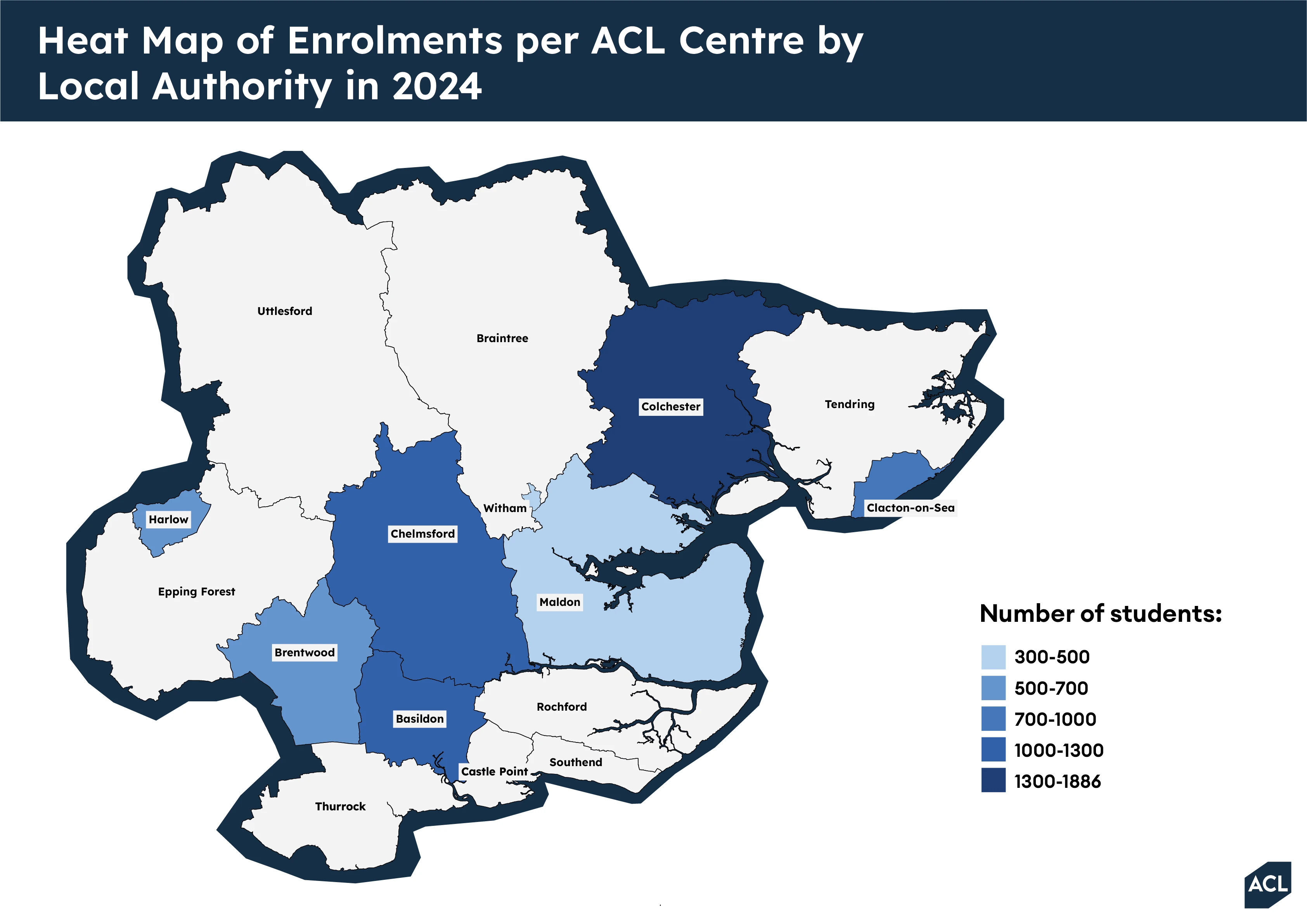 Heat Map, Showing All the Number of Students at Each ACL Centre by Local Authority. Adjusted Typefaces to Align with ACL's Branding. Copy & Data were Provided by ACL.