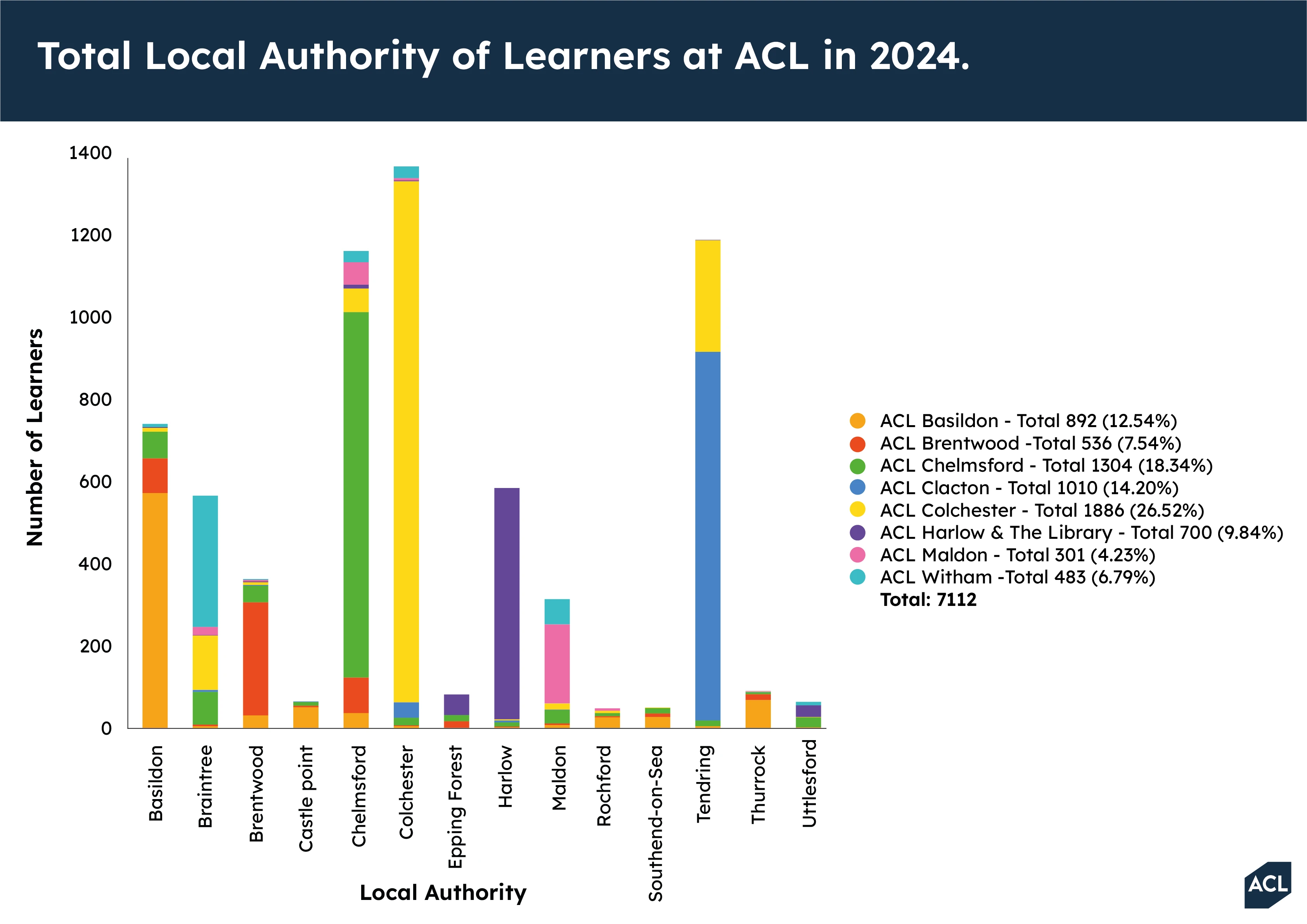 Bar Chart Showing Total Local Authority of Learners at ACL in 2024. Data & Copy Provided by ACL.