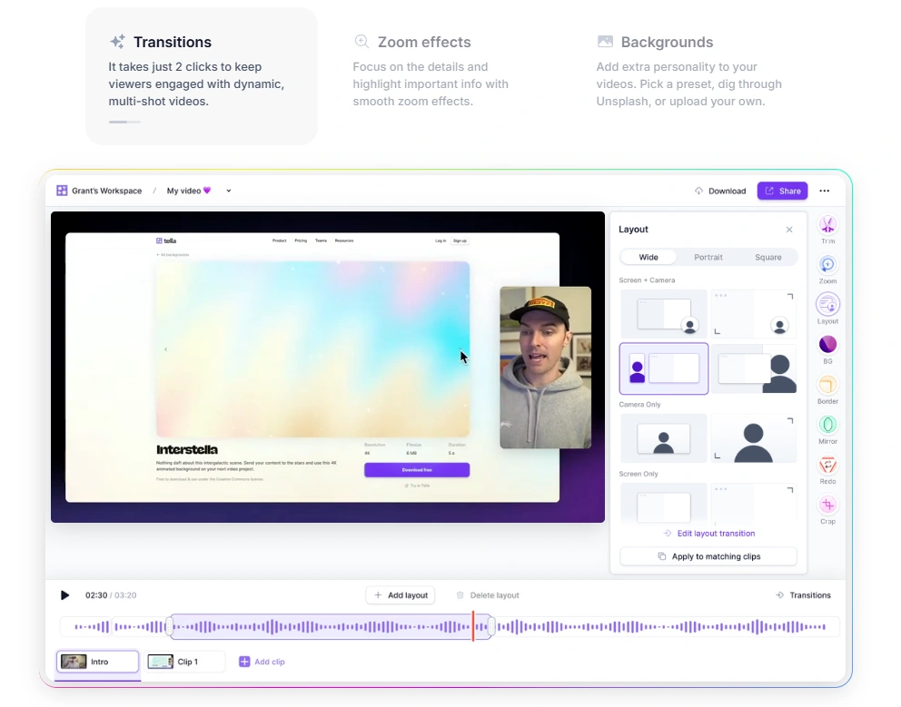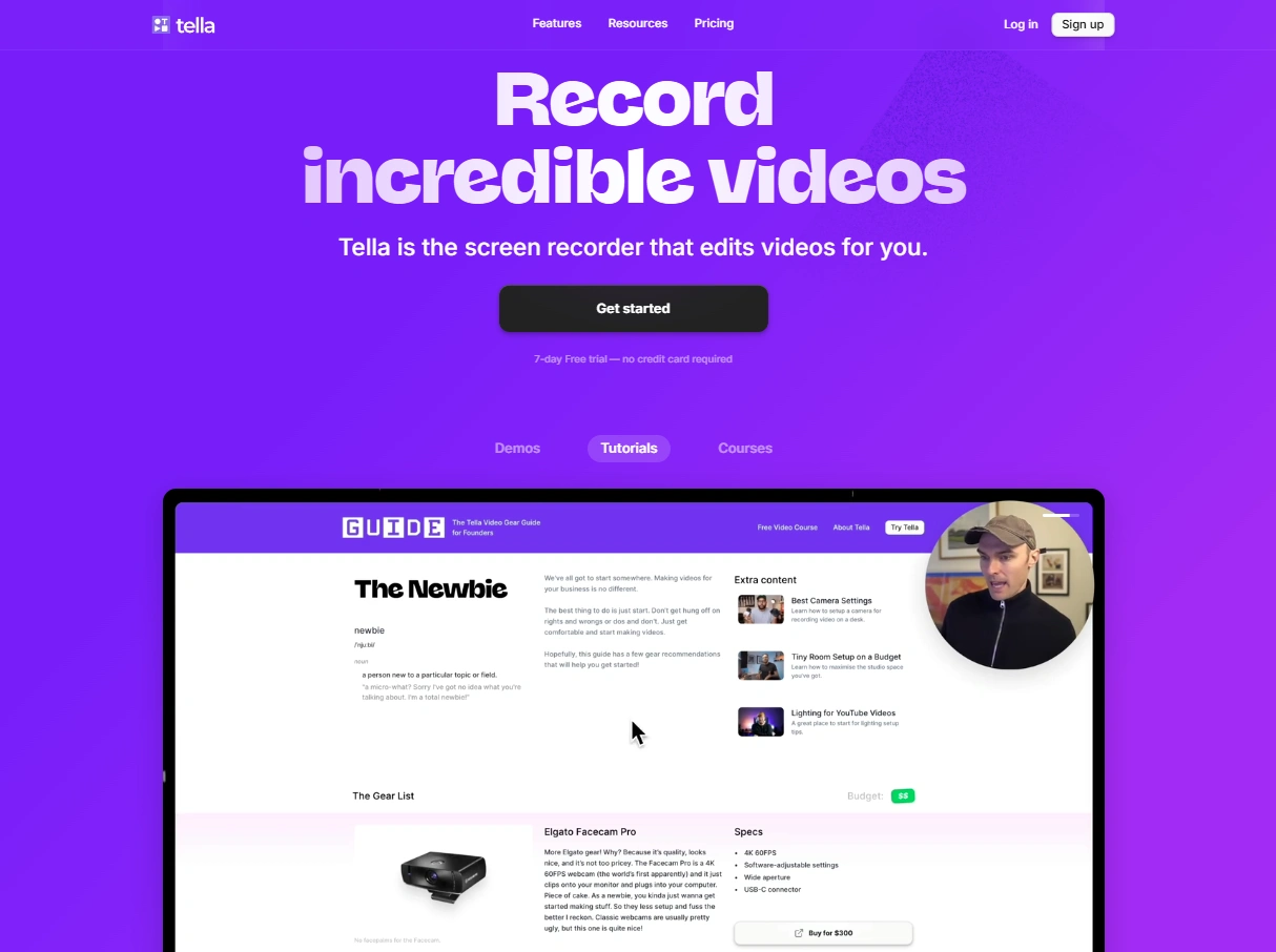 Framer build for Tella, the screen recorder that “edits videos for you.” The site showcases Tella’s clip‑based recording, effortless editing, and AI tools that remove silences and filler words—helping founders, creators, and teams produce professional videos fast. Clear calls to action emphasize a 7‑day free trial (no card), with demos that prove you can “Make a Tella video in under 60 seconds.”