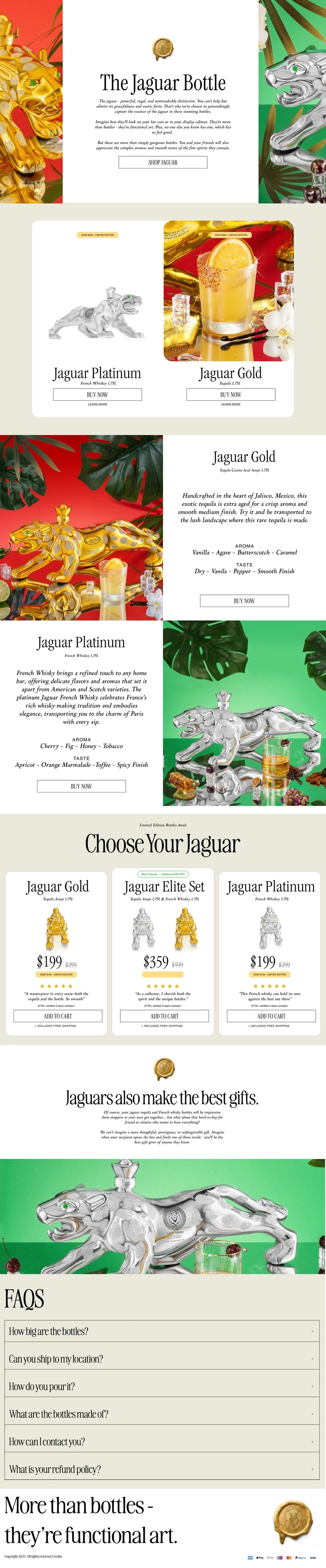 Try Jaguar is a premium brand offering whiskey and tequila for the one who appreciate functional art. Each bottle is truly unique experience to not only have the bottle to look good on your car cart, but also by the complex aromas and smooth taste of the spirit they contain.