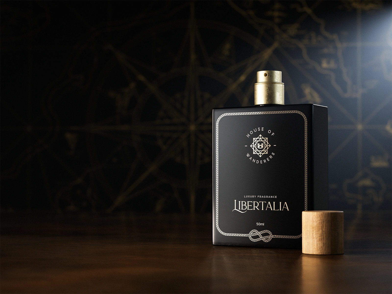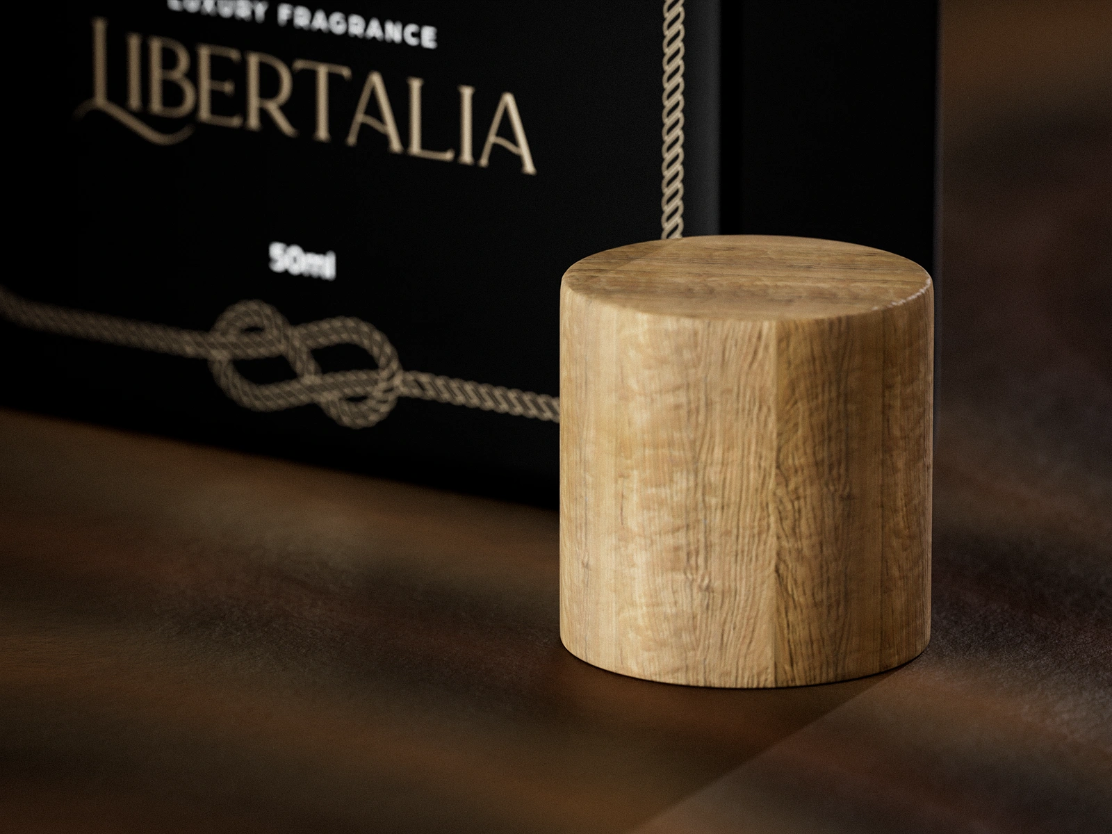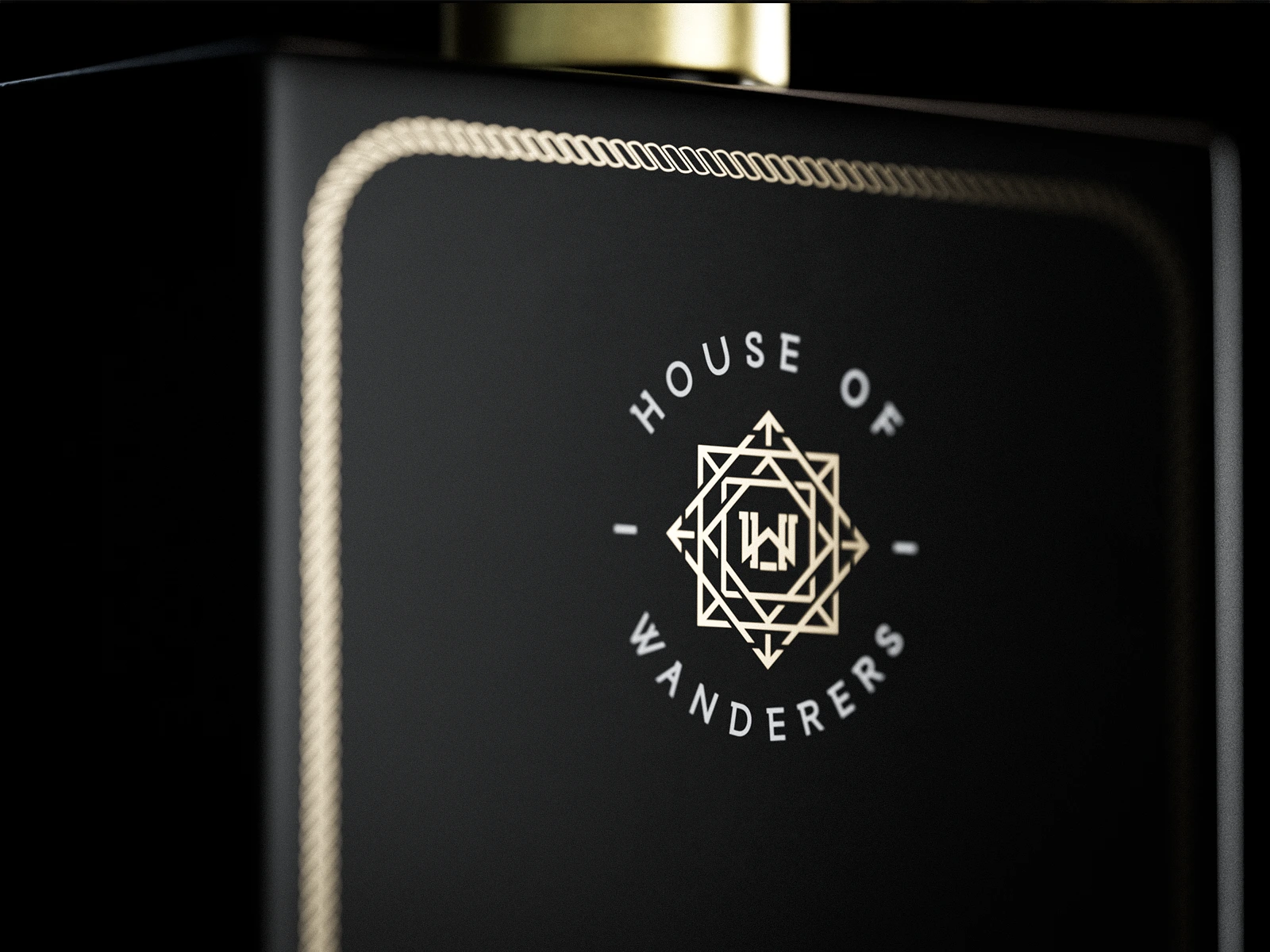 Luxury fragrance brand identity and packaging design with custom logo, emblem, and premium materials, shown in high-end 3D renders.