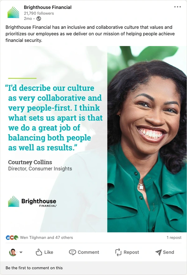 Amidst the pandemic, Brighthouse Financial underwent a transformative shift, transitioning into a fully remote company with the added option of a hybrid work model. Recognizing this as a significant enhancement to the array of perks offered by Brighthouse, we initiated a dynamic digital-first campaign. This campaign, comprising videos, social media posts, and ads, serves as a strategic tool to peak the interest of potential talent contemplating the prospect of joining Brighthouse. It stands as a compelling and innovative recruitment initiative.
