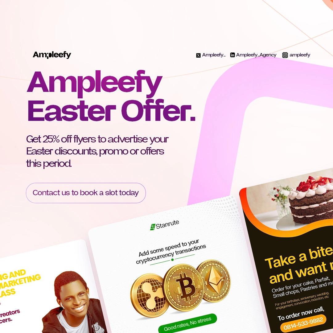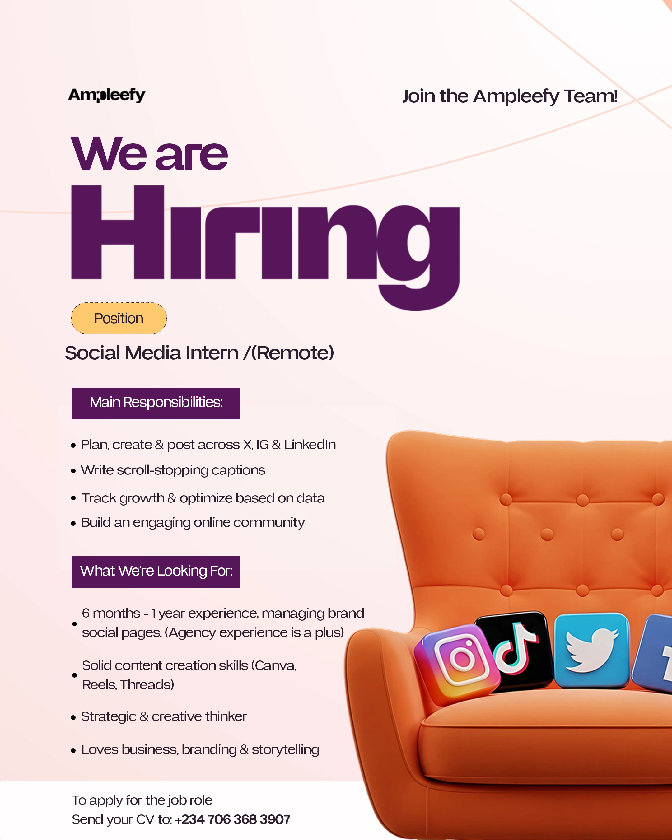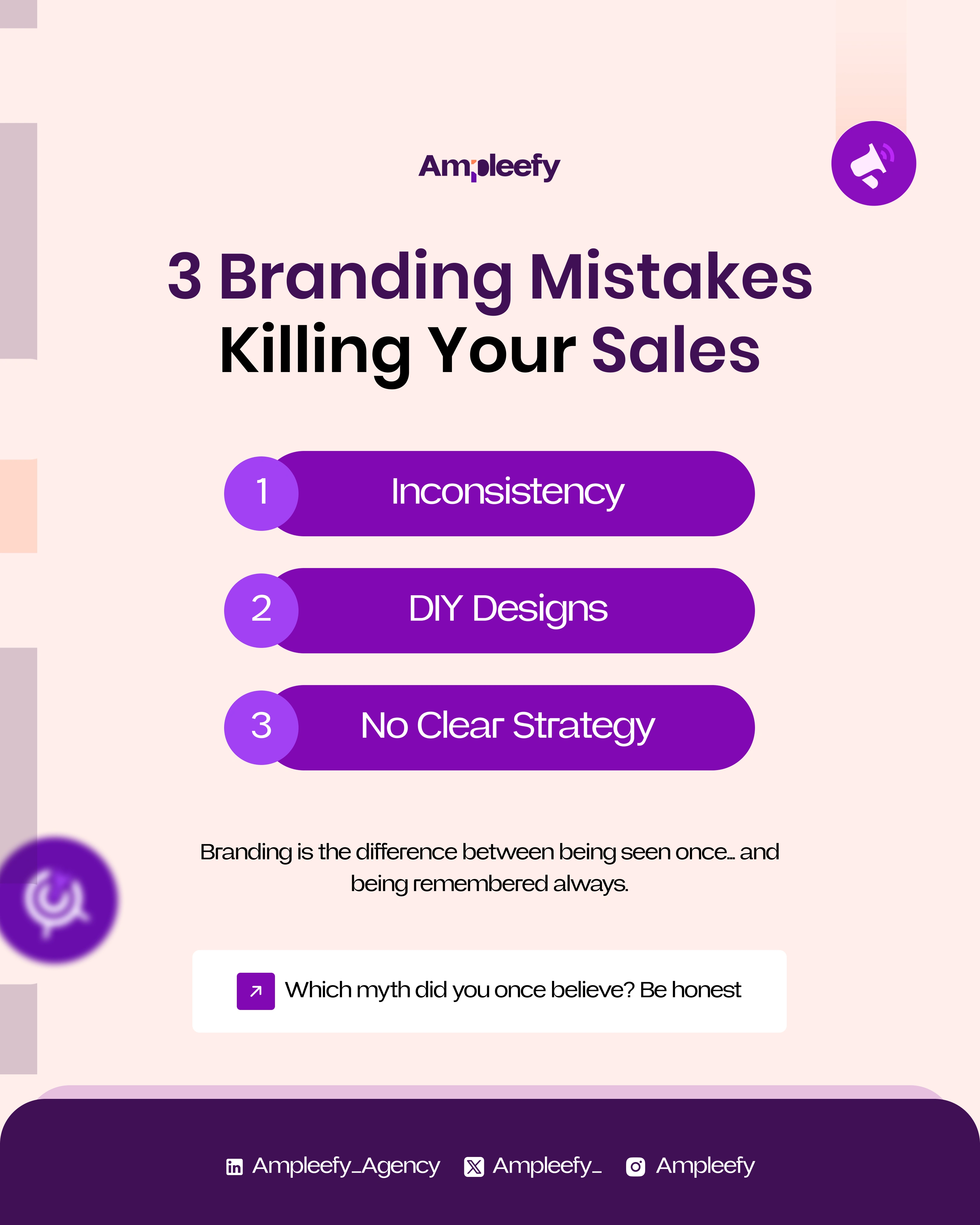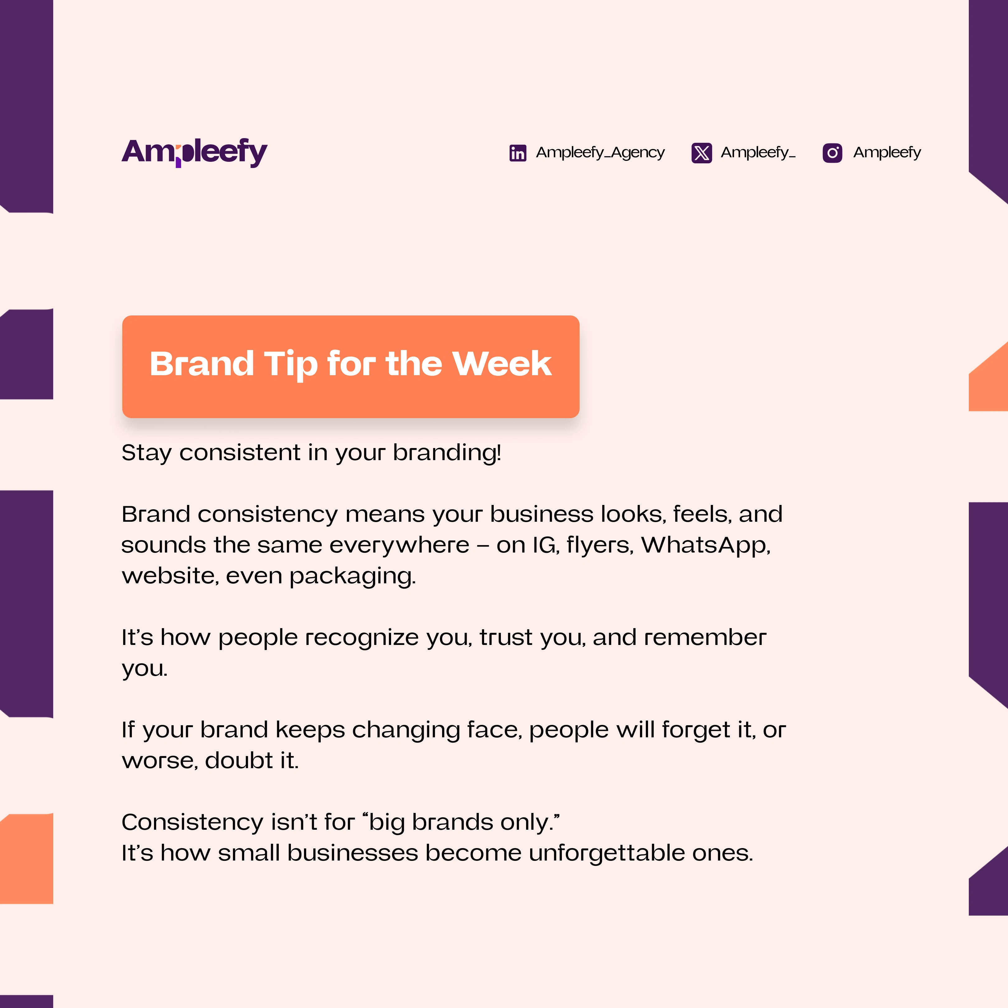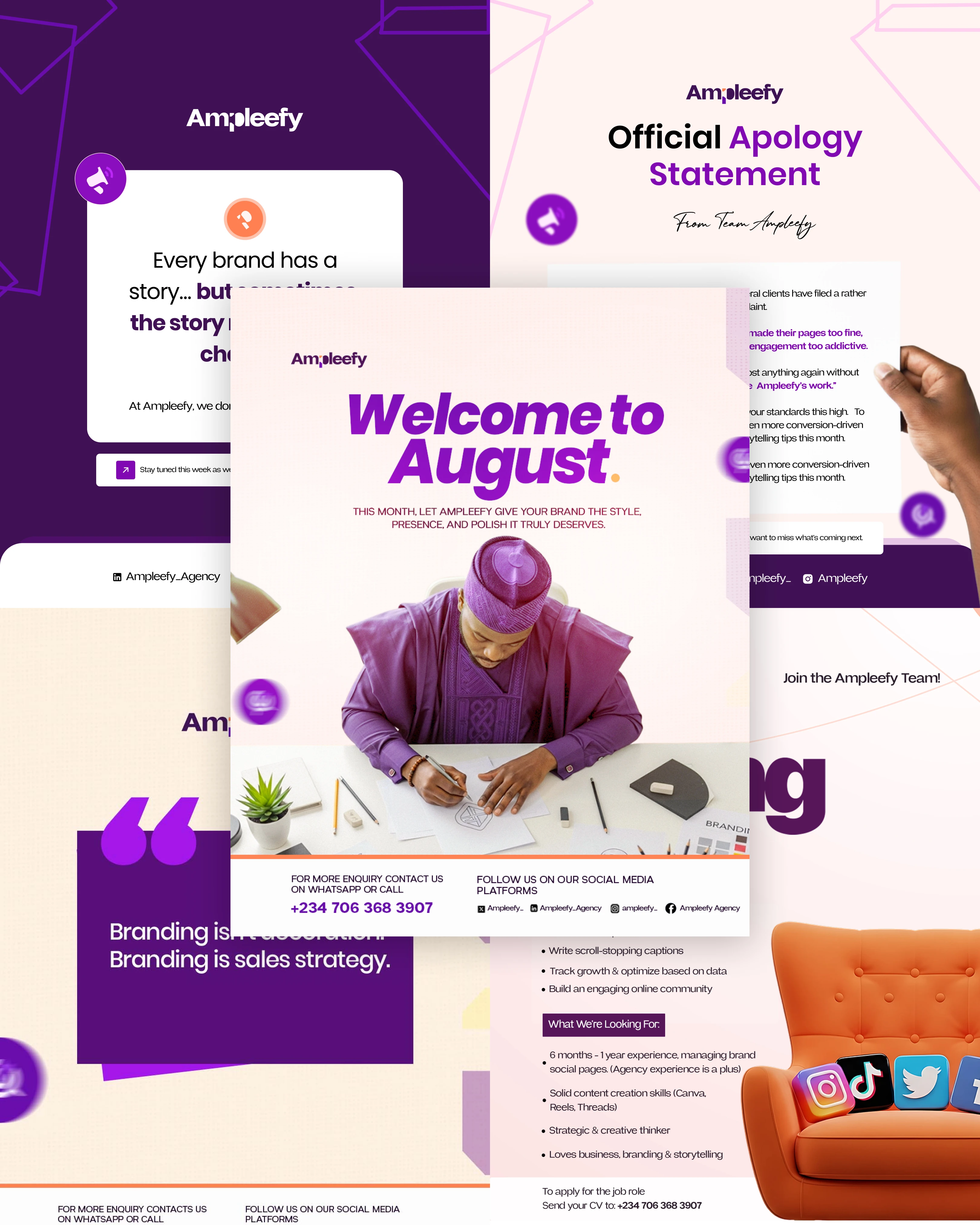 Project Description: Ampleefy - Strategic Content & Brand Storytelling The Client: Ampleefy, a social media and marketing agency. The Goal: To design a variety of high-impact social media assets that demonstrate the agency’s expertise in brand storytelling, strategic thinking, and handling sensitive corporate communications. My Solution (Creative Strategy): Consistent Aesthetic: Developed a bold, sophisticated brand look using deep purple and clean typography that is highly recognizable and "scroll-stopping." Diverse Content: Demonstrated versatility by designing thematic content (Welcome to August), strategic messaging (Branding is sales strategy), and formal documents (Official Apology Statement). Visual Depth: Used mockups and compositing (like the central desk layout) to add visual depth and professionalism to the digital assets. Clear CTAs: Incorporated clear contact information and social handles across the materials for easy engagement.