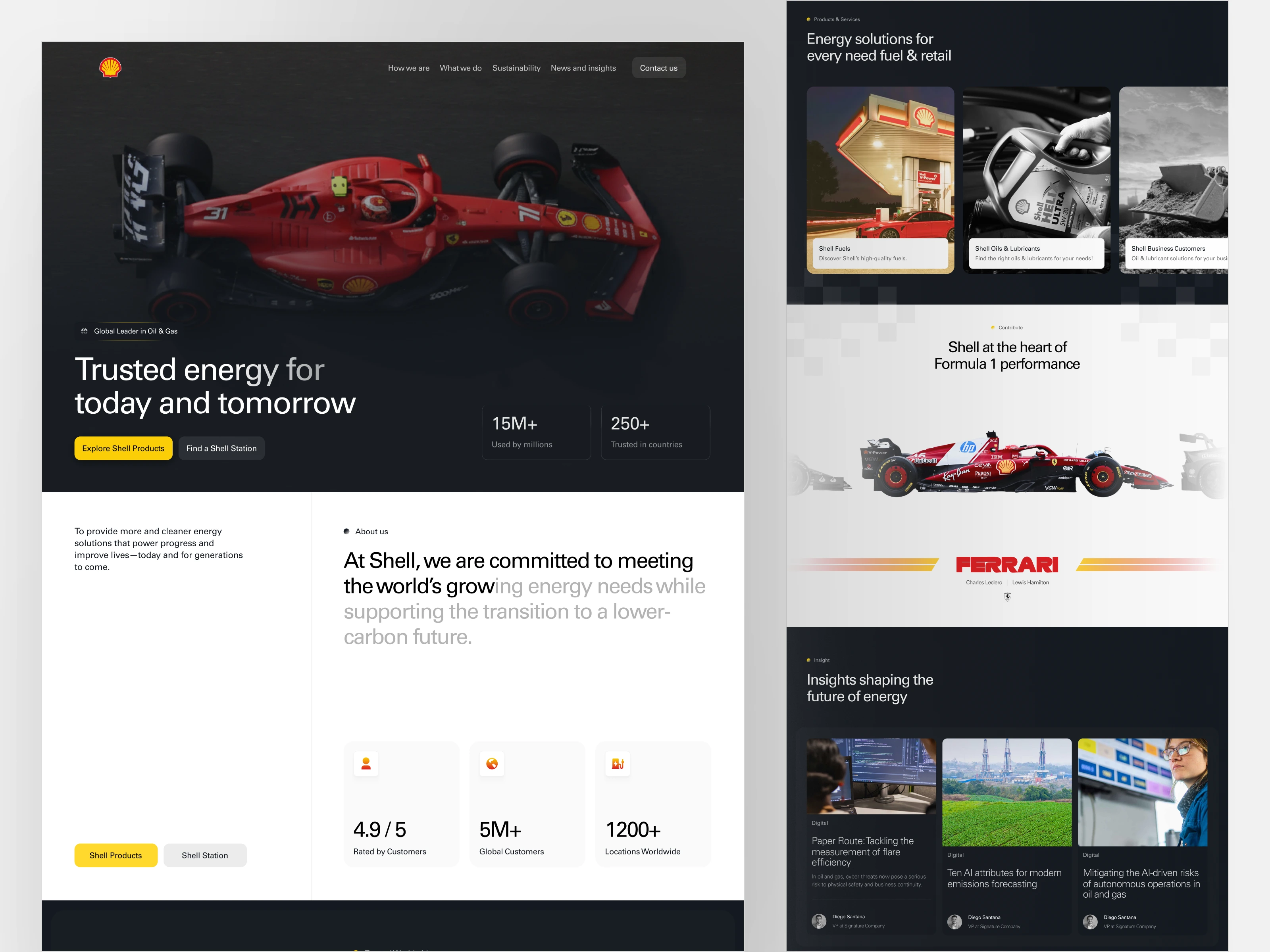 This concept blends strong visual contrast, dynamic layouts, and structured content blocks to communicate innovation, sustainability, and energy leadership. From product solutions to Formula 1 partnerships, the design balances corporate credibility with modern digital aesthetics.