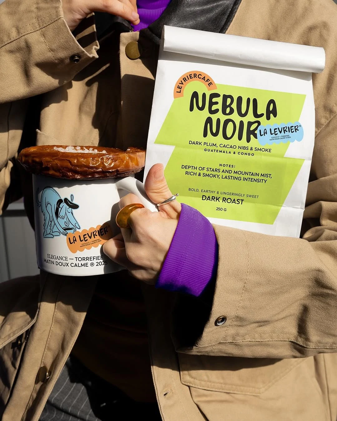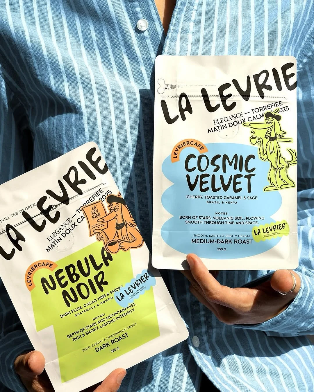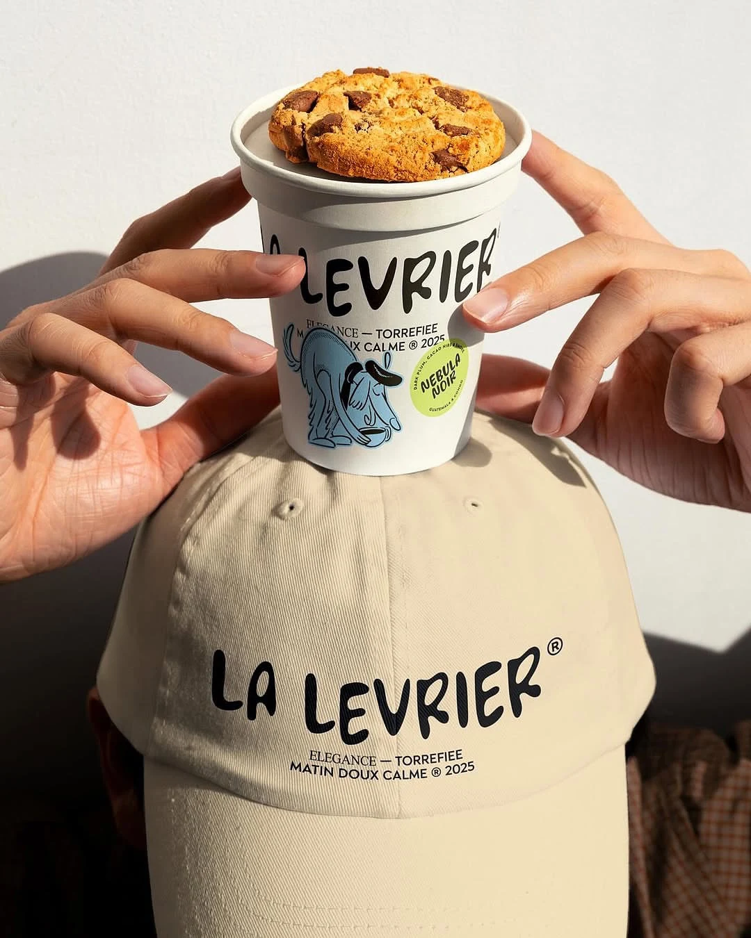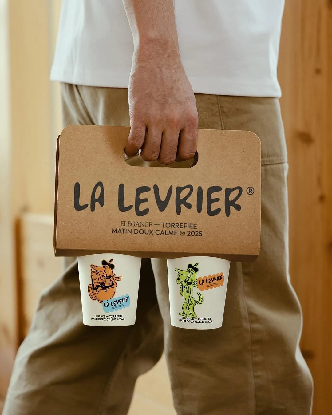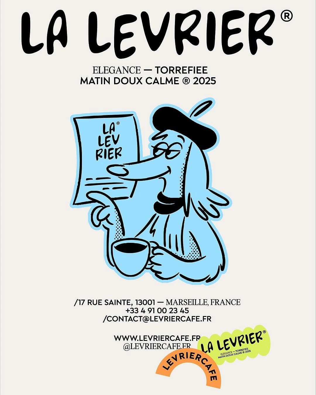 Branding for La Levrier café in Marseille, blending elegance, wit, Afghan Hound mascot, retro colors, and bold typography for a unique visual identity.