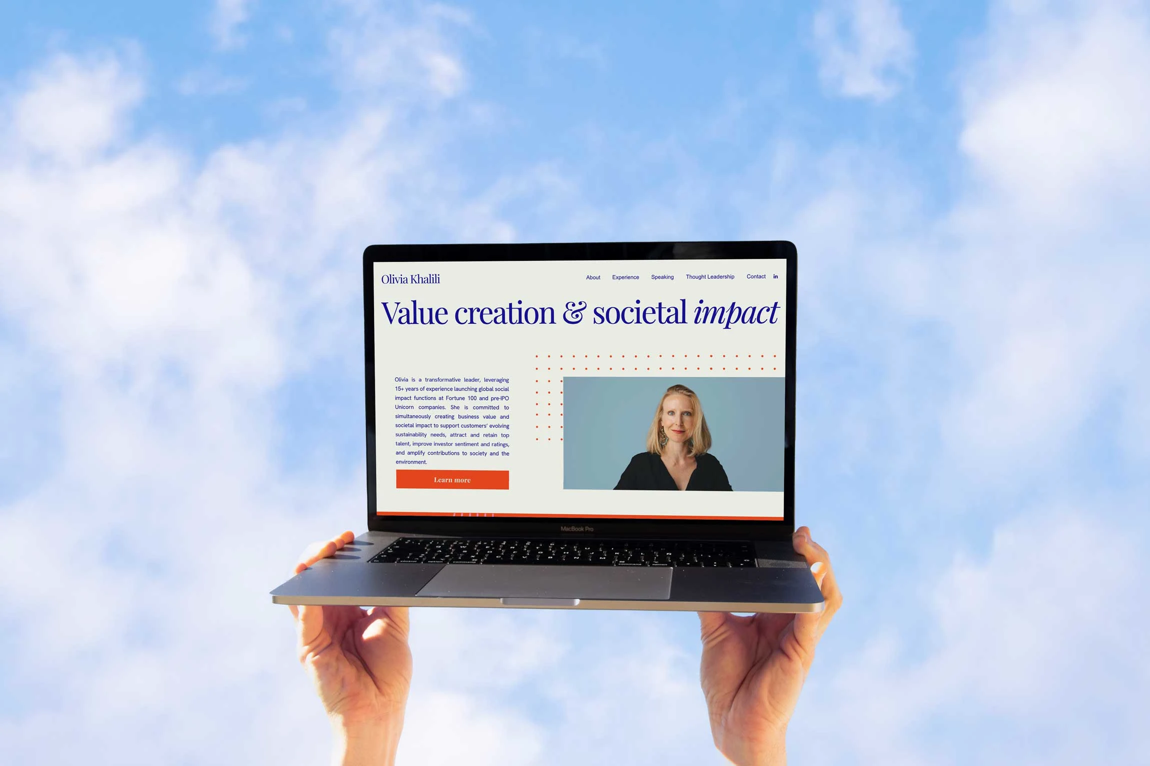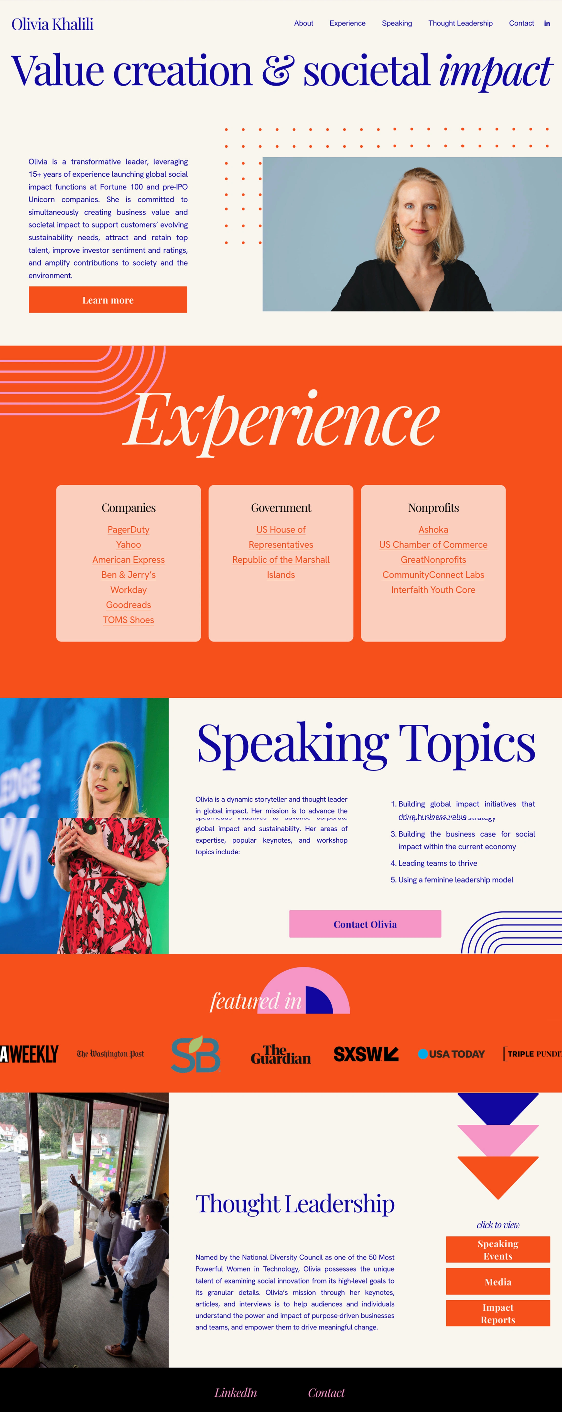 We partnered with Khalili to refine her personal brand, curating a dynamic color palette and font pairing aligned with her leadership style. The challenge involved distilling her multifaceted career into a visually engaging landing page. The collaboration resulted in a striking online presence that seamlessly combines aesthetics and substance, reflecting Olivia's leadership ethos and positioning her for impactful collaborations and speaking engagements.