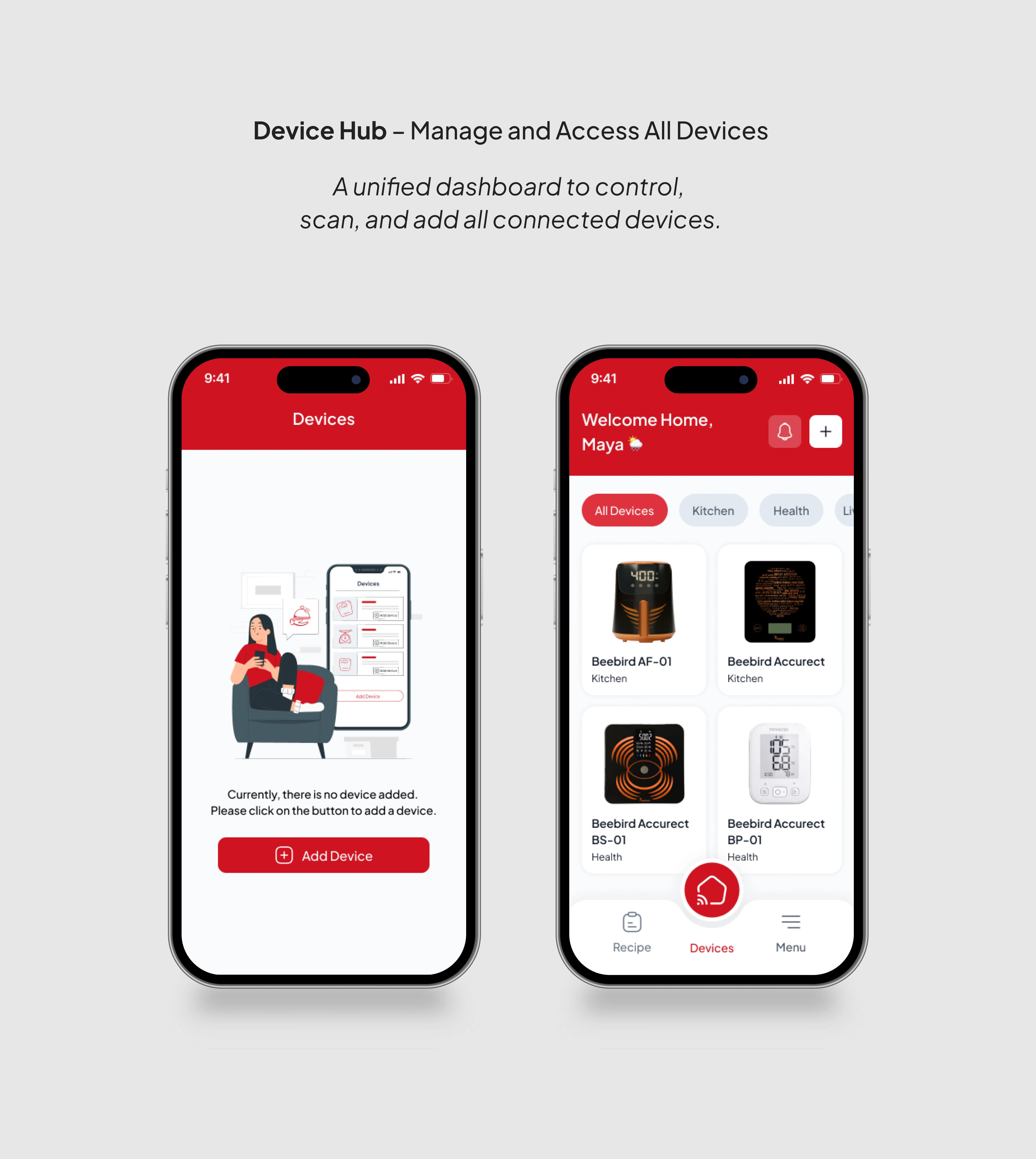 → The Beebird app consolidates multiple smart devices—including an air fryer, smart kitchen scale, body scale, and glucometer—into a single, intuitive platform. Each device has a unique homepage within the app for tailored user interaction, allowing users to seamlessly manage and monitor all devices from a single dashboard. Below, I’ve included a selection of pages that highlight the app’s cohesive, user-friendly design.