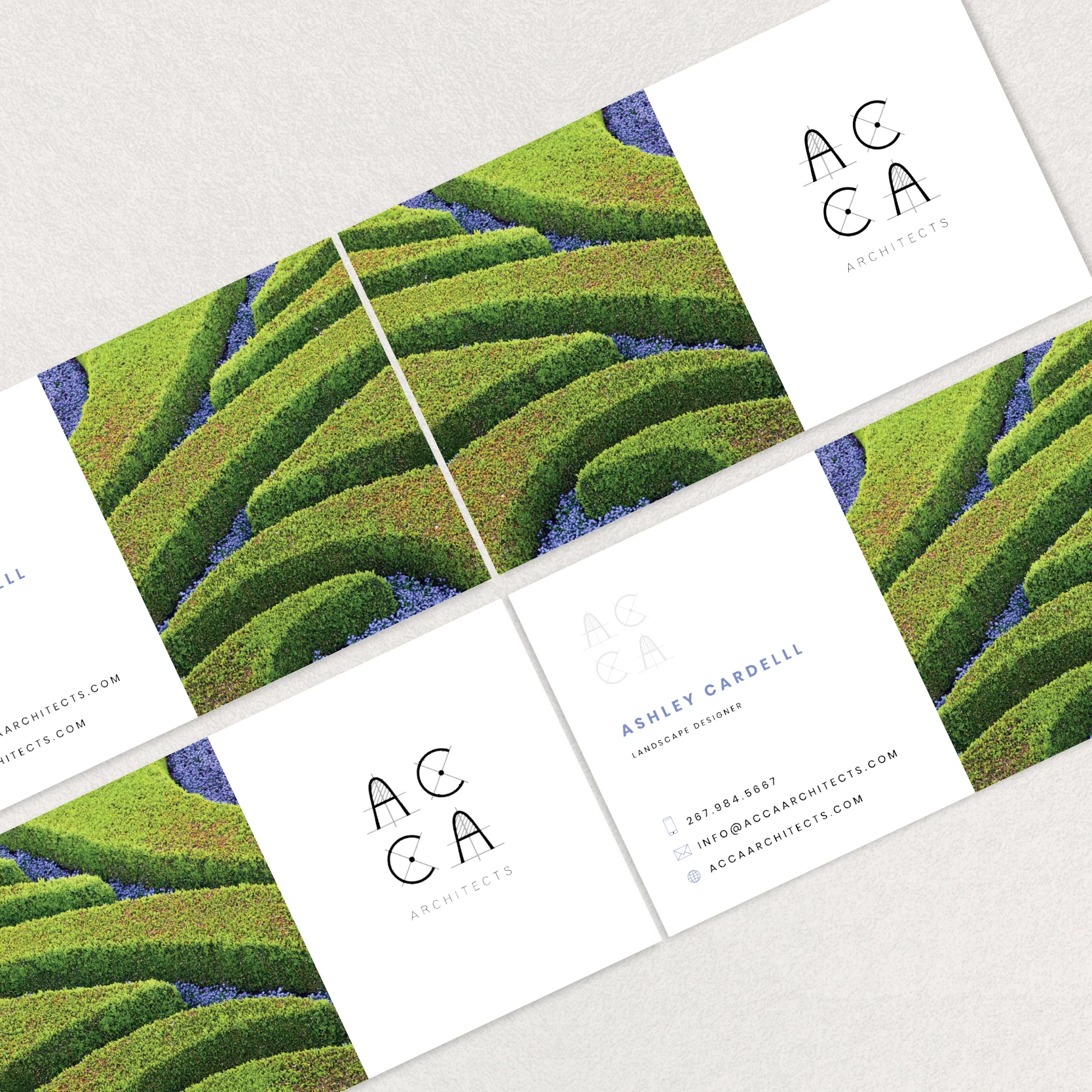A visual identity for an architectural and landscape design firm. The logo draws inspiration from architectural drafting, using clean geometry and fine structural lines to convey precision and research-driven thinking. Landscape imagery on the business cards was introduced to balance this technical rigor with a strong connection to nature, creating an identity that bridges built forms and environment.