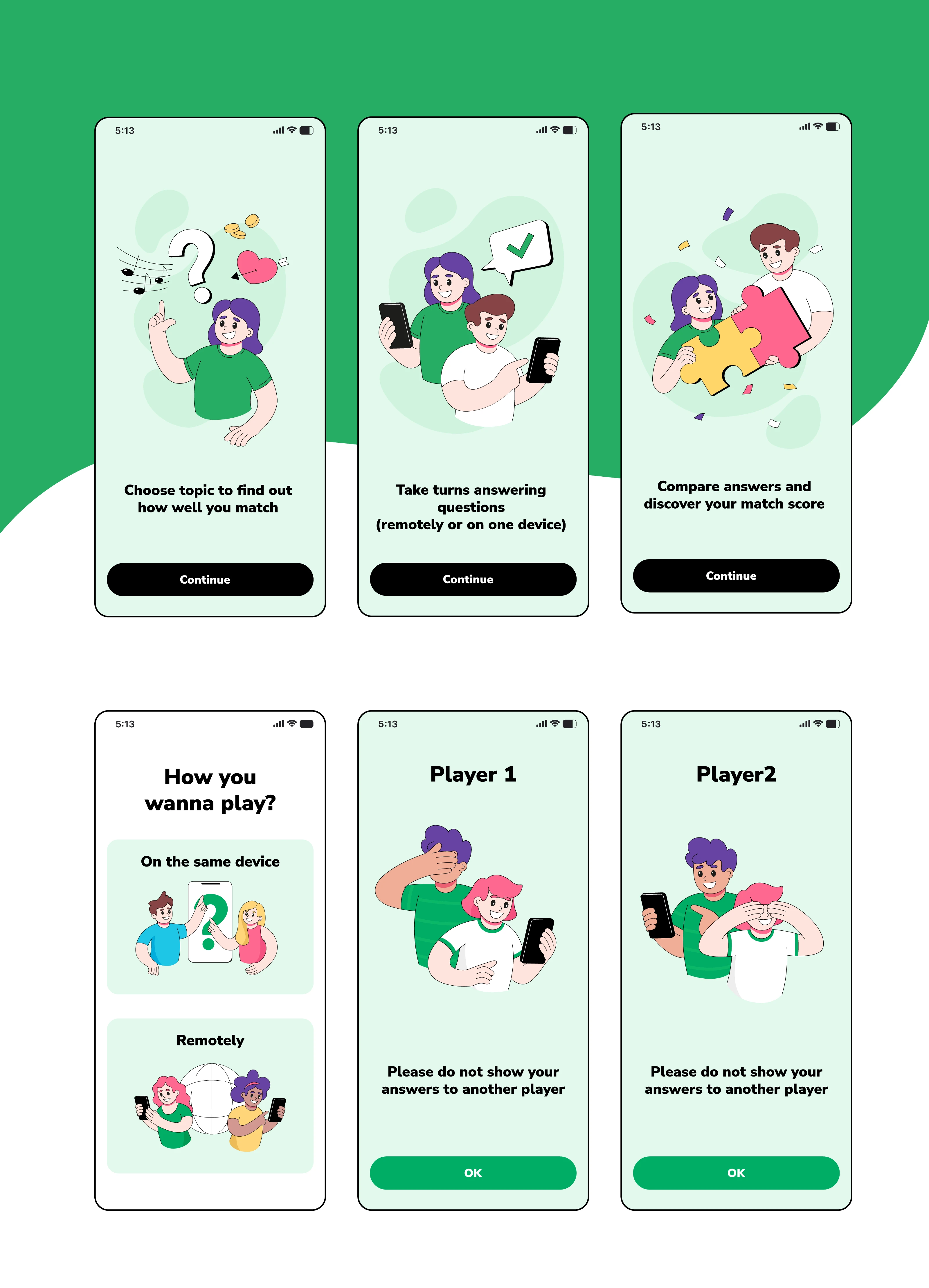 A fun and simple game for couples and friends where two players take turns answering themed questions by choosing one of two options. Can be played remotely or on the same device and shows compatibility score at the end.