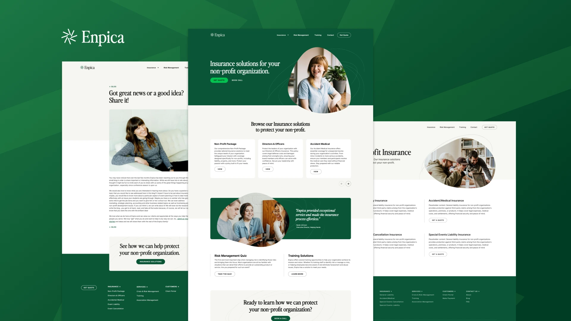 A professional yet warm identity for the non-profit insurance brand Enpica, featuring a guiding starburst, serif wordmark, and stable green palette.