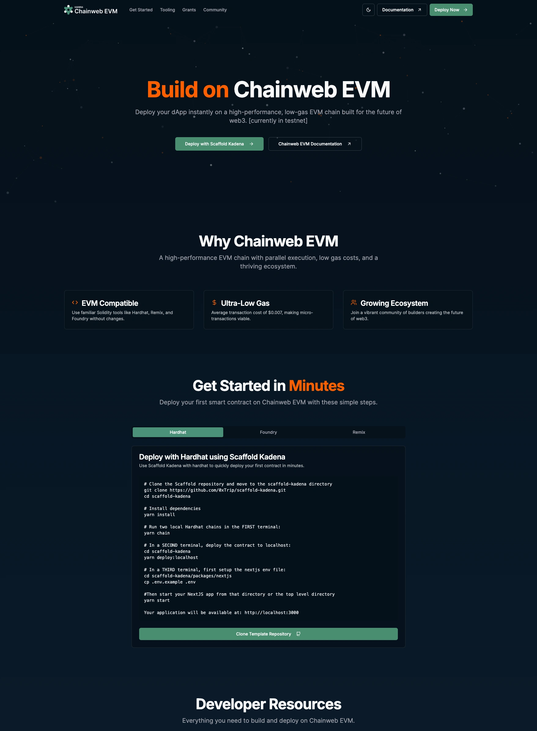 Built Kadena’s Chainweb EVM Developer Portal from scratch to reduce time-to-first-deploy and provide a coherent entry point for builders. Owned information architecture, onboarding flows, and the ‘happy path’ for getting started by balancing developer UX with the realities of a rapidly evolving testnet. The portal became the backbone for hackathon enablement, documentation, and ecosystem messaging during our EVM activation phase.