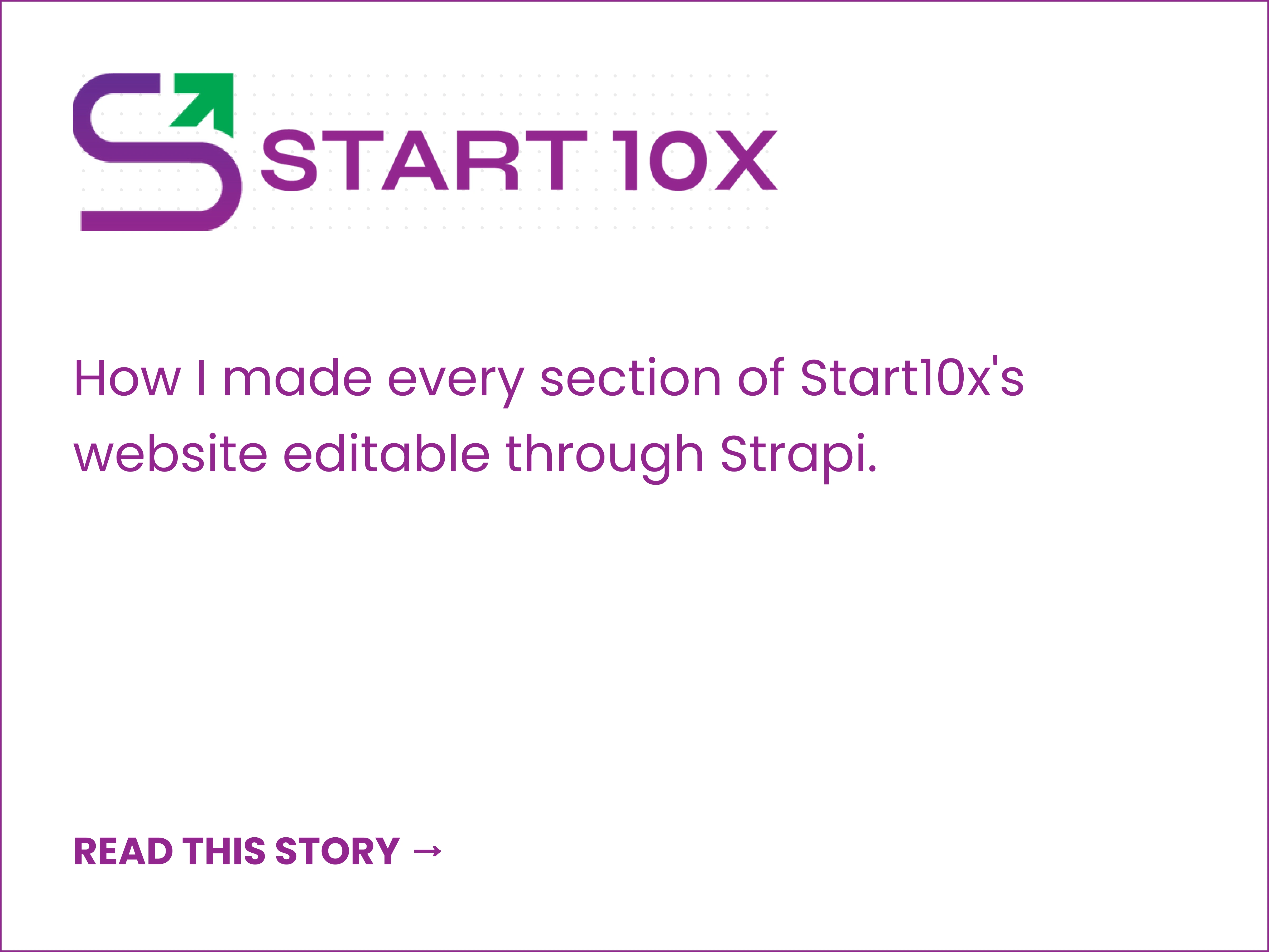 Start10x needed a company website where non-technical team members could update every section without having to call a developer. I built the site with Strapi CMS powering all content, not just the blog.