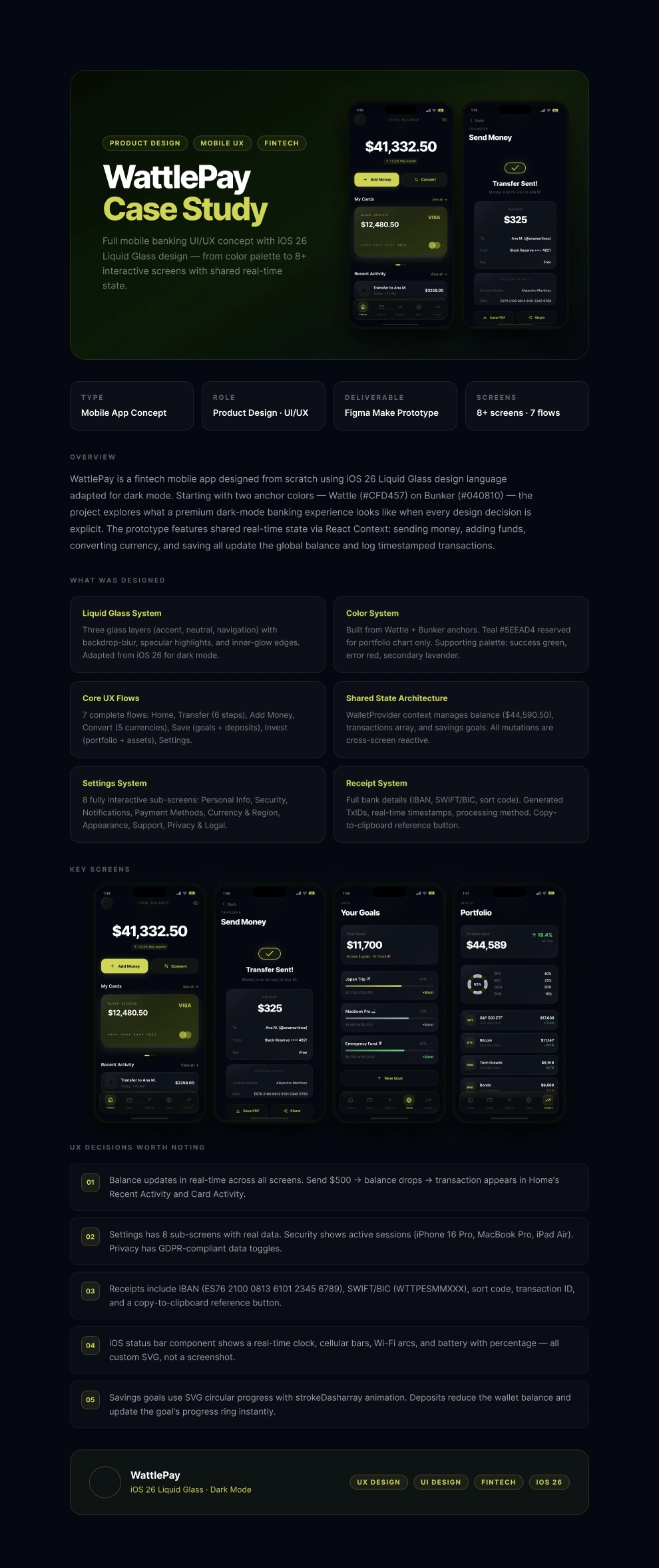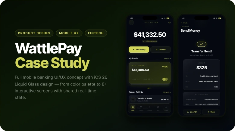 WattlePay is a personal concept project I built to explore what a premium fintech experience could look like when every design decision is intentional — not inherited from a template or a default component library.