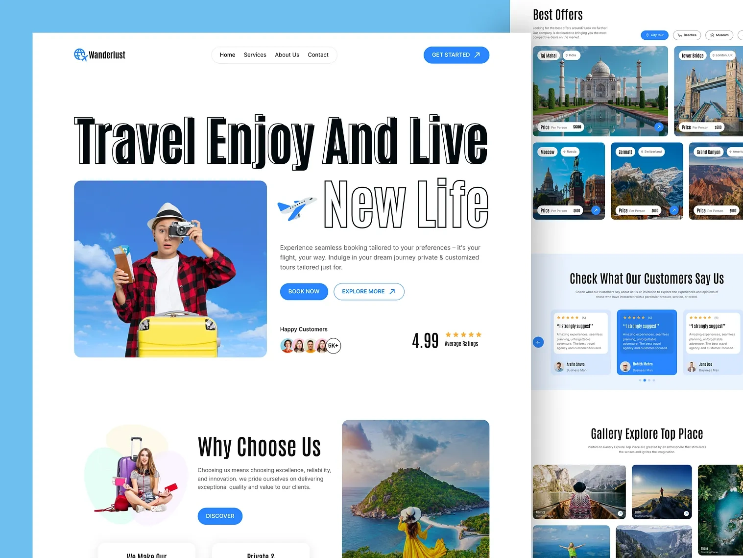 Wanderlust is a captivating travel landing page designed to ignite your wanderlust and inspire your next great adventure. With its immersive visuals, intuitive layout, and traveler-friendly features, Wanderlust invites users to explore exotic destinations, book unforgettable experiences, and plan dream getaways with ease.